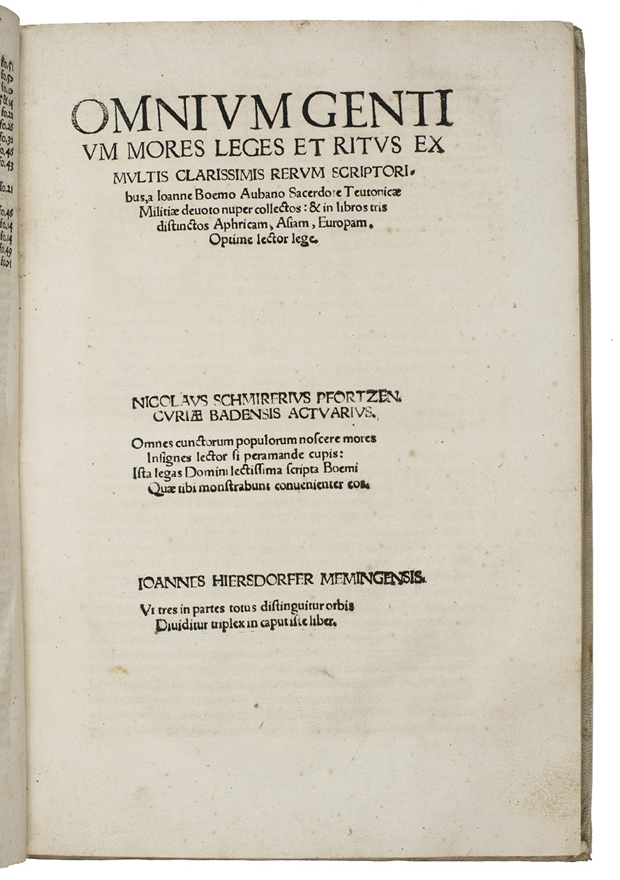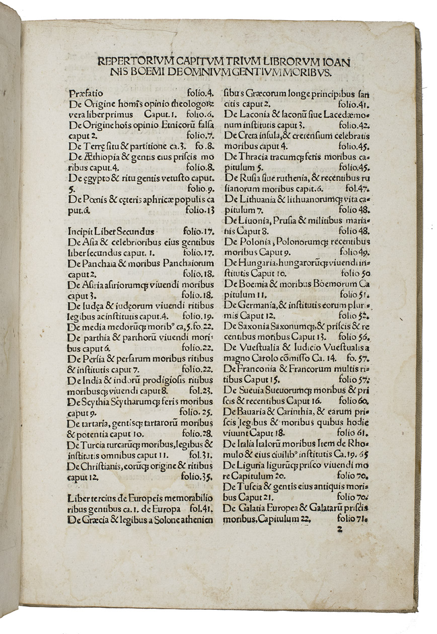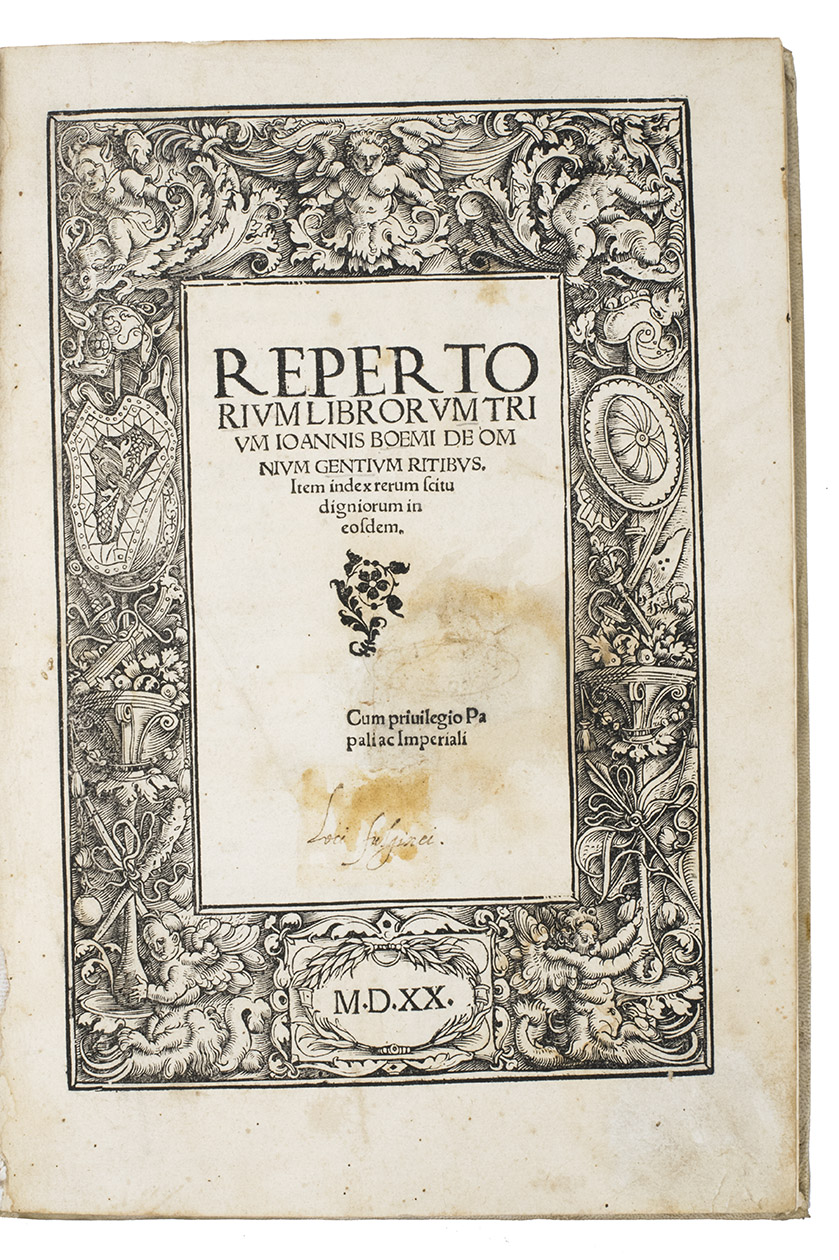 Omnium gentium mores leges et ritus ex multis clarrissimis rerum scriptoribus ... nuper collecti: & in libros tris distinctos Aphricam, Asiam, Europam, optime lector lege. [Half-title:] Repertorium librorum trium Ioannis Boemi de omnium gentium ritibus. Item index rerum scitu digniorum in eosdem. Cum privilegio Papali ac Imperiali M.D.XX.