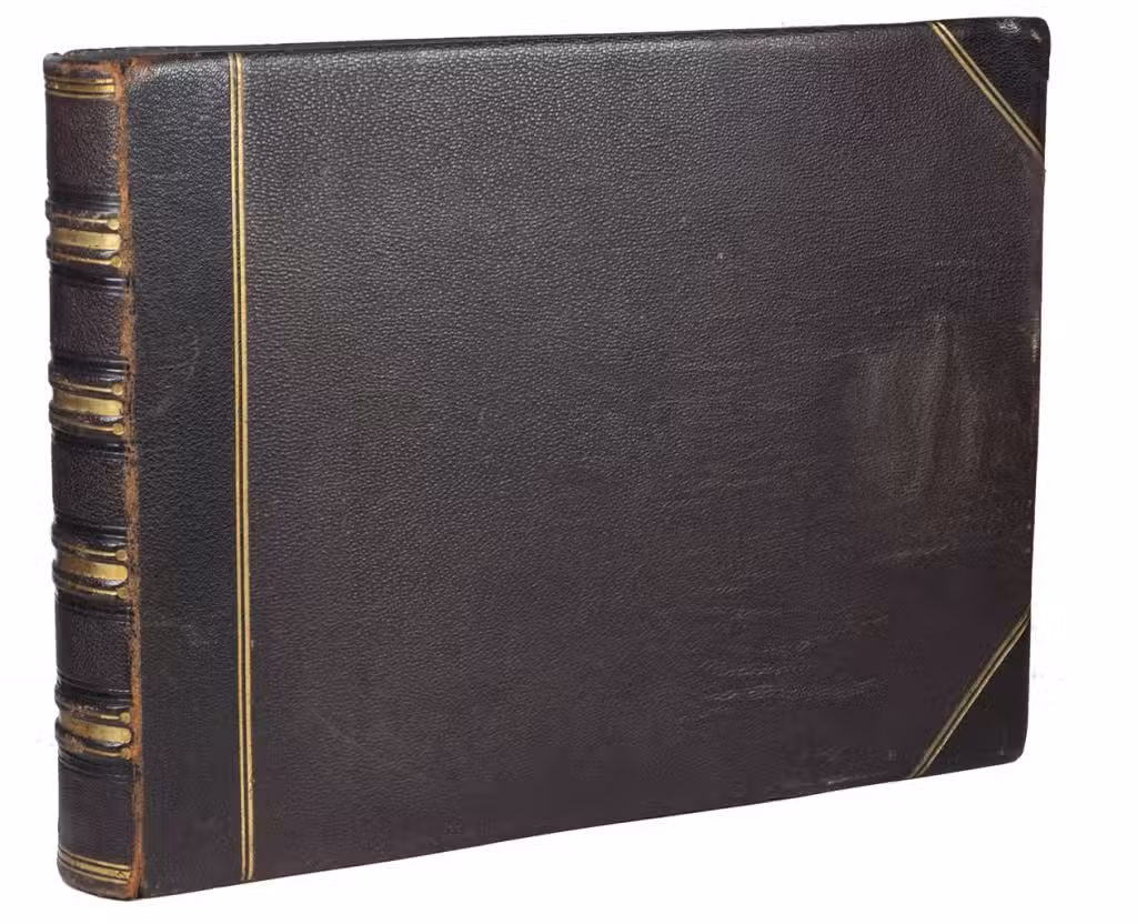 With the captions of several of the photographs transcribed in pencil or ink. Binding worn at the extremities. Paperboard album leaves with a few spots and several tears, most of the header corners damaged and several repaired. Photographs in excellent condition, a few with some spots and light damage at the sides.