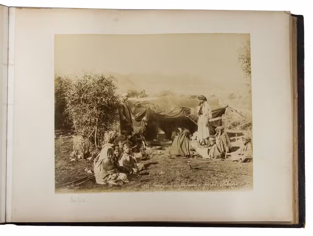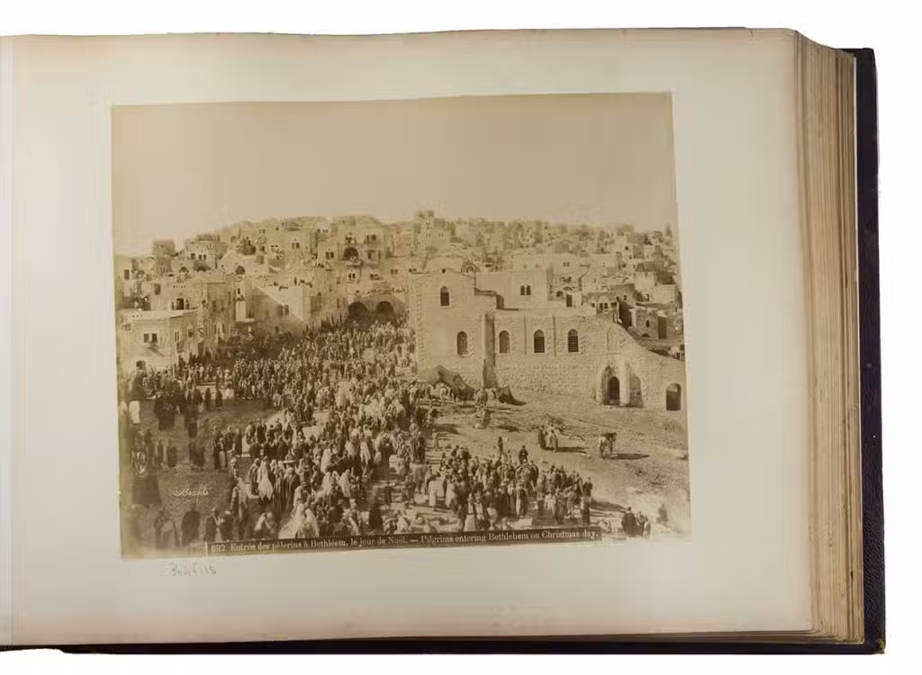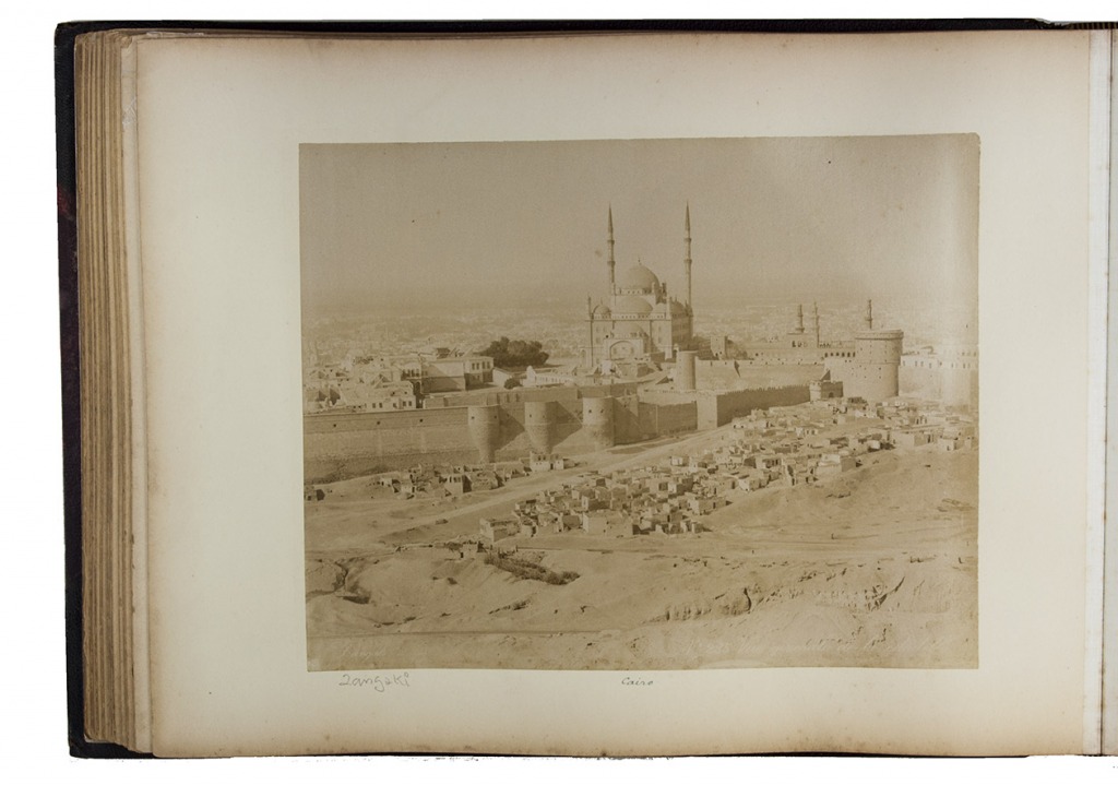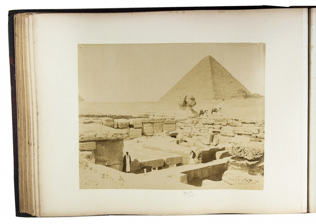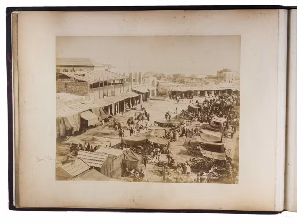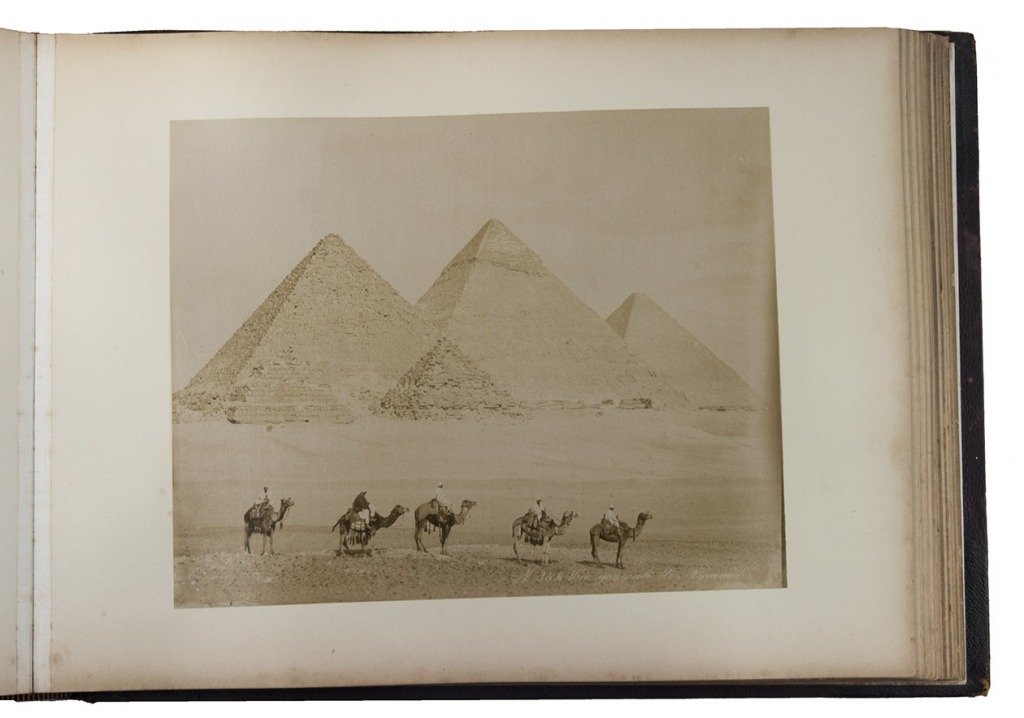 The largest part of the album contains photographs of Egypt and Jerusalem. After a view with numerous watermelons at the market of Jaffa, it shows views of Ramlah, Bethany (al-Azariya), Khan al-Ahmar ("scene of the good Samaritan episode") and the convent Mar Saba. Before the views of Bethlehem on Christmas day, are two photographs showing local inhabitants: a single rider with his horse before the river Jordan and a Bedouin camp near Jericho. All the major sites of Jerusalem are present, including the Mount of Olives, Wailing Wall, Solomon's Stables and the Jaffa Gate with more watermelons. A misplaced image of the coppersmiths of Cairo appears before images of the Al-Aqsa Mosque and the Church of the Holy Sepulchre. The images of Egypt mostly show the river Nile and the Pyramids, but also a busy market in the garden of Gezireh, the interior of the Mosque of Muhammad Ali and a mummy. Typical images of Athens and Venice follow, with the final image showing a gentleman and two ladies feeding the pigeons on the Piazza San Marco.