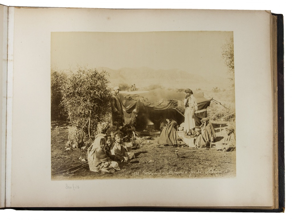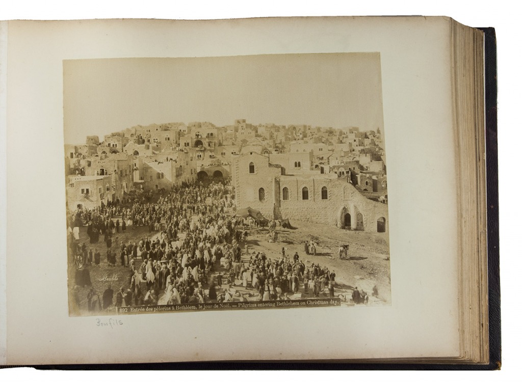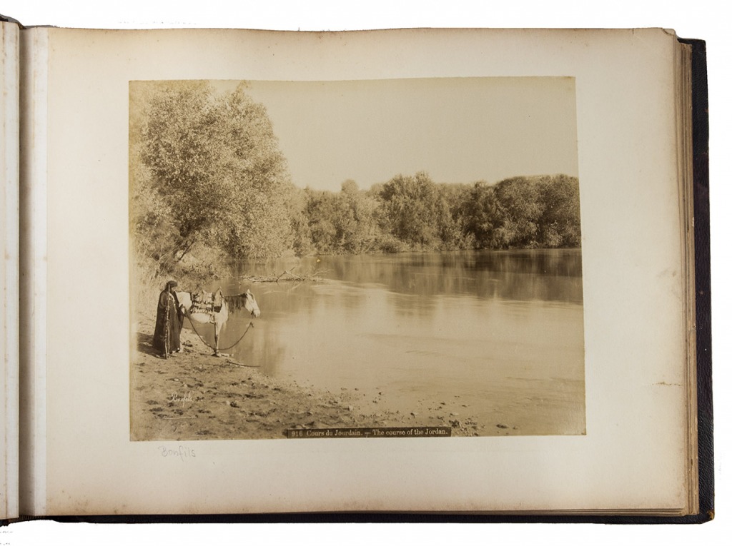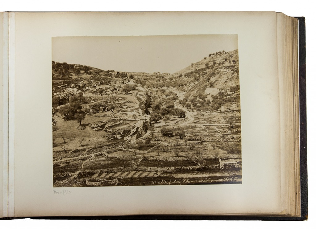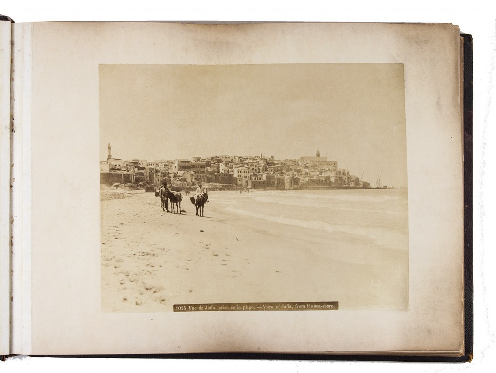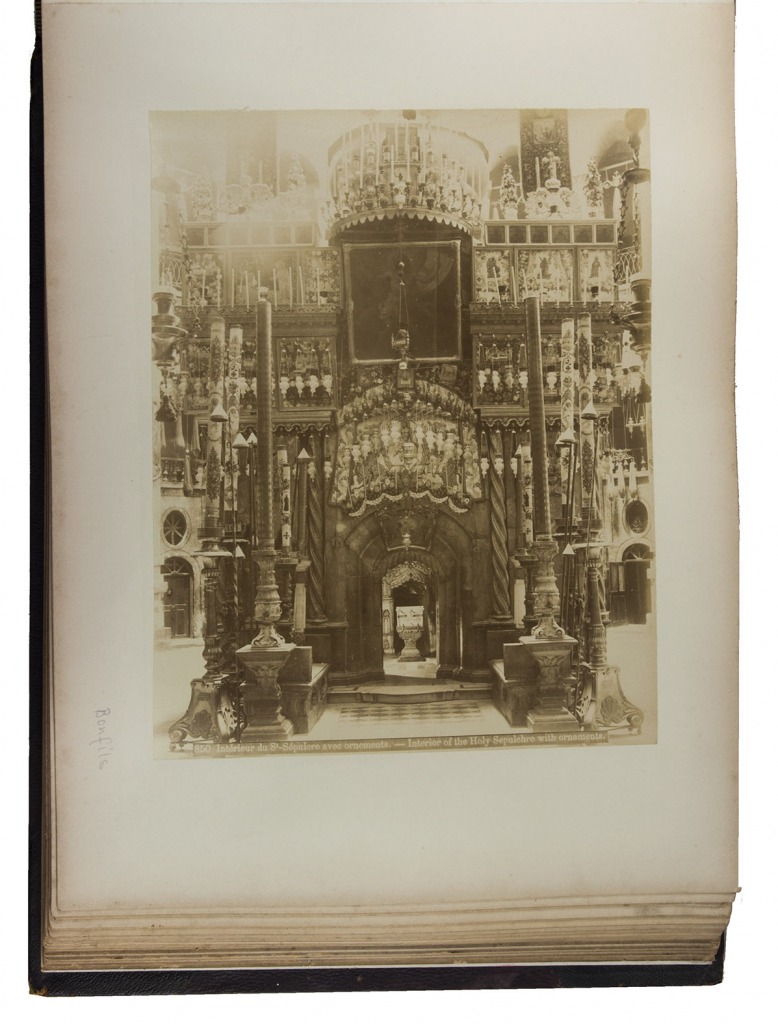 [Palestine, Cairo, Athens, Venice, ca. 1890]. Oblong album (41.5 x 31 cm) containing 62 albumen prints, mostly 23 x 28 cm, with 2 smaller prints of ca. 16 x 28 and 5 large prints of 35.5 x 27 cm. Most of the photographs are numbered and captioned in French, and sometimes also in English, on the negative. Contemporary brown half morocco. [59], [11 blank] pp.