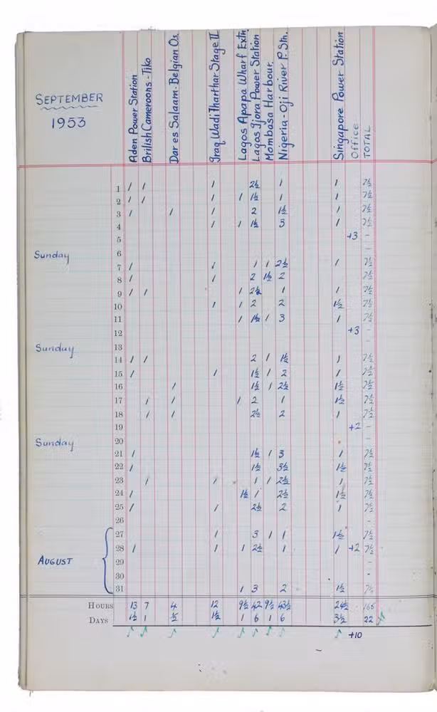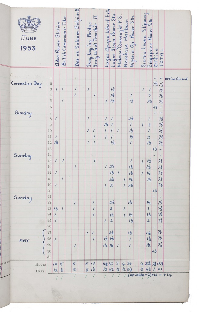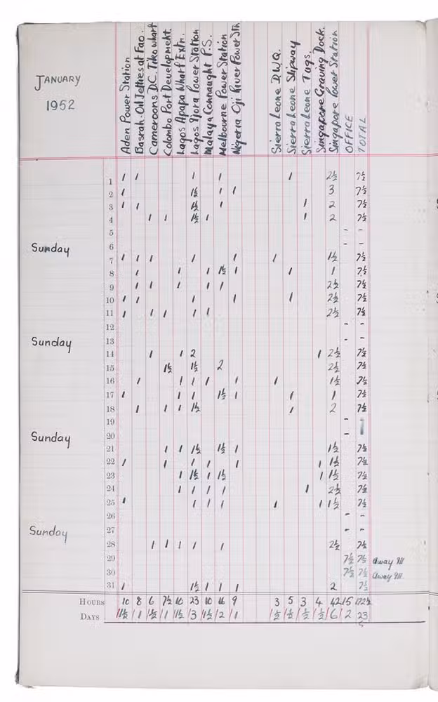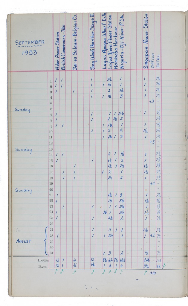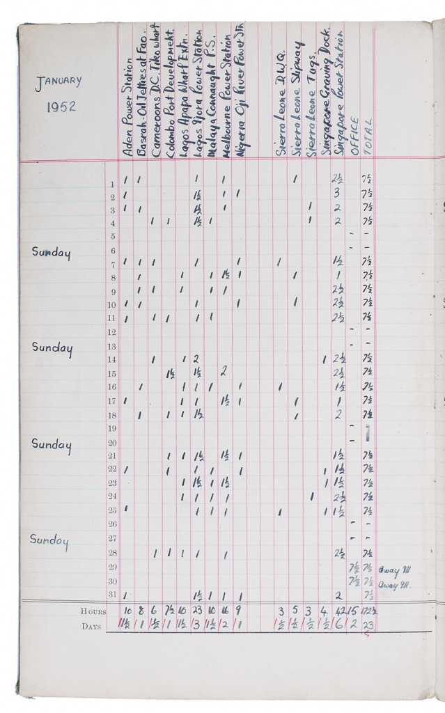 Manuscript ledger recording the work hours of F.A. Boulten, from 1952 to 1955. Although Boulten's specific field of work, or even the company he worked for, is not stated, he worked on engineering and infrastructure projects in the British colonies, the Commonwealth and other states in Britain's sphere of influence (most notably Iraq). Each day he devoted 1 to 3.5 hours to multiple power plants, oil terminals, bridges, dams and harbours. As Boulten worked on most of the projects before construction had started, it is probable that his firm was related to the initial financing of the project. A probable suspect for the latter is the Colonial Development Corporation, founded by Great-Britain after World War II for the economic development of its colonial territories. The CDC provided loans for many of the projects mentioned in the ledger. These projects include: the power stations of Aden, Melbourne and Singapore, the oil jetties at Al-Faw near Basra, the harbours of Sierra Leone, Lagos and Mombasa and in Iraq the Adhamiyah Bridge, Darbandikha Dam, Taq Taq Bridge, Lake Tharthar and the Mujarah Canal.