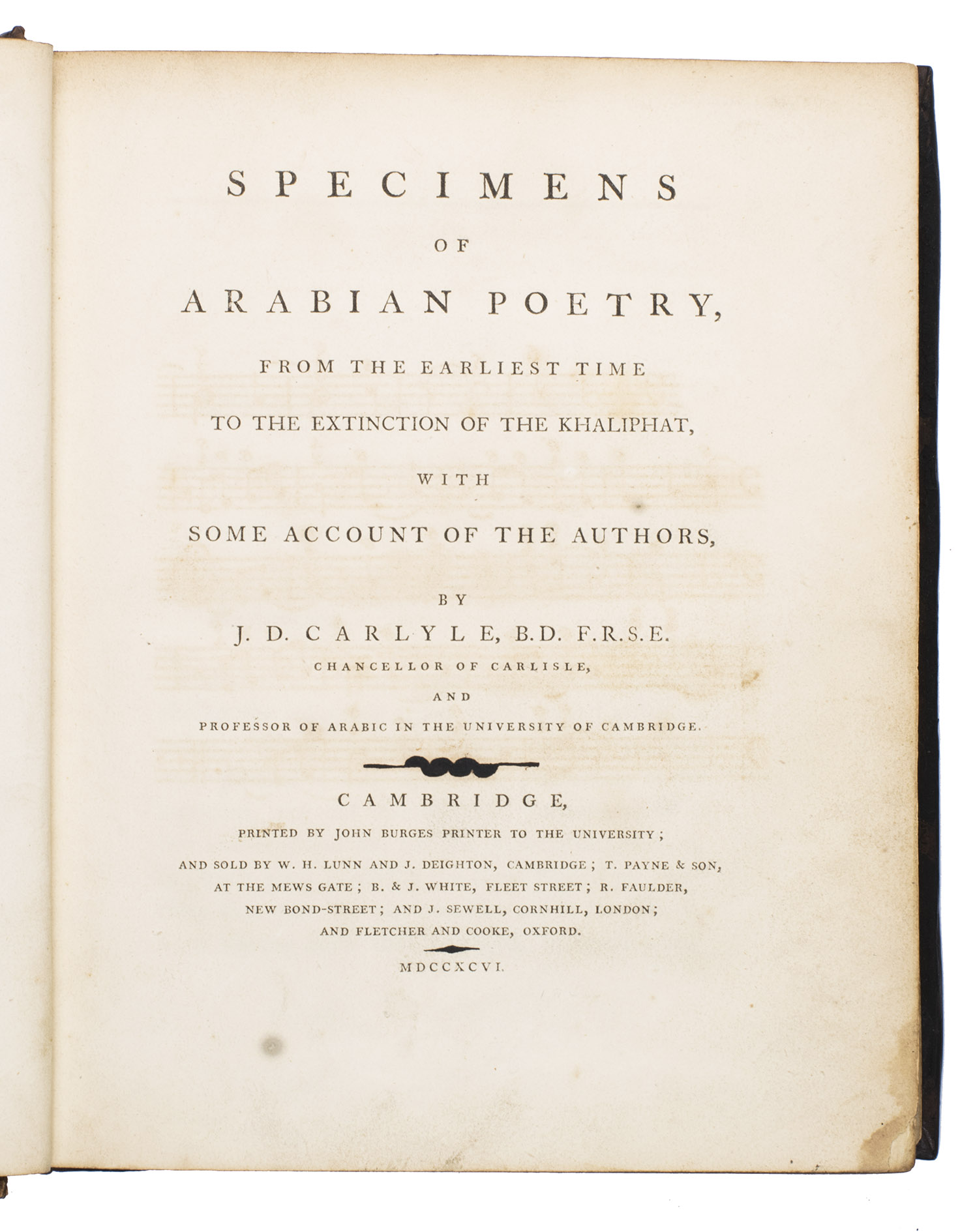 First edition of this beautiful example of Orientalist scholarship, presenting sixty early Arabic poems in their original language with English translations. This work by Orientalist Joseph Dacre Carlyle (1758-1804) enabled the English to discover the beauty of Arabic literature. The poems, which cover a wide range of topics, offer a glimpse into the rich cultural heritage of the Arab world. Carlyle was the first to translate these poems into English. His translations became quite well-known and continued to be used in other works until at least the late 19th century.