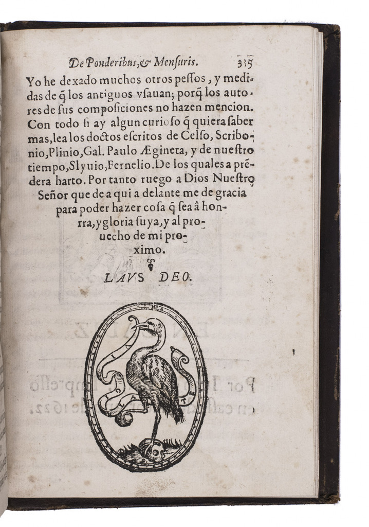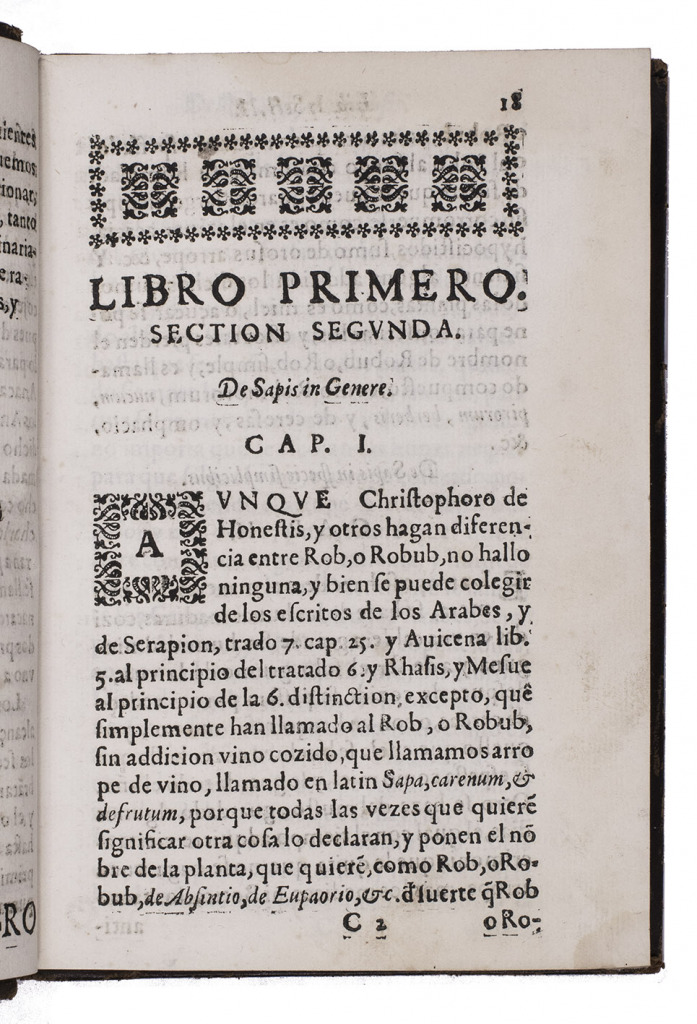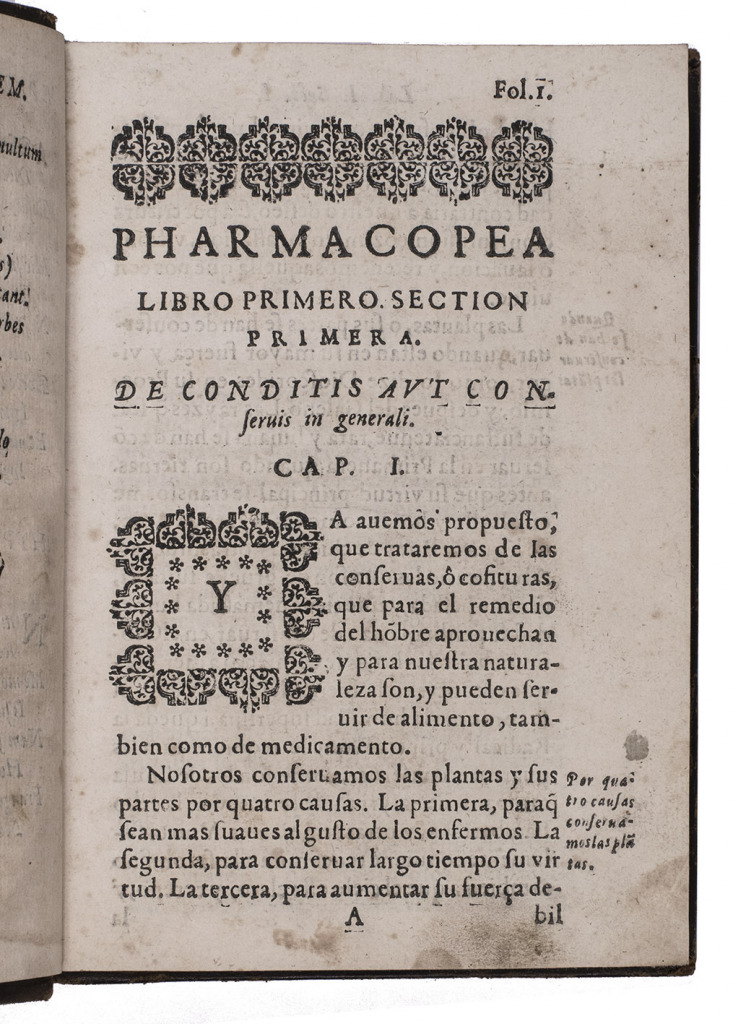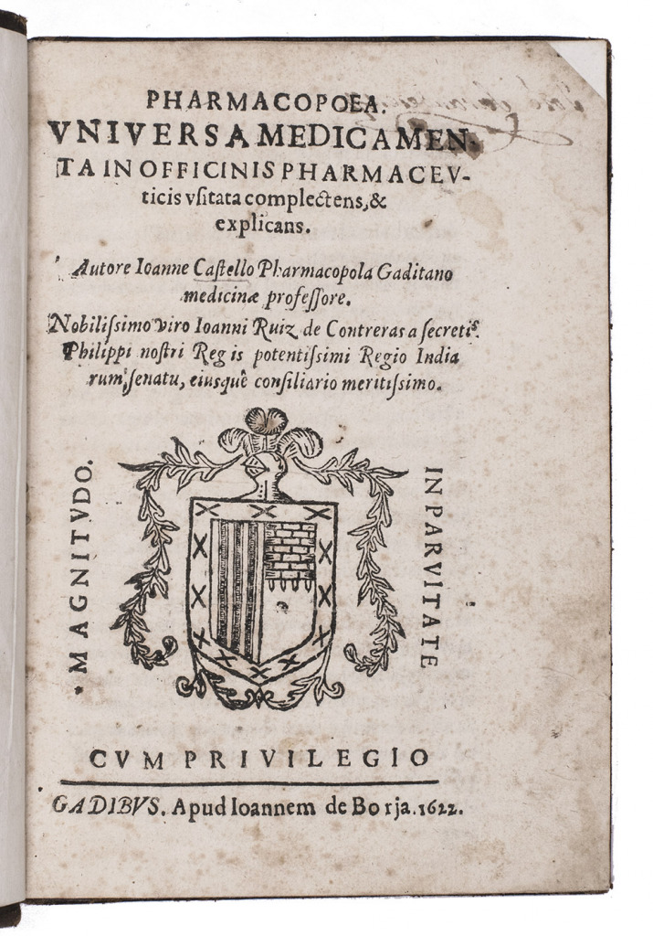 Rare first and only early edition, with the text in Spanish but the lists of ingredients in Latin, of by far the most extensive and most detailed early medicinal recipe book in Spanish, with recipes for about 300 medicines arranged in 9 sections for internal medicines followed by 3 sections for external medicines. Each recipe begins with a list of ingredients followed by instructions for the preparation of the medicine and information about its uses and dosage under various circumstances. Liber 1, section V is devoted to opium. The book closes with an appendix on weights and measures and an extensive index. Its only real predecessor, Luis de Oviedo's 1581 Methodo de la coleccion, y reposicion de las medicinas, offers only 49 recipes and gives no clear lists of ingredients.