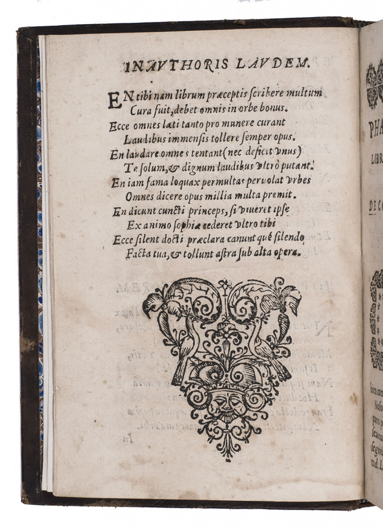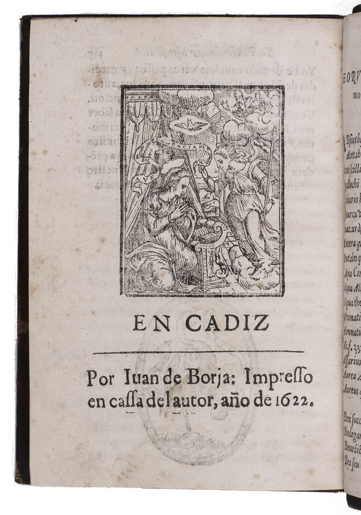 Cádiz, Juan de Borja, 1622. 4to. With a helmed, crested and mantled woodcut Contreras coat of arms of the dedicatee on the title-page (dexter argent paly of 3 azure, sinister an inverted tower, the whole with a bordure containing 12 Xs) repeated at the end of liber I, woodcut device at the end of the text.Tree-pattern tanned sheepskin (ca. 1830), and the owners initials J.S. (for José Saranderes) in the 5th. [7], “335” [= 332], [6] ll.