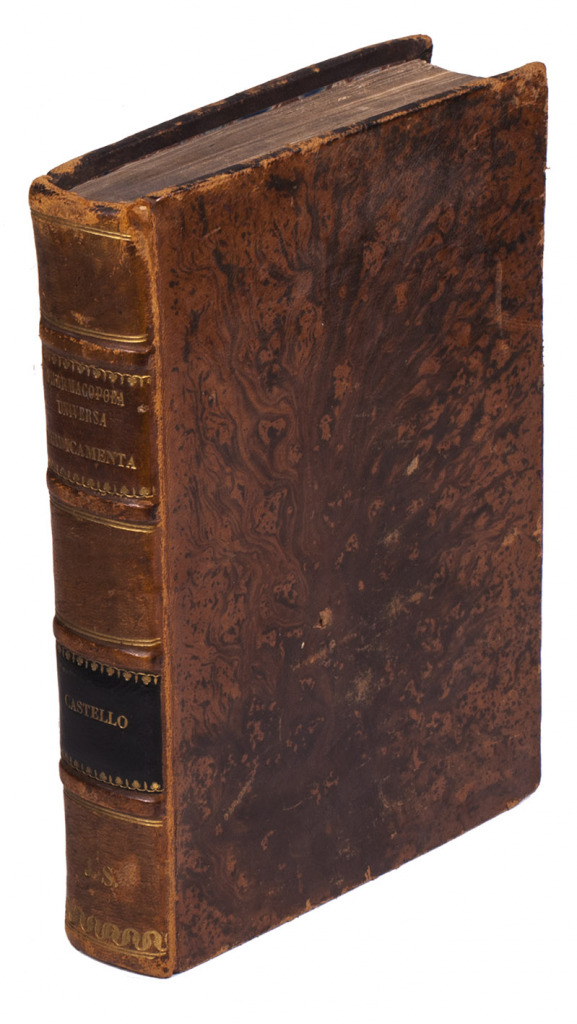 With an owner's inscription of the Madrid pharmacologist José Saranderes, author of a 1837 manuscript on the preparation of opium, on the back of the title-page and his initials J.S. gold-tooled at the foot of the spine. Slightly browned with some foxing, spots and stains, a hole affecting a couple words in Y2 and restored corners in 7 other leaves without loss of text, but still generally in good condition. Binding slightly rubbed but otherwise good. Bibliographia medica Hispanica, vol. 2, 140 (p. 63); R.R, Guerrero, Diccinario... autores farmacéuticos, vol. 1 (1958), pp. 632-633; A. Hernández Morejón, Historia bibliográfica de la medicina Española, vol. 5 (1846), p. 50; Krivatsy 2260 (lacking title-page & 1 text leaf); Palau 47896 & 48131; USTC 5021897; Wellcome I, 1355.