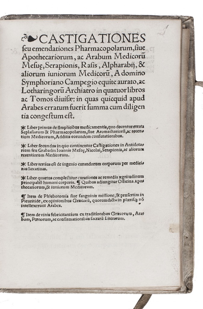 First and only edition of a work on the history of medicine by the French doctor Symphorien Champier (1472-1539). During his career Champier switched several times from being appreciative to critical towards Arab authors. In one of his earlier works, he describes Avicenna (Ibn Sina) as "a man of most outstanding genius and certainly the most distinguished of all" (Siraisi). On the other hand, he later criticised Italian doctors, "who allowed their schools to be occupied by 'Arabs, Persians, Indians and Mahometans'" (Siraisi). In the present work, which he wrote late in his career, he takes a more moderate view, admitting that Arabs indeed made useful contributions to the study of medicine, and calling Avicenna the noblest of them all. The text can be seen as a brief history of medicine, dividing it in three sections: Greek, Latin and Arabic medicine. For the Latin he makes a distinction between Latini, those who follow Galen and Hipprocrates (Boqrat), and barbari, those who set out their own path.