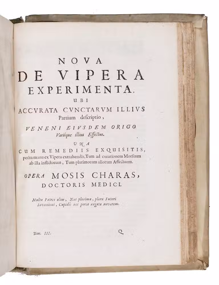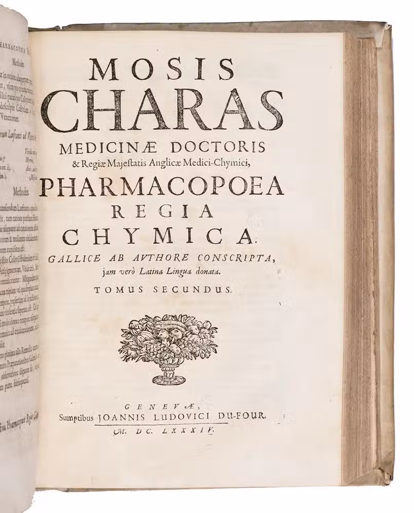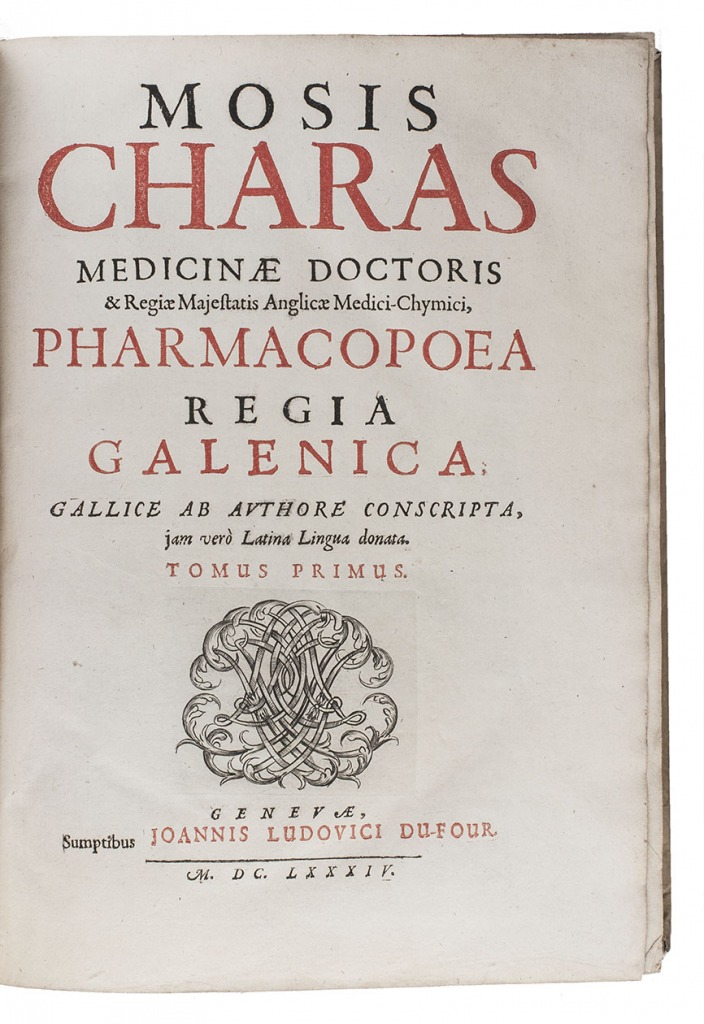 (1) CHARAS, Moyse. Pharmacopoea regia Galenica.(2) CHARAS, Moyse. Pharmacopoea regia chymica.(3) CHARAS, Moyse. Historiam naturalem animalium, plantarum et mineralium, theriacae andromachi compositionem ingredientium, cum experiments circa viperam