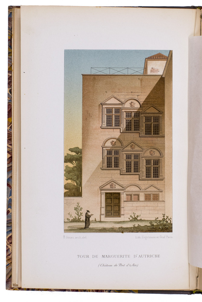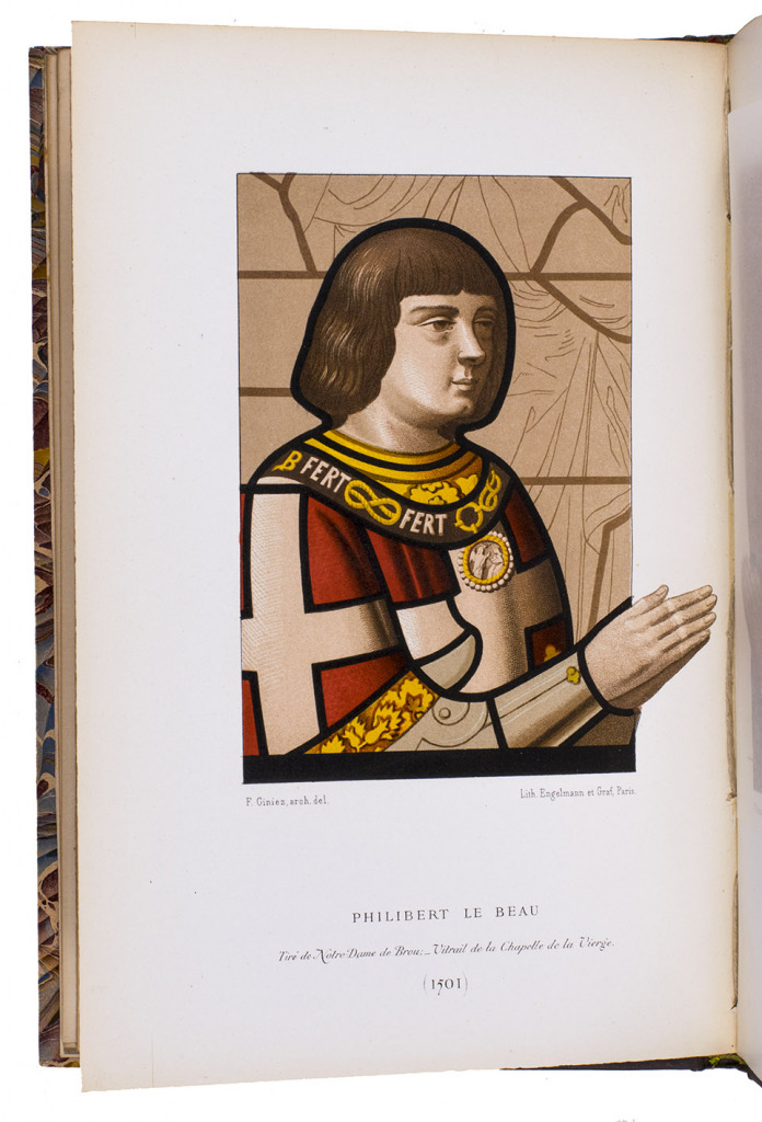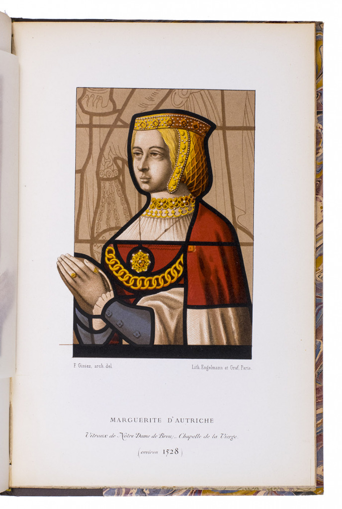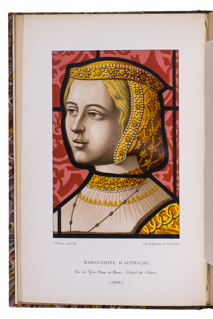 Lyon, printed by Louis Perrin [for the compiler], 1860. 8vo (24 x 16 cm). With the title-page in red and black with the coat of arms of the compiler, 4 chromolithographed plates showing 3 stained-glass portraits and an architectural elevation, all drawn by P. Giniz and lithographed in Paris by Engelmann & Graf, 2 double-page etched views drawn by J. de Montchalin & Le Bon de Maupetit and engraved by J. M. Fugère, and a lithographic facsimile of a letter written and signed by Margaret of Austria. Half grey-brown cloth (ca. 1900?), top edge gilt, with the publisher's printed paper wrappers bound in. VI, 22 pp. plus plates.