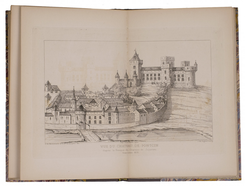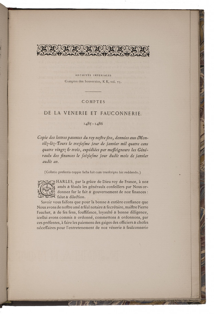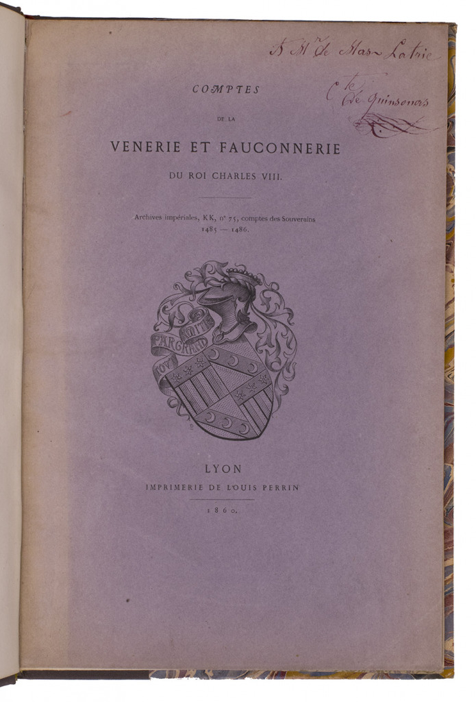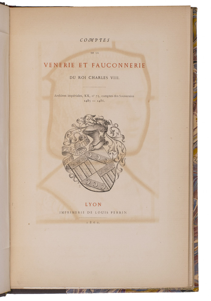 A remarkable bibliophile edition (limited to 50 copies) of financial accounts and other documents concerning hunting and falconry from the archives of King Charles VIII of France in the years 1485 to 1486. These documents are essential primary sources for the history of hunting and falconry, giving detailed and very specific data to throw light on falconry ca. 1485/86. The text was prepared in conjunction with a publication about Margaret of Austria (1480-1530), Duchess of Savoy, and Quinsonas (1818-1901) wrote a brief introductory chapter to the present book, "Documents pour servir a l'histoire de Marguerite d'Autriche". The chromolithographs show details from two stained-glass portraits of her, one of her husband Philibert and a view of her "tower" in his chateau in Pont d'Ain. The etchings show Pont d'Ain and Louis XIII's chateau at Poncin. Although the title-page names no compiler and the imprint names only the printer, Quinsonas's arms appear on the title-page and front wrapper. He was clearly the motive force behind the publication, using the services of the printer Louis Perrin, who pioneered historically allusive book design.