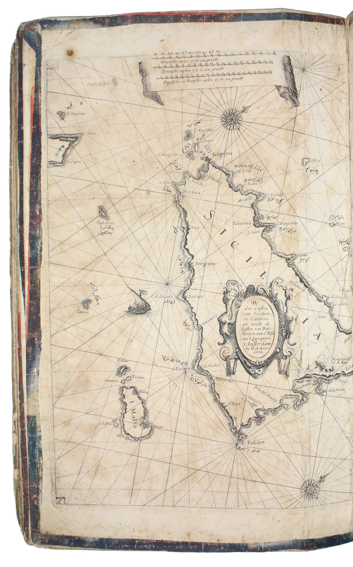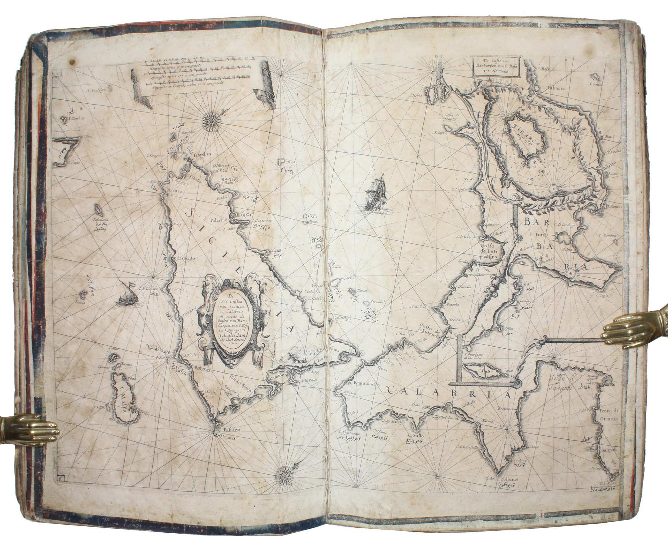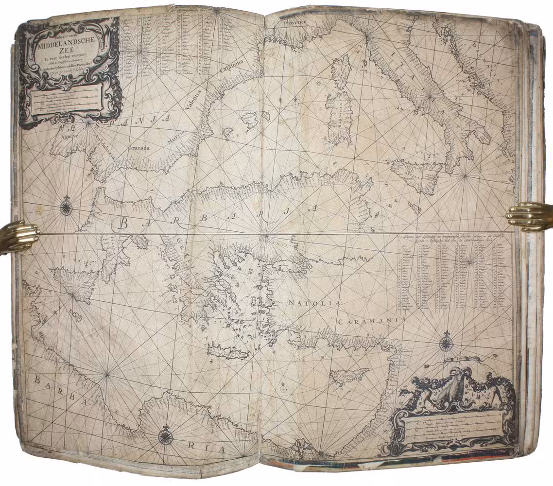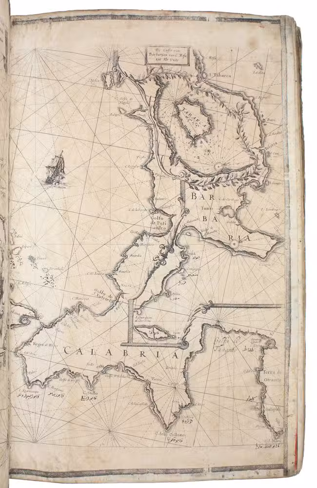 Unusual working copy of Coloms rare pilot, owned by an Ottoman Turkish mariner with his Osmanli inscriptions transliterating the location names throughout. Coloms charts cover the Straits of Gibraltar, the Barbary Coast, Mallorca, the coastline around Barcelona, Nice, Corsica, Sardinia, Southern Italy, Sicily, and Croatia. Koeman highlights the rarity of all of Coloms pilot books and notes that despite "thousands of copies [having been] circulated [...], only a score have survived".