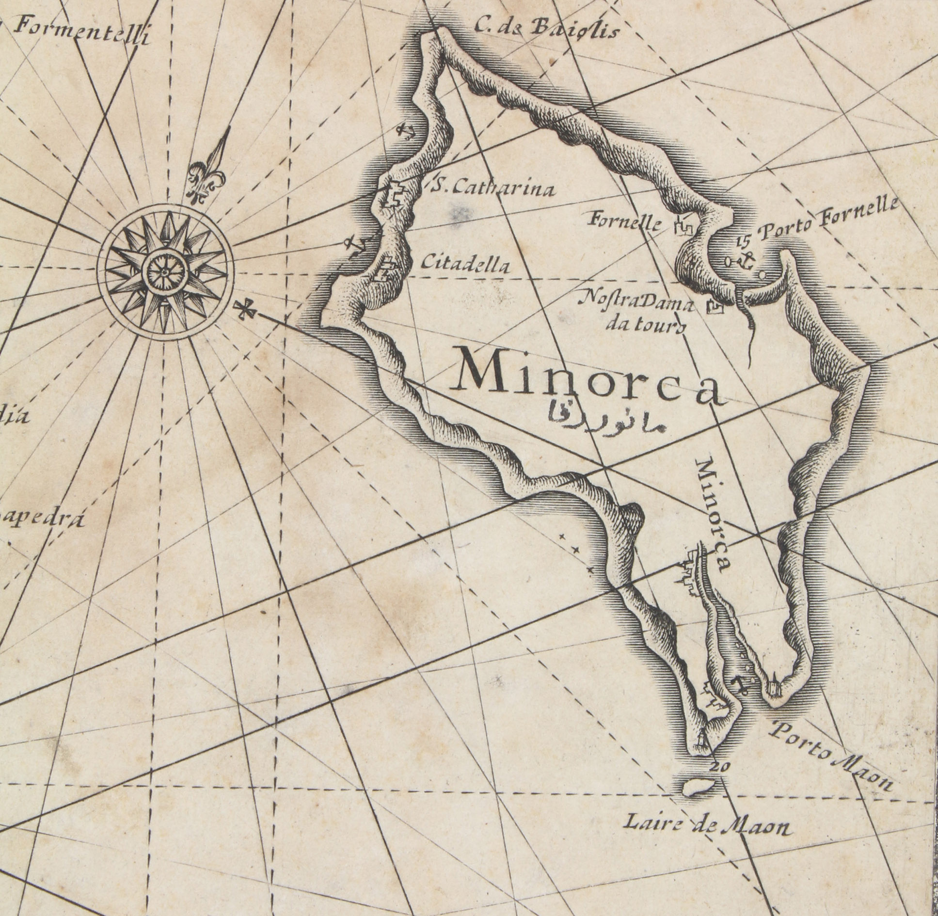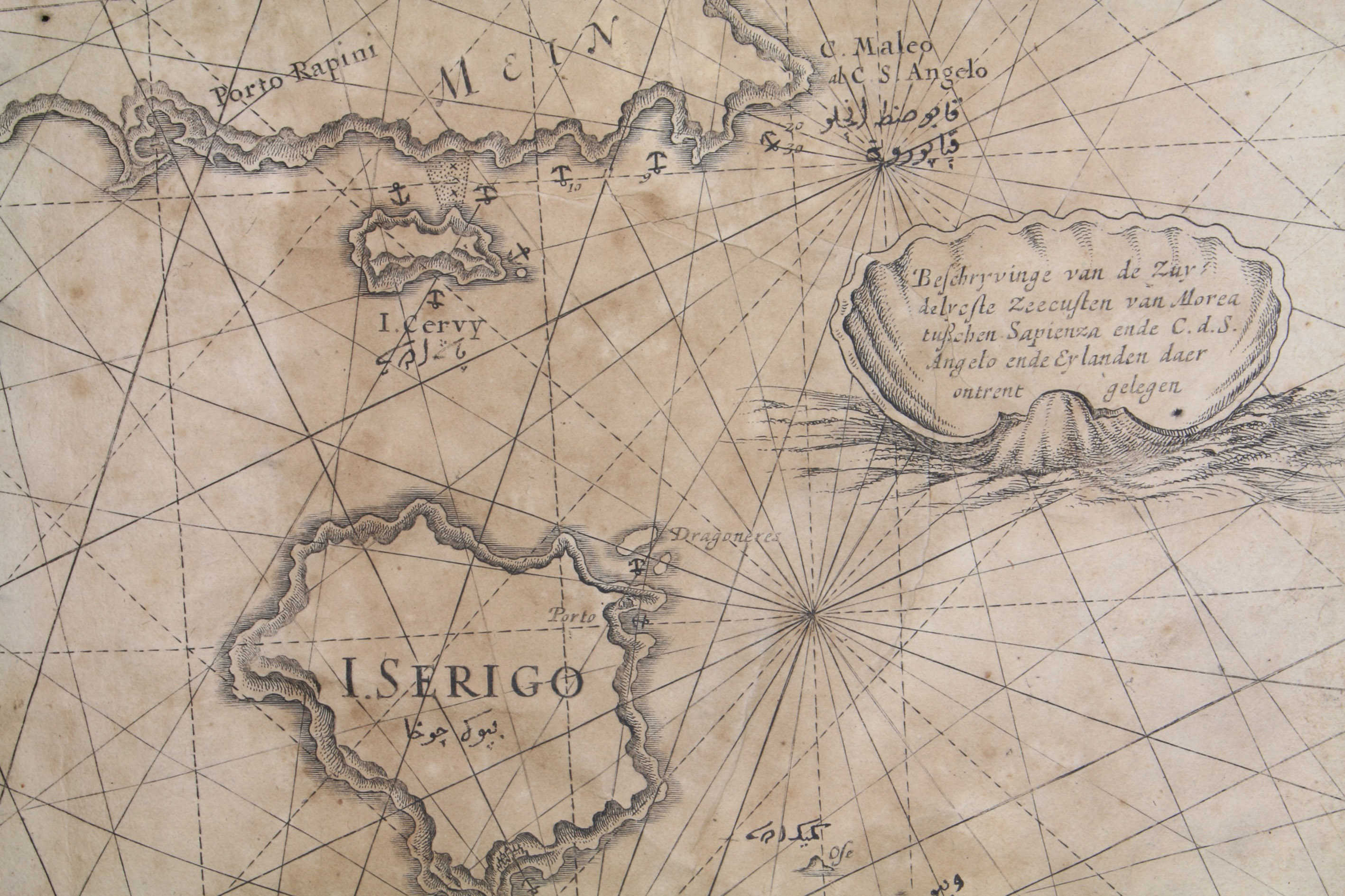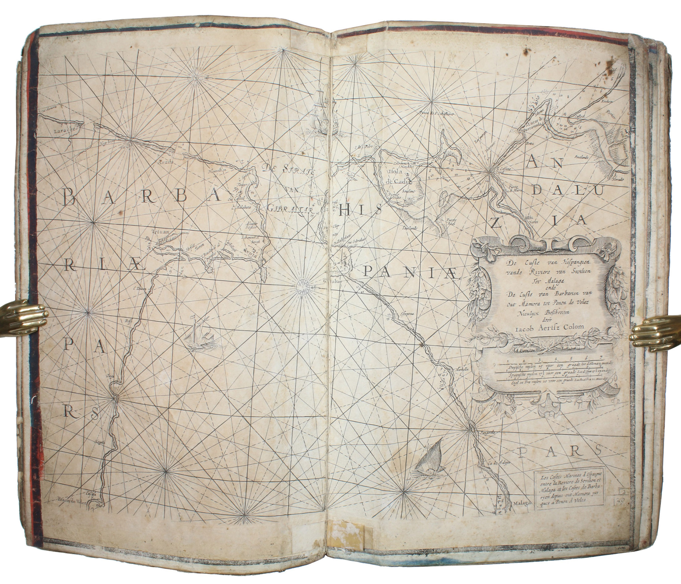 Unusual working copy of Coloms rare pilot, owned by an Ottoman Turkish mariner with his Osmanli inscriptions transliterating the location names throughout. Coloms charts cover the Straits of Gibraltar, the Barbary Coast, Mallorca, the coastline around Barcelona, Nice, Corsica, Sardinia, Southern Italy, Sicily, and Croatia. Koeman highlights the rarity of all of Coloms pilot books and notes that despite "thousands of copies [having been] circulated [...], only a score have survived".