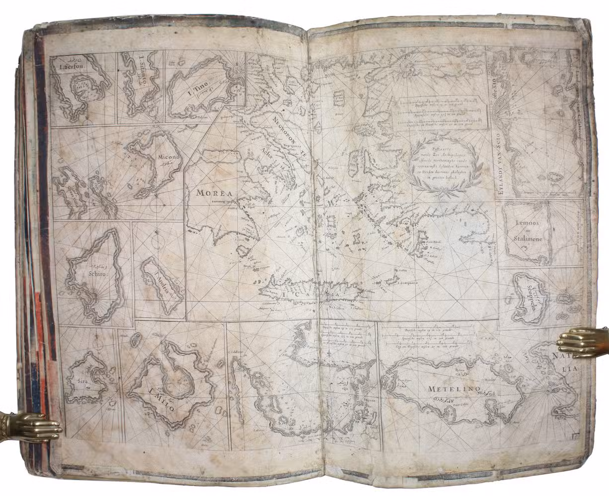 [Amsterdam, ca. 1670]. Folio (29 x 45 cm). With 9 double-page engraved charts only, each sheet ca. 44 × 55 cm, each mounted on stiff paper with maps back-to-back, with thick red and black ink borderlines. 8 of 9 maps are by Colom, numbered 2-9 in the plates from; plate 1 has been replaced with Johannes de Rams map of the Mediterranean: "Paskaart vande Middelandsche Zee In twee deelen vertoont". Contemporary stiff paper wrappers, with a manuscript label pasted upside down on the back wrapper, reading: "Carta Marinaresca del Mar Mediterraneo".