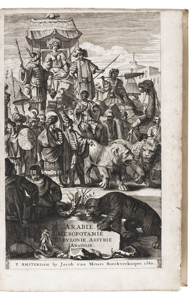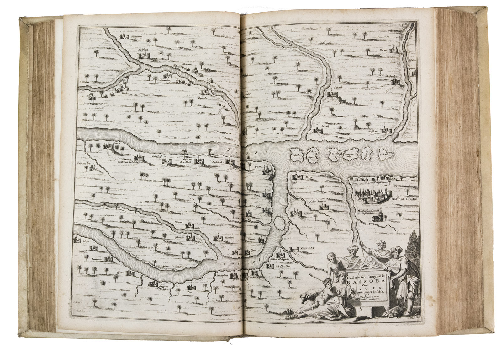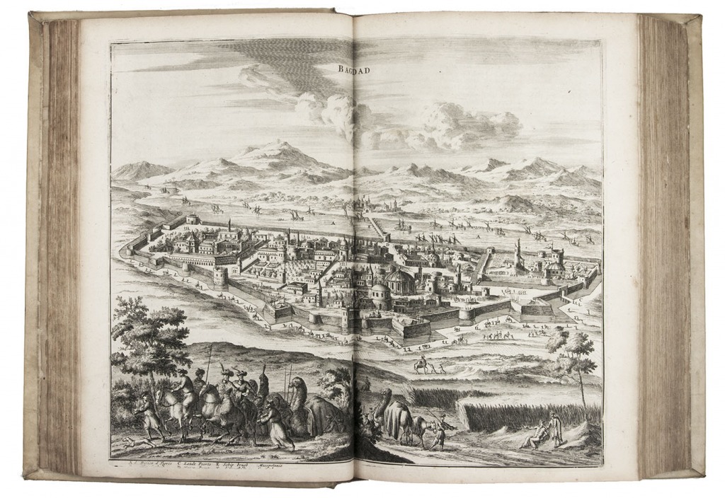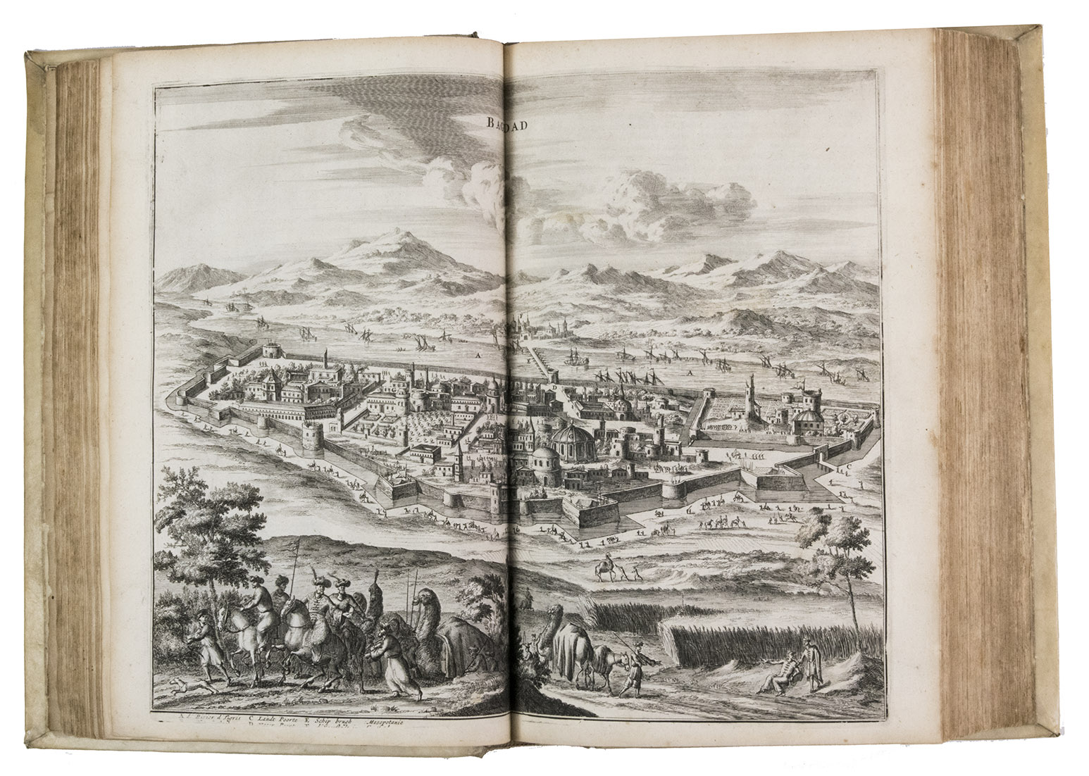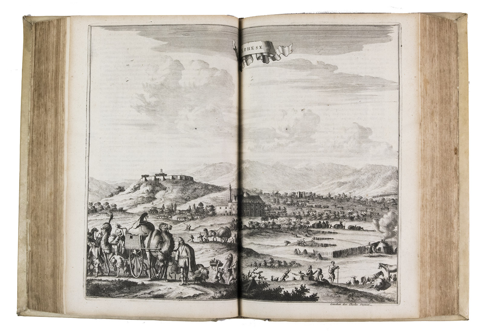 Amsterdam, Jacob van Meurs, 1680. Folio. With engraved frontispiece, 3 double-page maps (of Basra and surroundings, Anatolia and the Arabian Peninsula), 12 double-page or folding views (partly drawn by Charles Vasteau). Near contemporary blind-stamped vellum. [8], 357, [3], 324, [4] pp.