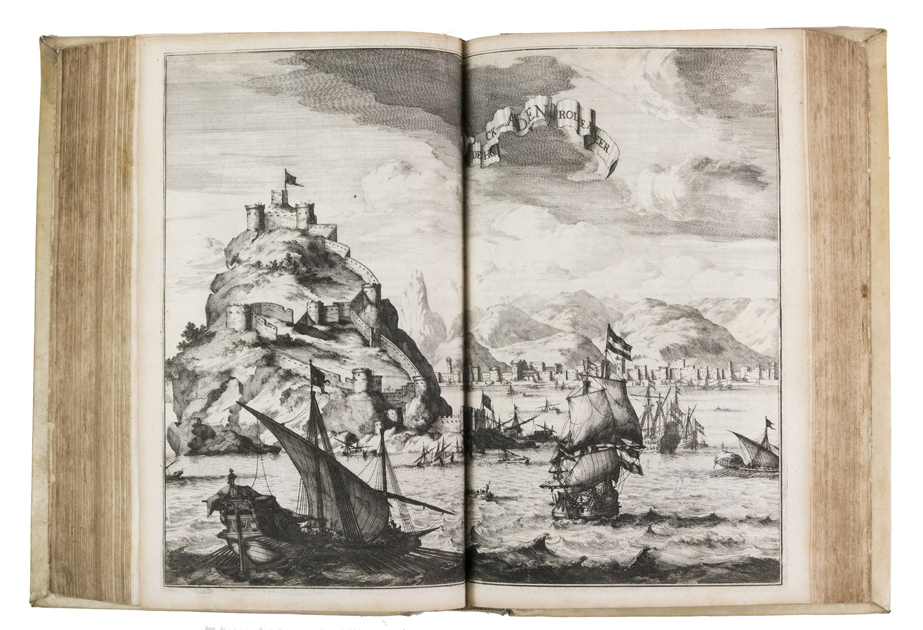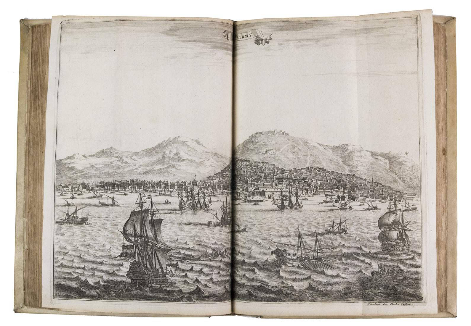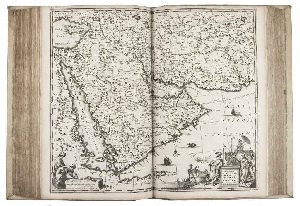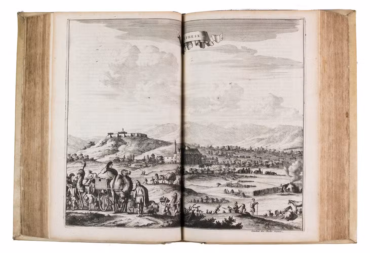 Amsterdam, Jacob van Meurs, 1680. Folio. With engraved frontispiece, 3 double-page maps (of Basra and surroundings, Anatolia and the Arabian Peninsula), 12 double-page or folding views (partly drawn by Charles Vasteau). Near contemporary blind-stamped vellum. [8], 357, [3], 324, [4] pp.