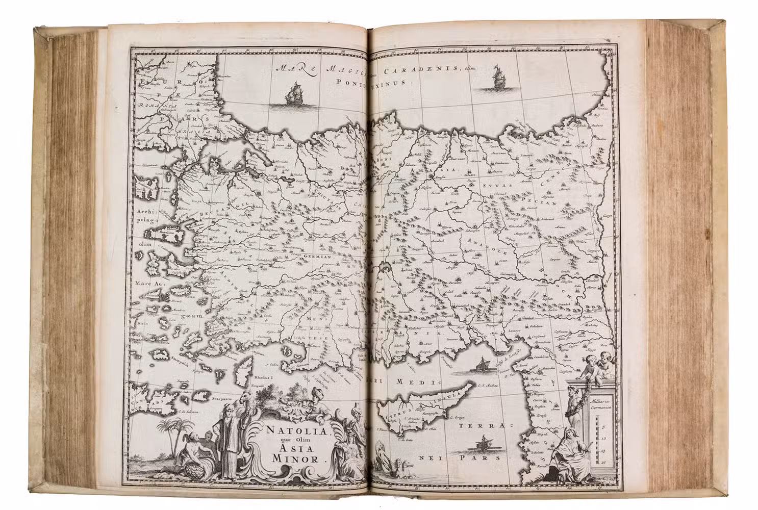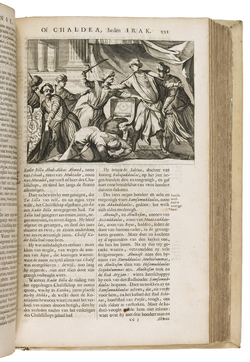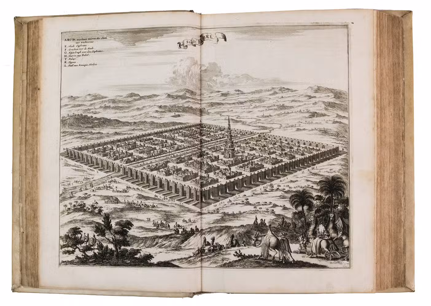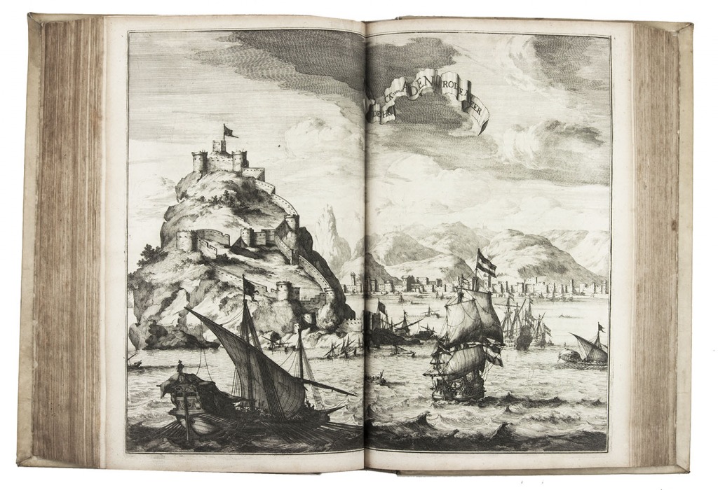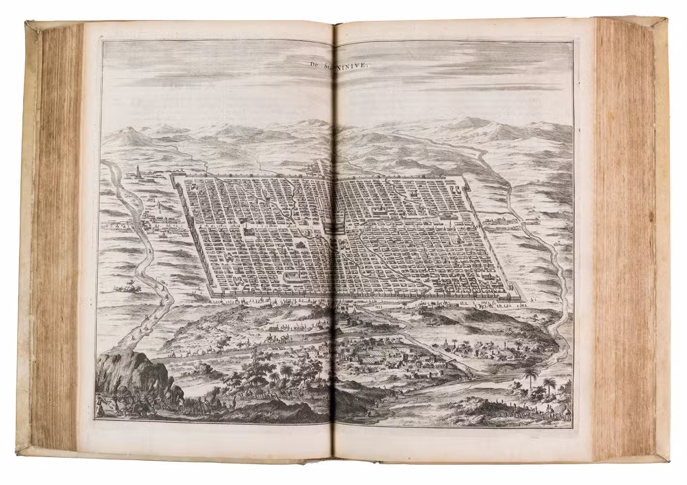 Amsterdam, Jacob van Meurs, 1680. Folio. With engraved frontispiece, 3 double-page maps (of Basra and surroundings, Anatolia and the Arabian Peninsula), 12 double-page or folding views (partly drawn by Charles Vasteau). Near contemporary blind-stamped vellum. [8], 357, [3], 324, [4] pp.
