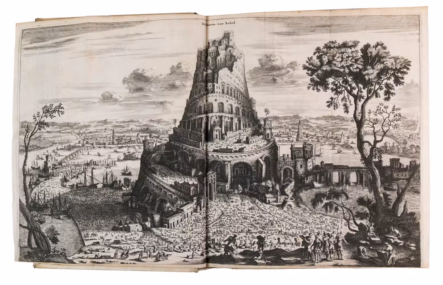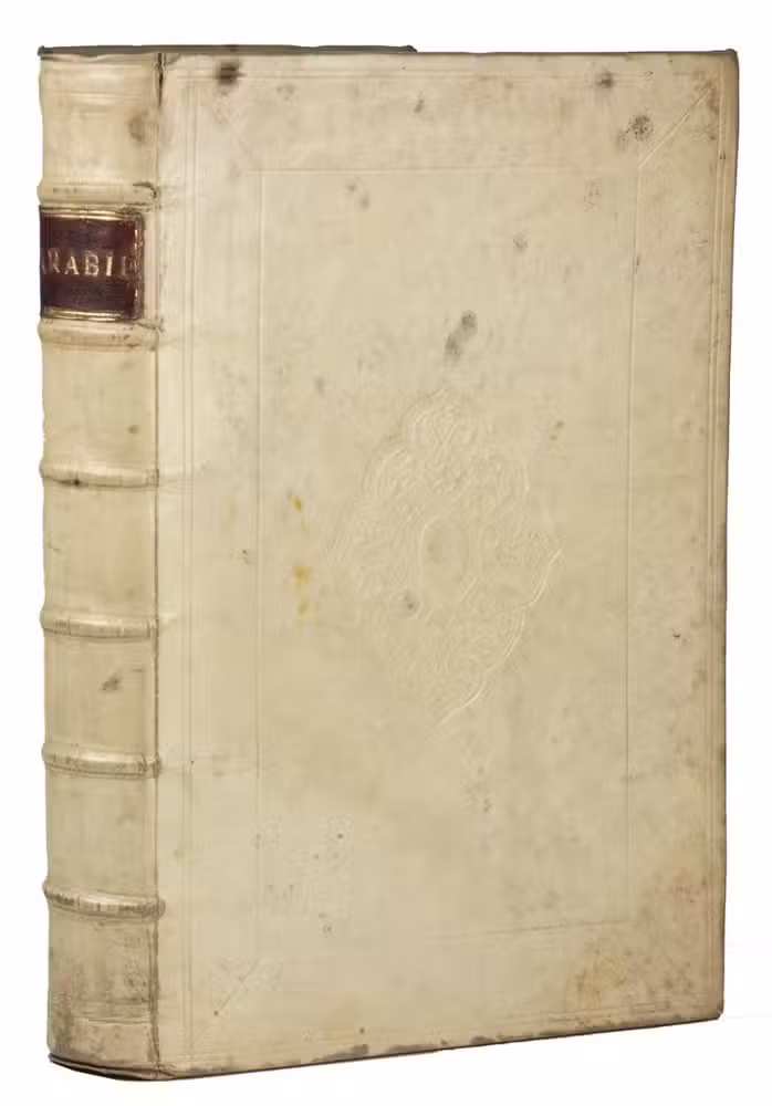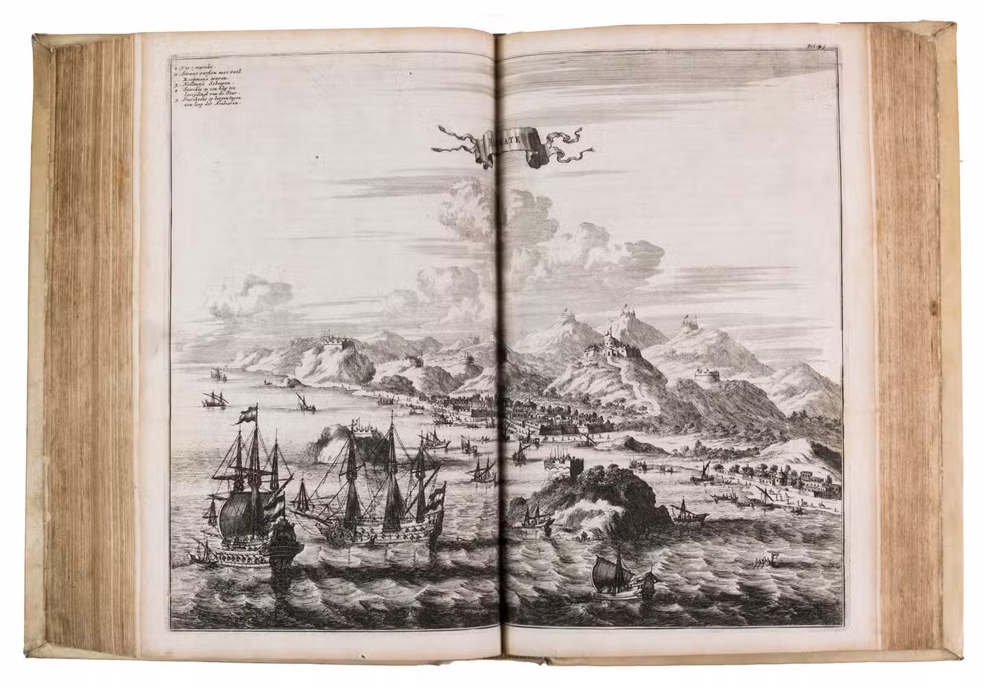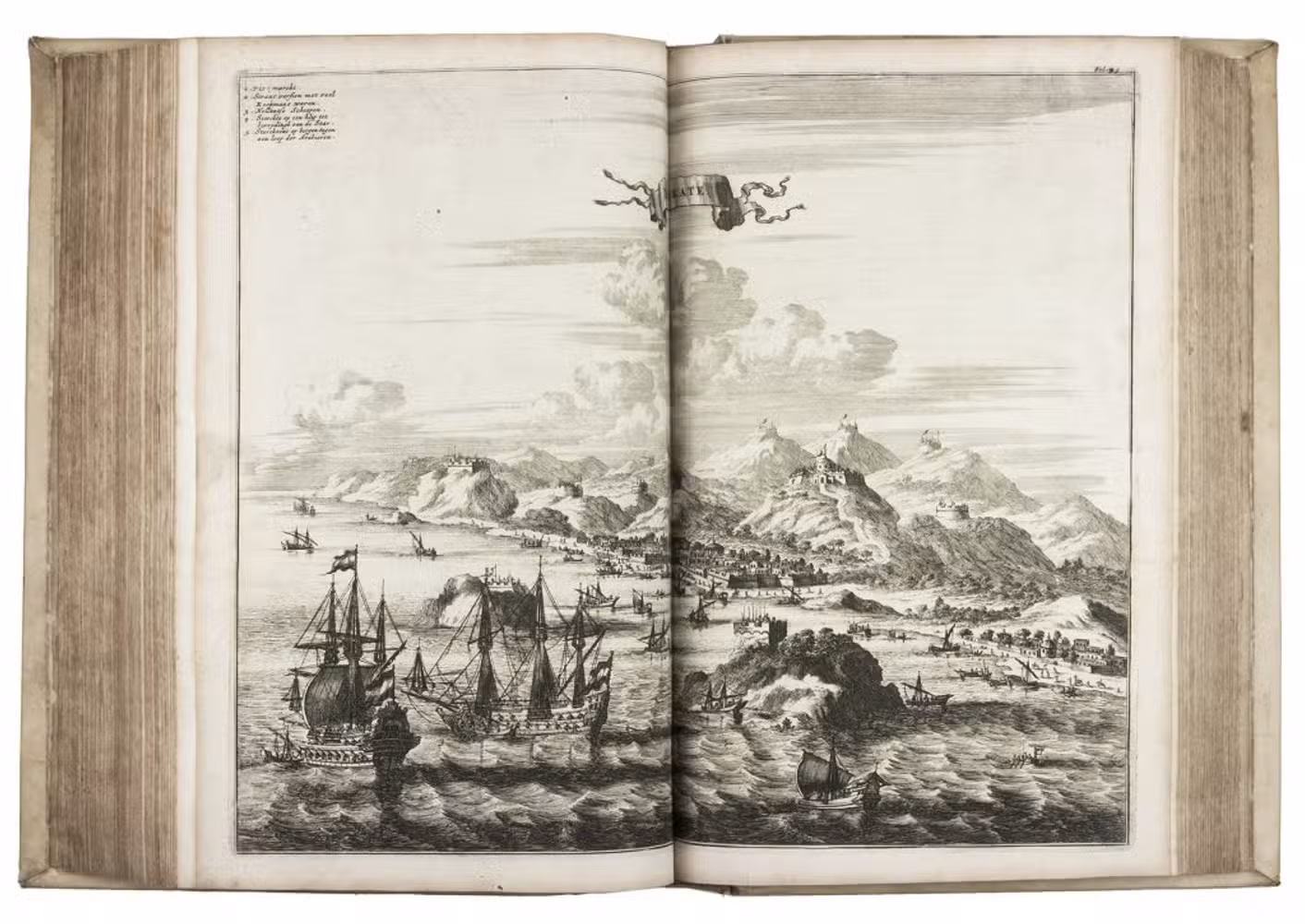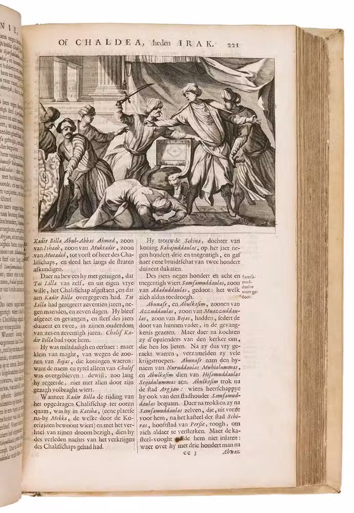 Amsterdam, Jacob van Meurs, 1680. Folio. With engraved frontispiece, 3 double-page maps (of Basra and surroundings, Anatolia and the Arabian Peninsula), 12 double-page or folding views (partly drawn by Charles Vasteau). Near contemporary blind-stamped vellum. [8], 357, [3], 324, [4] pp.