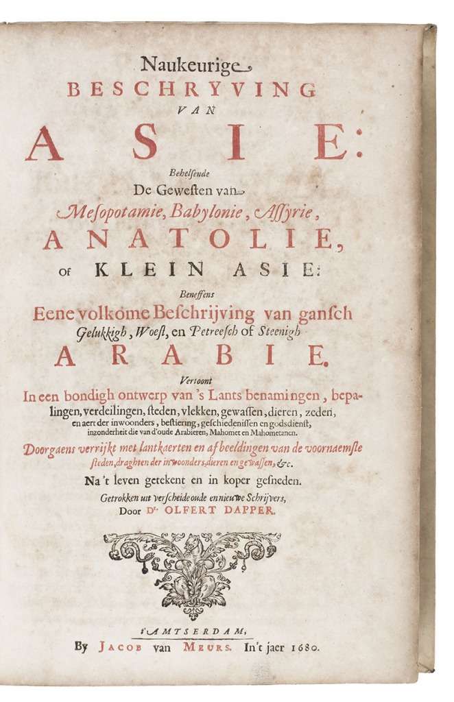 Naukeurige beschryving van Asie: behelsende de gewesten van Mesopotamie, Babylonie, Assyrie, Anatolie, of Klein Asie: beneffens eene volkome beschrijving van gantsch gelukkigh, woest, en petreesch of steenigh Arabie. Vertoont in een bondigh ontwerp van 's lands benamingen, bepalingen, . . . inzonderheit die van d'oude Arabieren, Mahomet en Mahometanen.