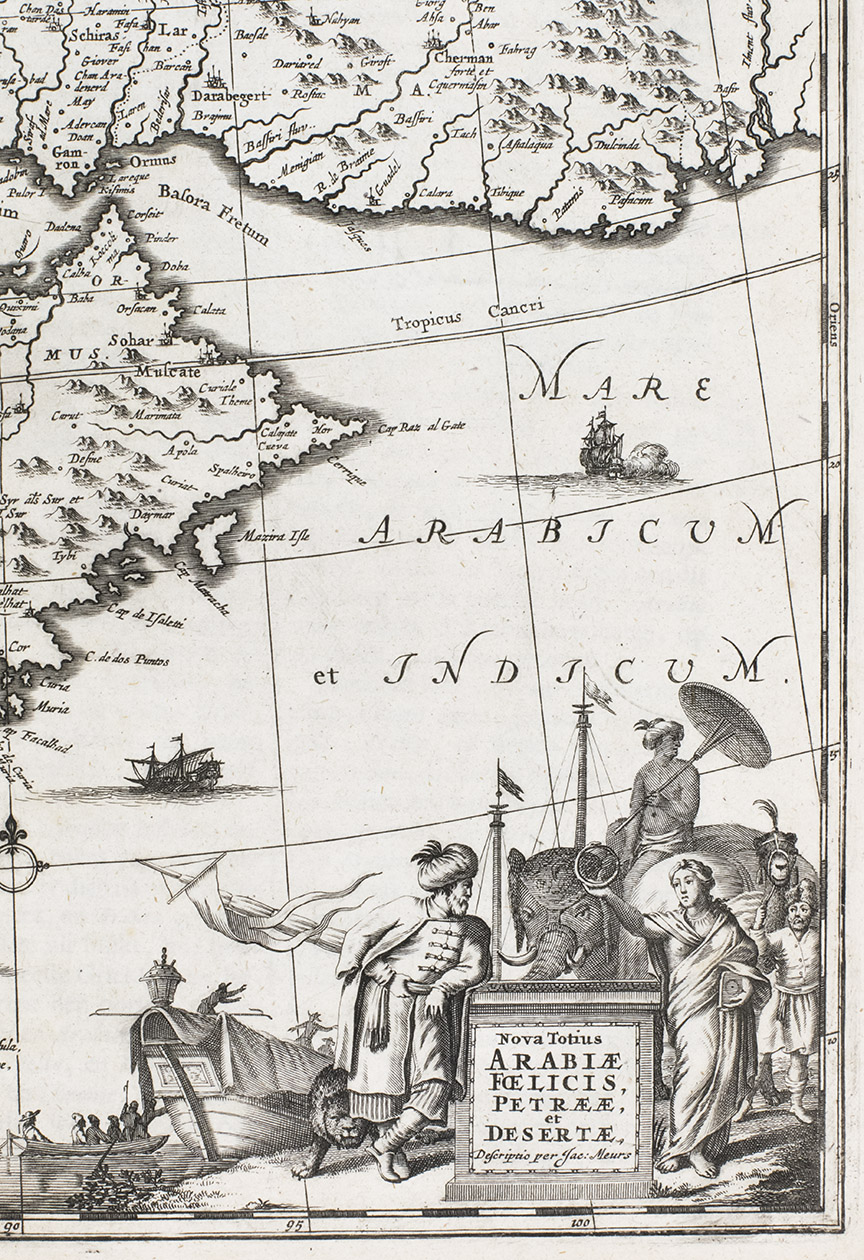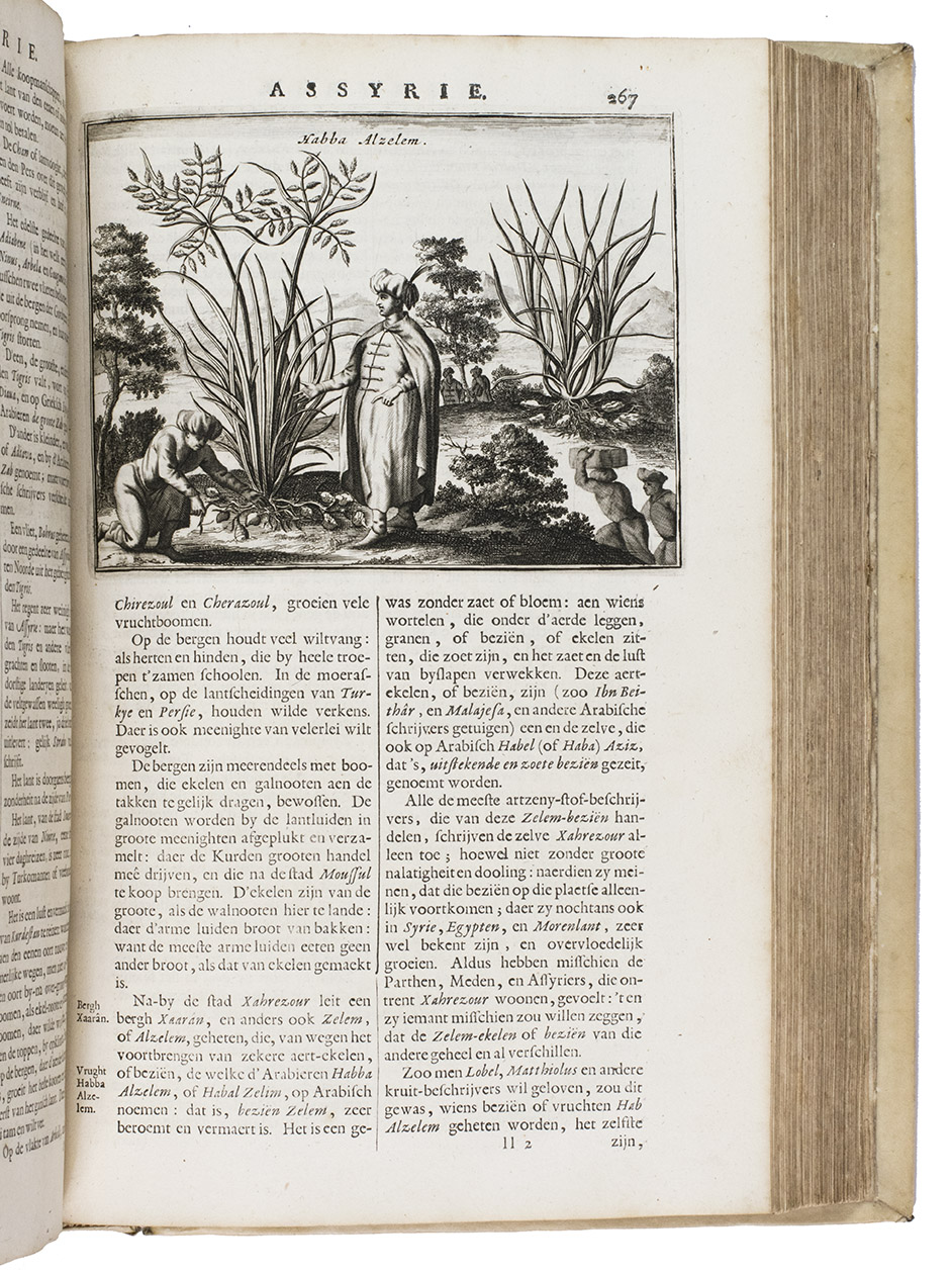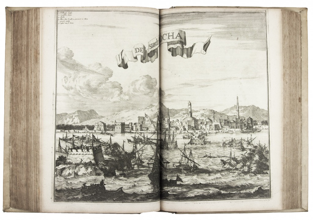 First edition of Olfert Dapper's important description of the Middle East. The first part is devoted to Mesopotamia or Algizira, Babylonia, Assyria and Anatolia, while the second is entirely devoted to Arabia. The work is especially important for the original and new information on Islam, Arabic science, astronomy, philosophy and historiography. The fine plates and illustrations include views of Mount Sinai, Bagdad, Basra, Nineveh, Abydos, Smyrna, Aden, Muscat and Mocha. The second part includes a description of coffee: "In Arabia Felix alone, and in no other place of the whole world, there grows a seed or corn or bean shrub which the Arabs call 'Bon' or 'Ban', of which they prepare a drink by cooking it in water over the fire . . ." (part 2, pp. 61-62).
