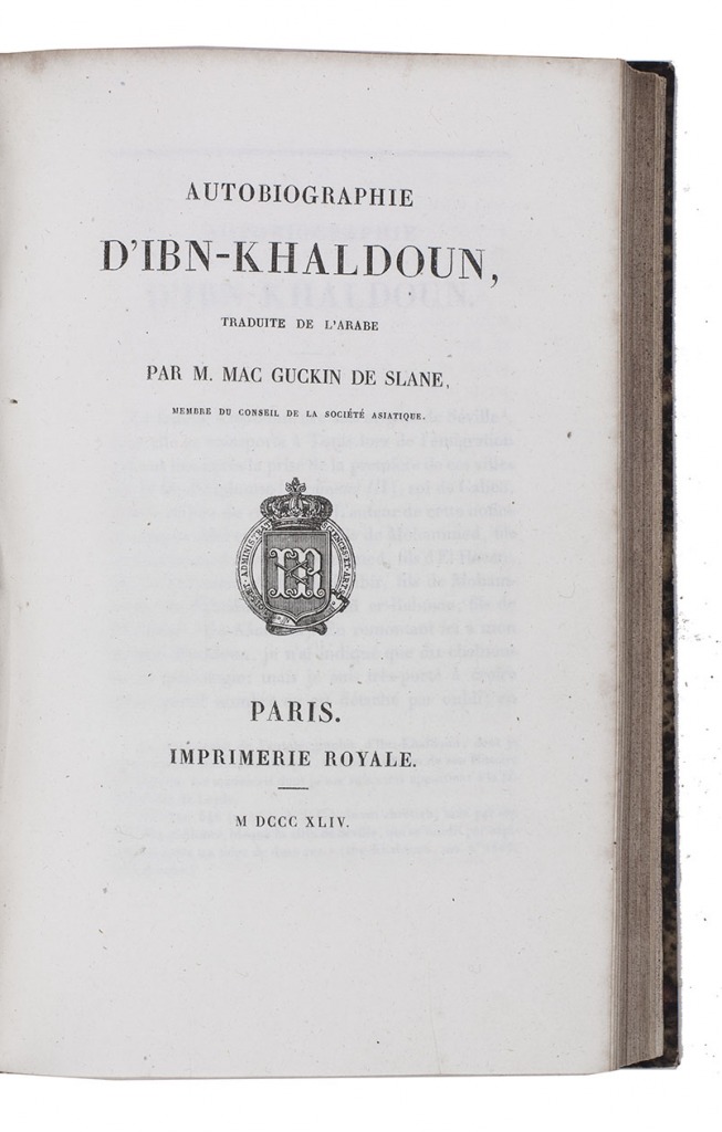 With a manuscript index to the articles. A couple leaves slightly browned and a small tear in the title-page of the third article, otherwise in very good condition. Binding very good as well. Cf. Irwin, For lust of knowing, p. 148; for Defrémery: Cooper, Men of the time (1884), pp. 330.