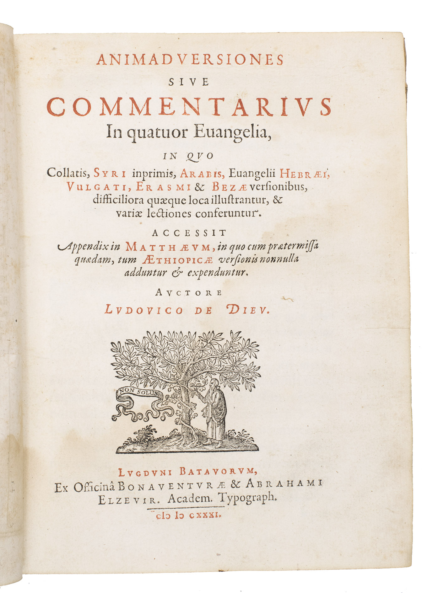 De Dieu was a Dutch Protestant minister and a leading orientalist. He studied theology and Oriental languages at the University of Leiden, under Thomas Erpenius and Jacob Golius. The present work is the first part of a series of four separately published works with commentaries on the New Testament. They were reprinted as a single body of work in 1693, under the title Critica sacra, sive animadversiones in loca quaedam difficiliora. De Dieu also wrote the first Persian grammar published in Europe.