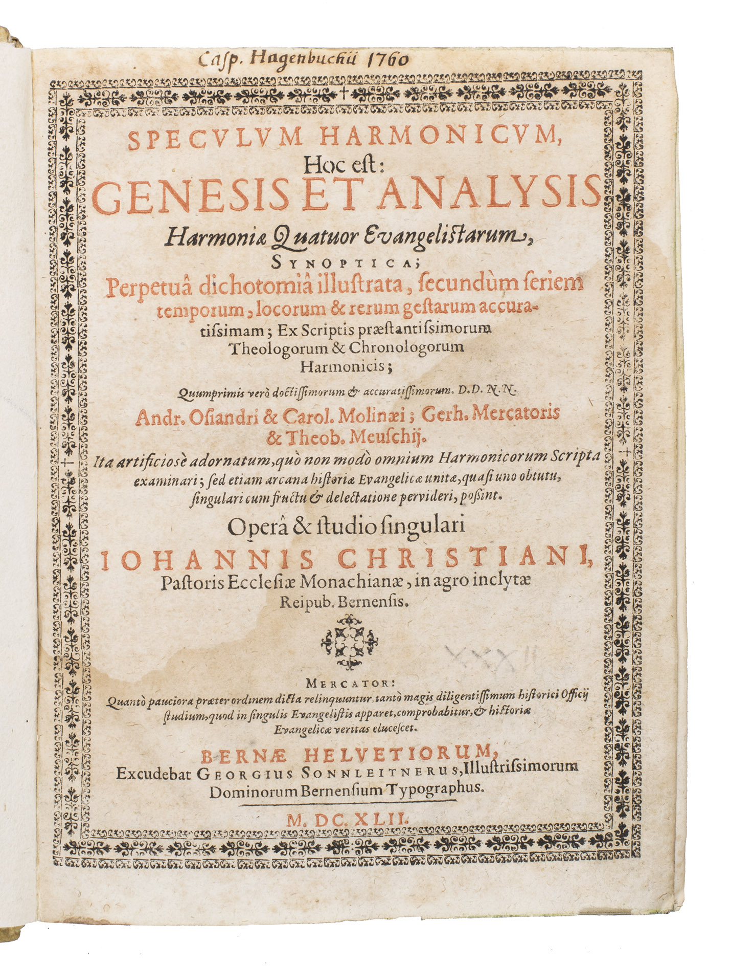 Bern, Georgius Sonnleitnerus, 1642. 2 works in 1 volume. 4to. With a woodcut printer's device on the title page, 3 woodcut decorated initials, 2 woodcut headpieces and a woodcut tailpiece. Ad 2 with a frame built up from typographical ornaments on the title page, 3 woodcut decorated initials, a woodcut headpiece, plus 8 headpieces and 2 tailpieces built up from typographical ornaments. Contemporary blind-tooled overlapping vellum, with the manuscript title on the head of the spine, blue edges. [16], 87, [1 blank]; [16], 548, [19], [1 blank] pp.
