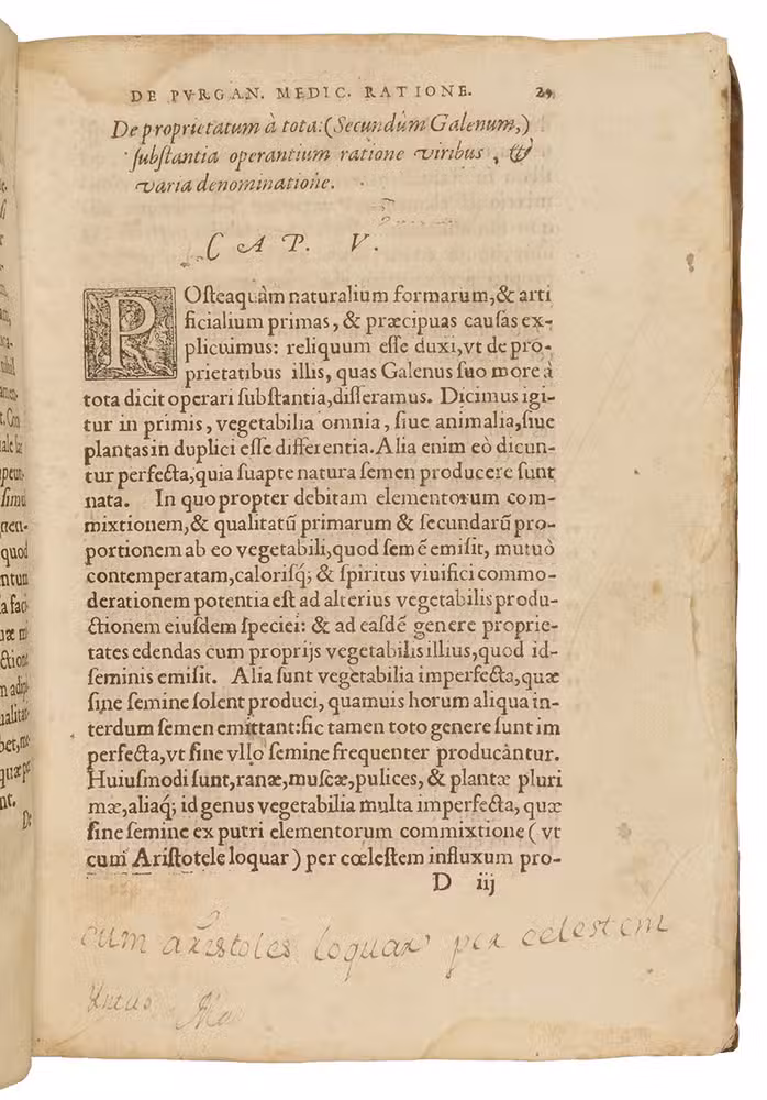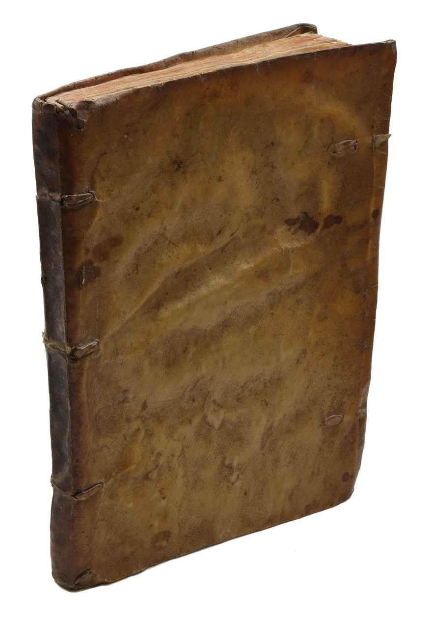 Provenance: Several near-contemporary ink ownerships by the pharmacist Joseph Nicolau (including in the device and the first initial); additional 18th century ink ownerships by Luís Ferrari. Browning and dampstains throughout; numerous ink annotations to endpapers and throughout; occasional worming, mainly confined to margins. Several paper flaws to the edges. Binding wrinkled and rubbed.  BM-STC French 145. Wellcome 5300. Ferchl 428 ("Leiden" in error). Baudrier X, 223. Gültingen VIII, 95, 158. Hoefer XV, 367. Not in Durling, but NLM WZ 240 ("Imperfect: p. 177 mutilated"). OCLC 14307014. Not in Waller or Osler.