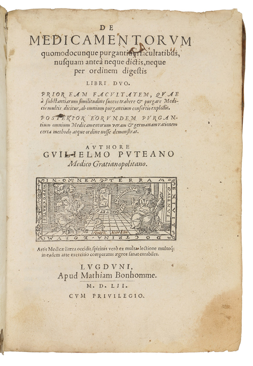 Extremely rare: the first edition of this pharmaceutical treatise by the elusive physician Guillaume Dupuis (fl. 1536-51) from Blangy in northern France but long settled in Grenoble. "Il [...] exerca longtemps la médicine avec une grande réputation [... et] était en même temps professeur à l'université de cette ville" (Hoefer). The work was republished in 1554, with a treatise by Cousinot, under the title "De occultis pharmacorum purgantium facultatibus". Like most of its kind, it draws heavily on Galen and the Arabic tradition of Mesue; p. 105 refers to the use of Aloe among the Arab physicians.