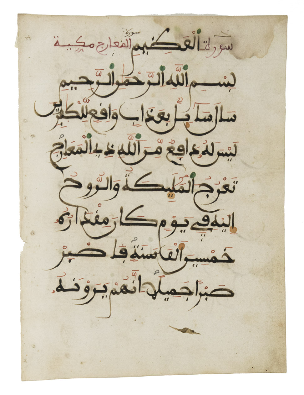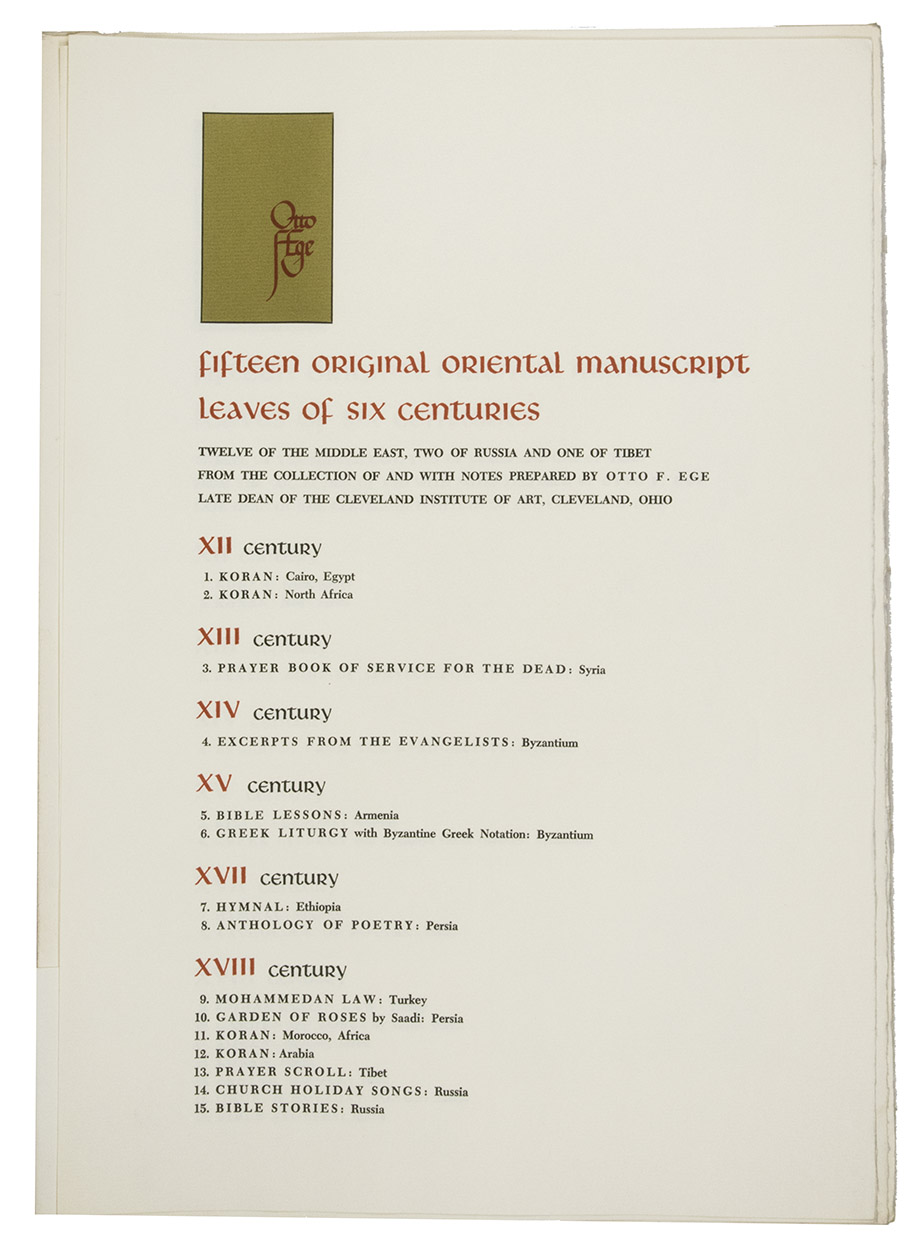 [Cleveland, Ohio?], [Cleveland Institute of Art or Western Reserve University?], [ca. 1952]. 15 manuscript leaves (in one case a fragment of a scroll) of various formats and sizes, some glazed (see the detailed list of contents for specific dimensions), 7 written on straight-forward laid paper (European and non-European), 6 more problematic (probably all non-European), 1 on straight-forward wove paper (no. 14, supposedly made in Russia) and one on vellum (no. 7), most rubricated and/or decorated in various colours, some decorated or highlighted in gold. Each manuscript leaf is mounted (hinged on one edge to allow access to both sides of the leaf) in a passe-partout (46.5 x 33 cm) and each has a letterpress slip (10 x 18 cm) with explanatory text tipped onto the foot of the passe-partout. The publication has no title-page but includes a letterpress folio leaf that serves as a table of contents and has the drop-title given above (the present copy contains two copies of that contents leaf). The display typeface used in the letterpress leaves (and on the portfolio) is the 1938 Libra by the Dutch designer Sjoerd de Roos, inspired by uncial manuscripts. Publishers original portfolio (48.5 x 34 x 4.5 cm) covered with black cloth with on-lays in black and red on the front and the authors name in white and title in red on the spine, with three pairs of black ties (one on the inside) and a label on the inside of the right black flap giving information about the limited edition: "Edition limited to forty numbered sets of which this is No 33". [1] leaf (plus a duplicate) plus 15 original manuscript leaves mounted in white passe-partouts.