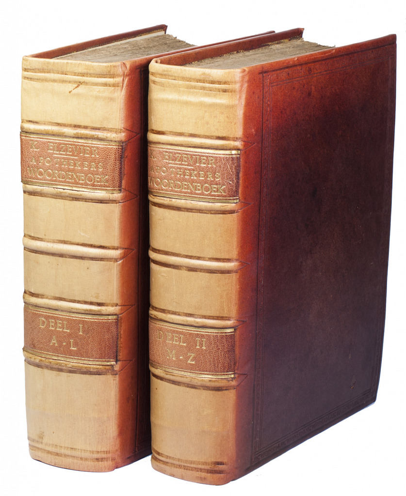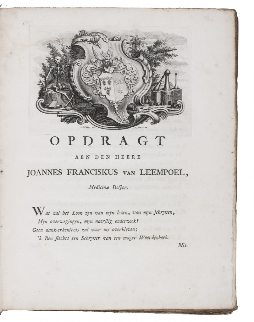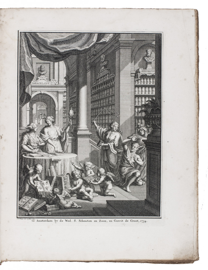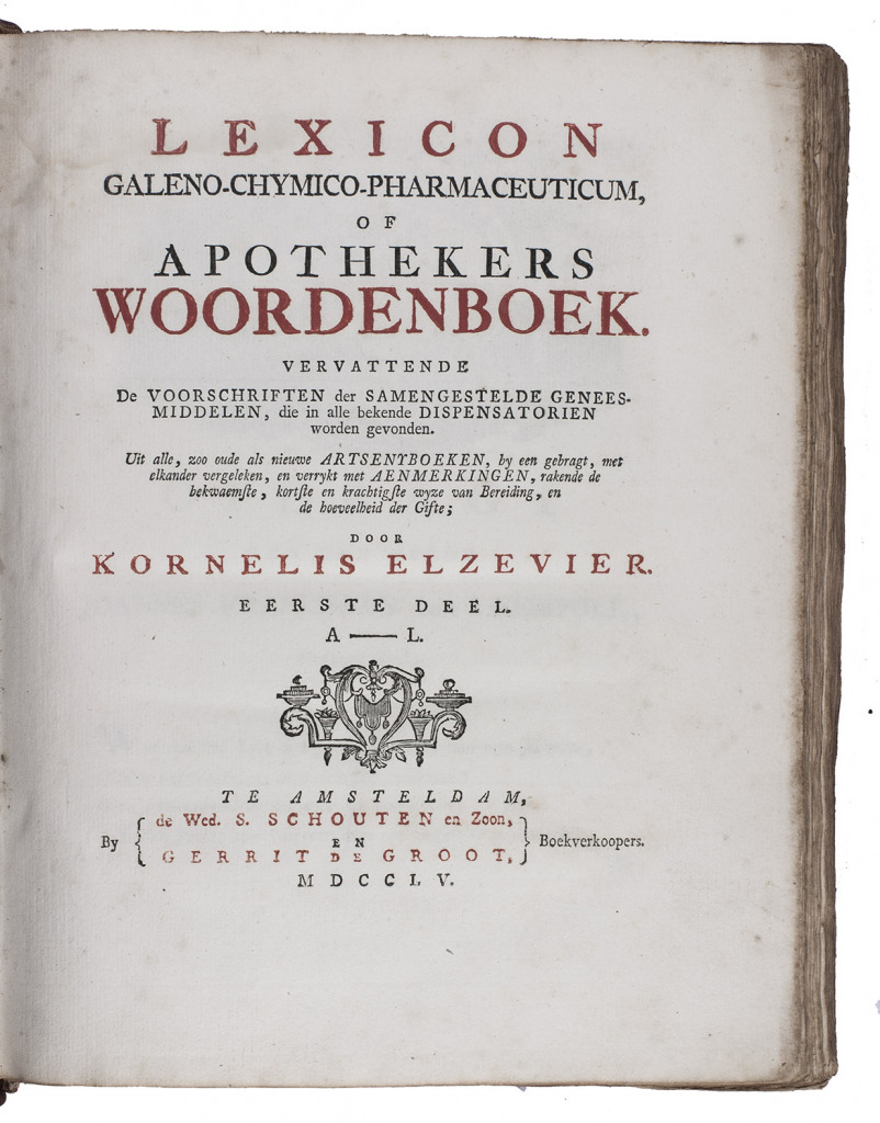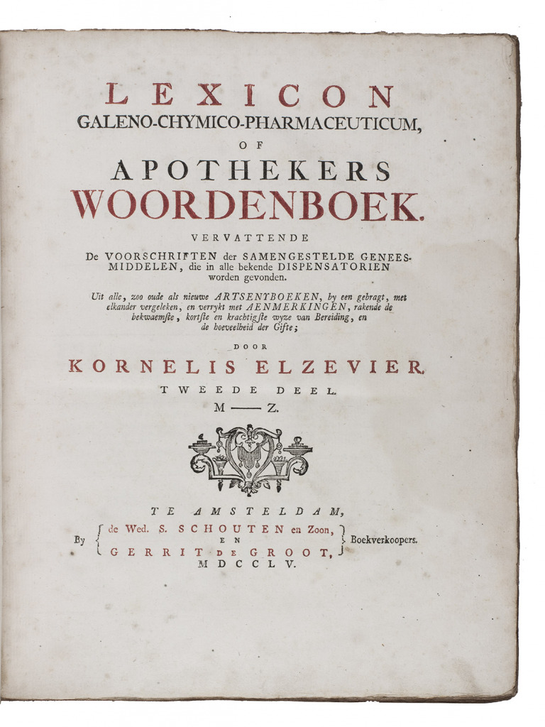 First edition of a 2000-page pharmaceutical dictionary compiled by the Dutch physician and poet Kornelis Elzevier (1717-1761). It uses the Latin terms for an enormous number of compounds and substances, with brief remarks in Dutch on their preparation and effectiveness. For various medicaments Elzevier mentions his sources, which include Cordus, Mesue, Mynsicht, Wecker and various other lexicons and pharmacopoeias. The engraved frontispiece shows an apothecary where the personifications of Truth and Experience expell Superstition and Stupidity. On the floor lie several books by popular physicians like Boerhaave, Dodonaeus, Lobel and Lemery, with on the background busts of Hippocrates, Galen and Paracelsus.