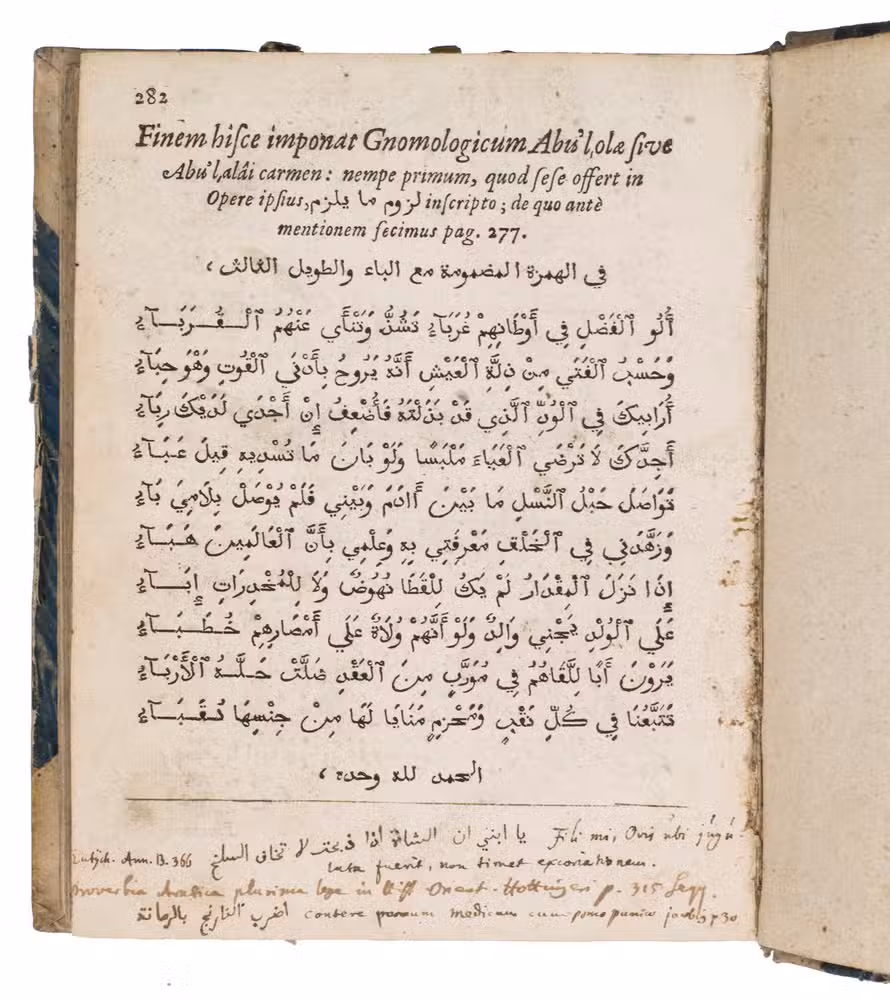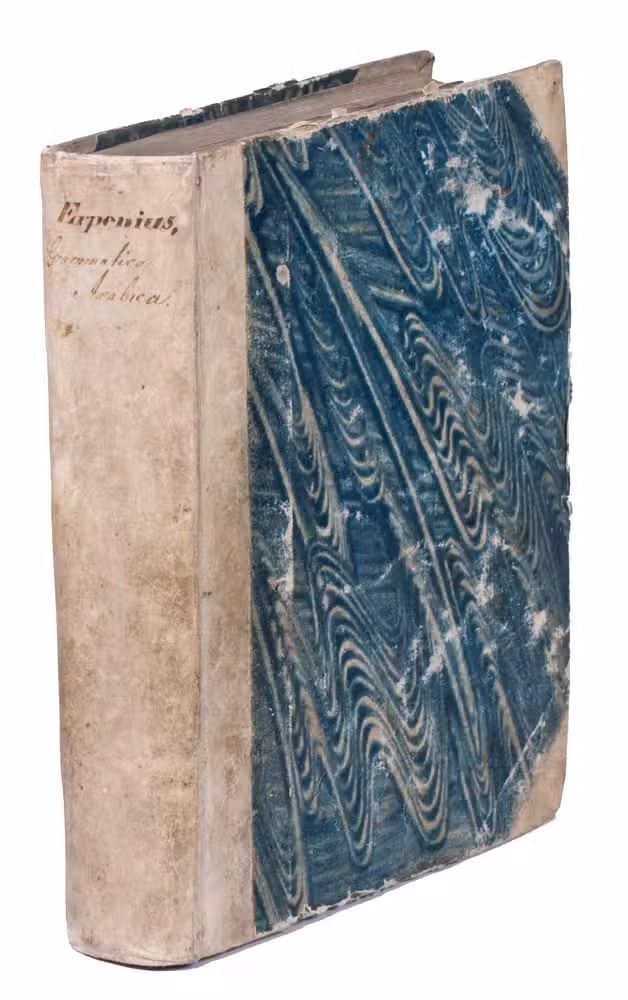 The work is annotated throughout in brown ink in an 18th-century hand, probably belonging to Petrus Boling. With two manuscript owner's inscriptions on the front pastedown ("J. Apelb..." [crossed out] and "Ex libris Petr. Boling. [Hebrew numbers(?) 2204]"), and a blue oval stamp of the library of the Gästrike-Hälsinge Nation (a student's association in Uppsala, Sweden; "Gästr.-Häls. Nation Bibliotek") on the recto of the first flyleaf. The vellum of the binding is browned, the decorated paper sides are rubbed and slightly damaged along the edges, the printer's device on the title-page has been removed, the hole has been restored with thin laid paper, the first leaf of the preface has been reinforced with paper (was damaged when the title-page was cut), some slight foxing throughout. Otherwise in good condition. Breugelmans, Fac et spera (2003) 1656:1; F. De Nave, Philologia Arabica (1986) 72 note; Schnurrer 81 & 220; Smitskamp, Philologia orientalis 72; STCN 065582748 (8 copies); USTC 1829193 (7 copies)