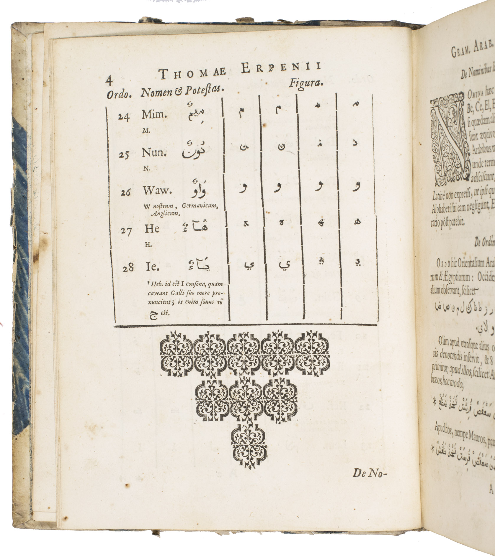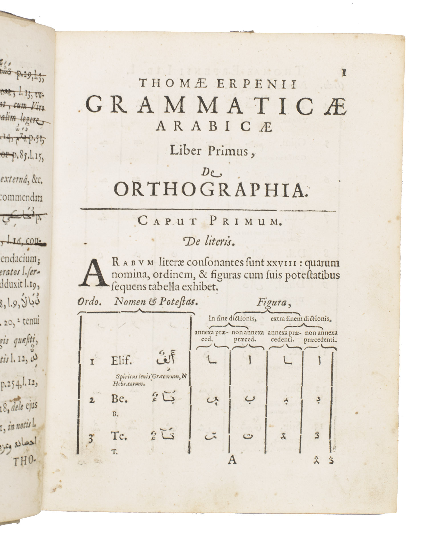 The present copy has clearly been used to study Arab grammar, as it has been annotated in an 18th-century hand throughout. These annotations are most likely the work of the Swede Petrus Boling (1731?-1805?) who was headmaster in Gävle from 1786 to 1805. His manuscript ex libris can be found on the front pastedown.