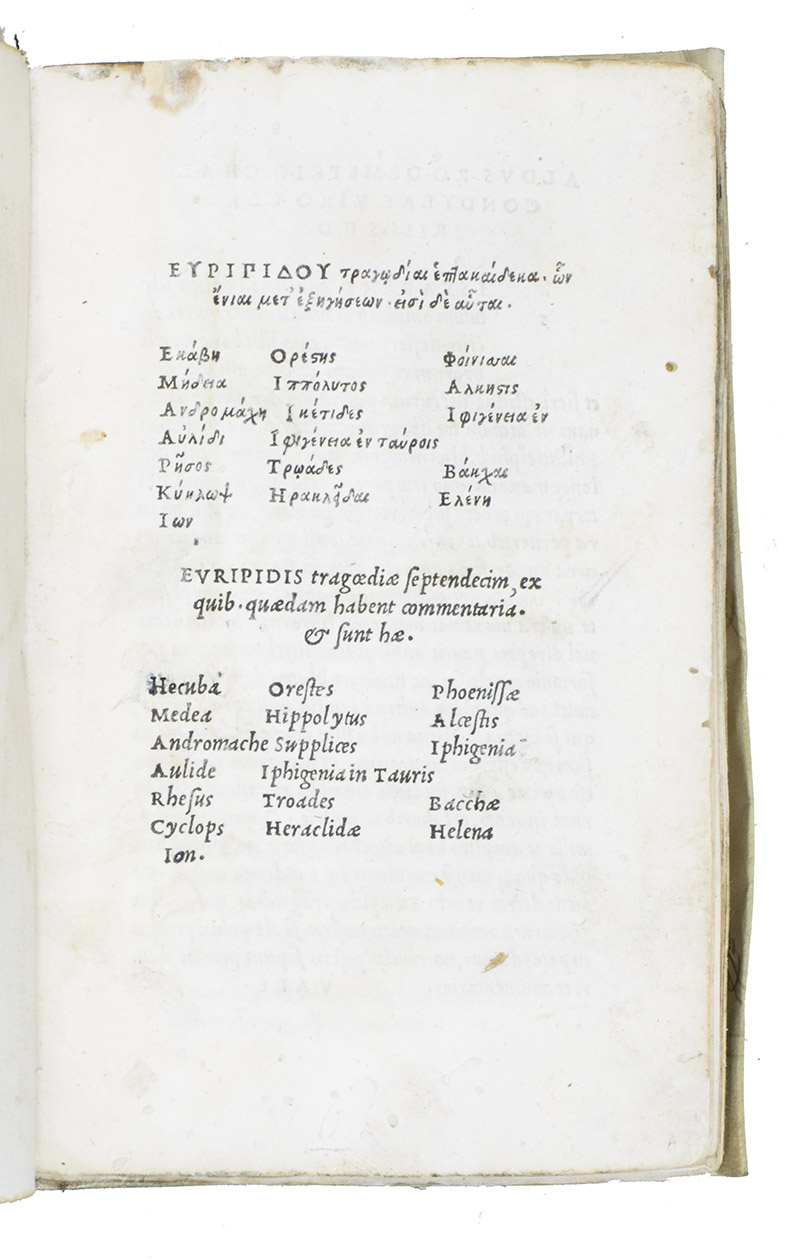 [Title in Greek then Latin:] Tragoediae septendecim [recté octodecim], ex quib[us]. quaedam habent commentaria. & sunt hae. Hecuba[,] Orestes[,] Phoenissae[,] Medea[,] Hippolytus[,] Alcestis[,] Andromache[,] Supplices[,] Iphigenia in Aulide[,] Iphigenia in Tauris[,] Rhesus[,] Troades[,] Bacchae[,] Cyclops[,] Heraclide[,] Helena[,] Ion[, Hercules furens].