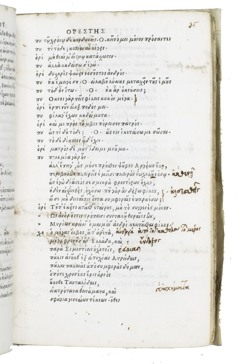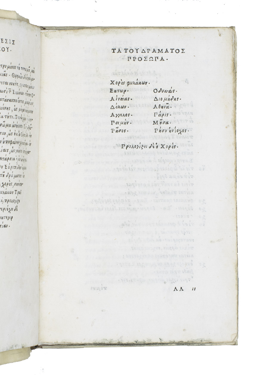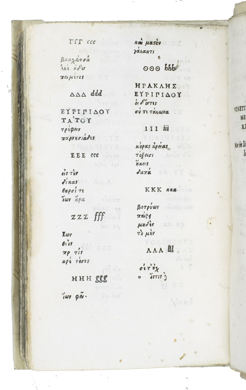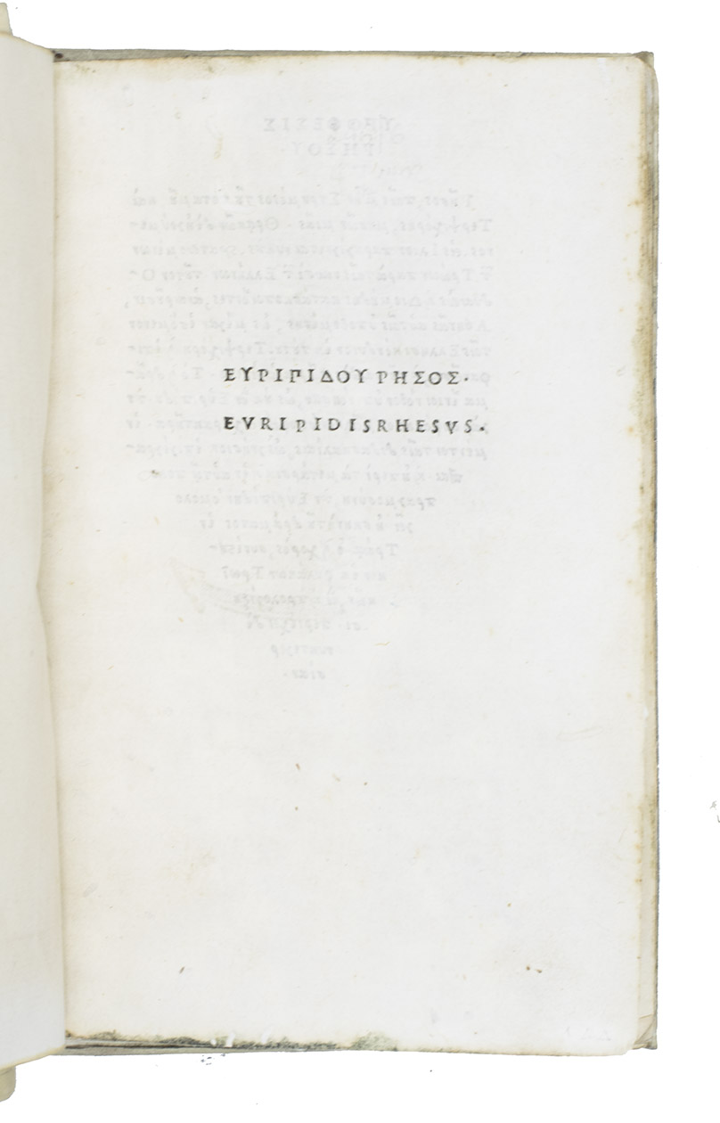 "Exceptionally important" (Lowry) first edition, in the original Greek, of most of the surviving plays of Euripides. It contains 18 plays, fourteen printed here for the first time and four for the second (and in a much more accurate text). This first edition of nearly all his surviving plays (Electra remained unprinted until 1545) certainly assured the survival of the greater part of Greek historical drama. Only 4 of his plays had been printed previously, by J. Lascaris in Florence, 1495, also in Greek. In Thomas More's 1516 Utopia, his hero Raphael gives a collection of Greeks books to the Utopians: Plato, Aristotle, Theophrastus, Plutarch, Homer, Aristophanes, Sophocles and Euripides, all in Aldine editions (Lowry, p. 262). Aldus's first Greek types, in 1495, set the style for the future by following a sloped cursive hand rather than the rounder upright hand that dominated the incunabula period. The present book is set in the smallest and best of his Greek types, first used in his Sophocles 6 months earlier (Scholderer, Greek printing types, no. 25). It is better cut than the earlier ones and has fewer ligatures, making it clear and legible even to a modern eye. It set the style until Garamont's Grec du Roi brought extensively ligatured Greek types back into fashion for about two centuries. Aldus introduced the world's first italic type in 1501 and uses it here for the few bits of Latin text.