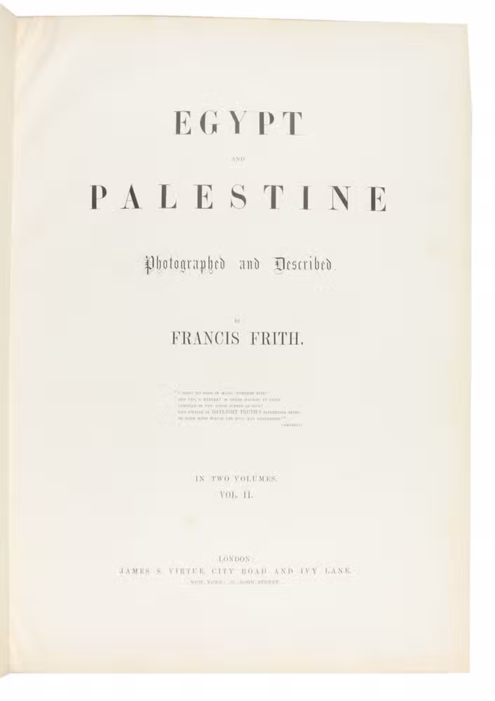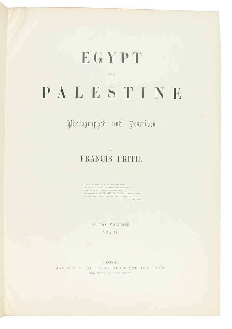 First edition of an important early photobook on the Near East by one of the greatest pioneers of early photography. From 1856 to 1859, Frith (1822-1898) made three visits to Egypt and the Holy Land. He published this selection of his photographs, from wet-collodion 9 x 7 inch glass negatives taken with an 8-by-10 inch camera, in 25 fascicles of 3 prints each, a work hailed as "one of the most renowned nineteenth-century photobooks" (The Photobook). Most are dated 1857 either in the plate or the printed caption. They include a portrait of the artist in oriental costume and views of Abu Simbel, Aswan, Baalbek, Bethlehem, Damascus, Giza, Hebron, Jerusalem, Karnak, Luxor, Nazareth, Philae, Tiberias, Wadi Kardassy etc. The preliminaries of vol. 1 include title, introduction, table of contents and subscribers, those of vol. 2 include title and contents. Each plate is accompanied by a full-page letterpress description. "Francis Frith is undoubtedly one of the best-known photographers to work in the Near East. His trips to the Levant were a brilliant commercial success as well as an artistic one" (Perez 163).