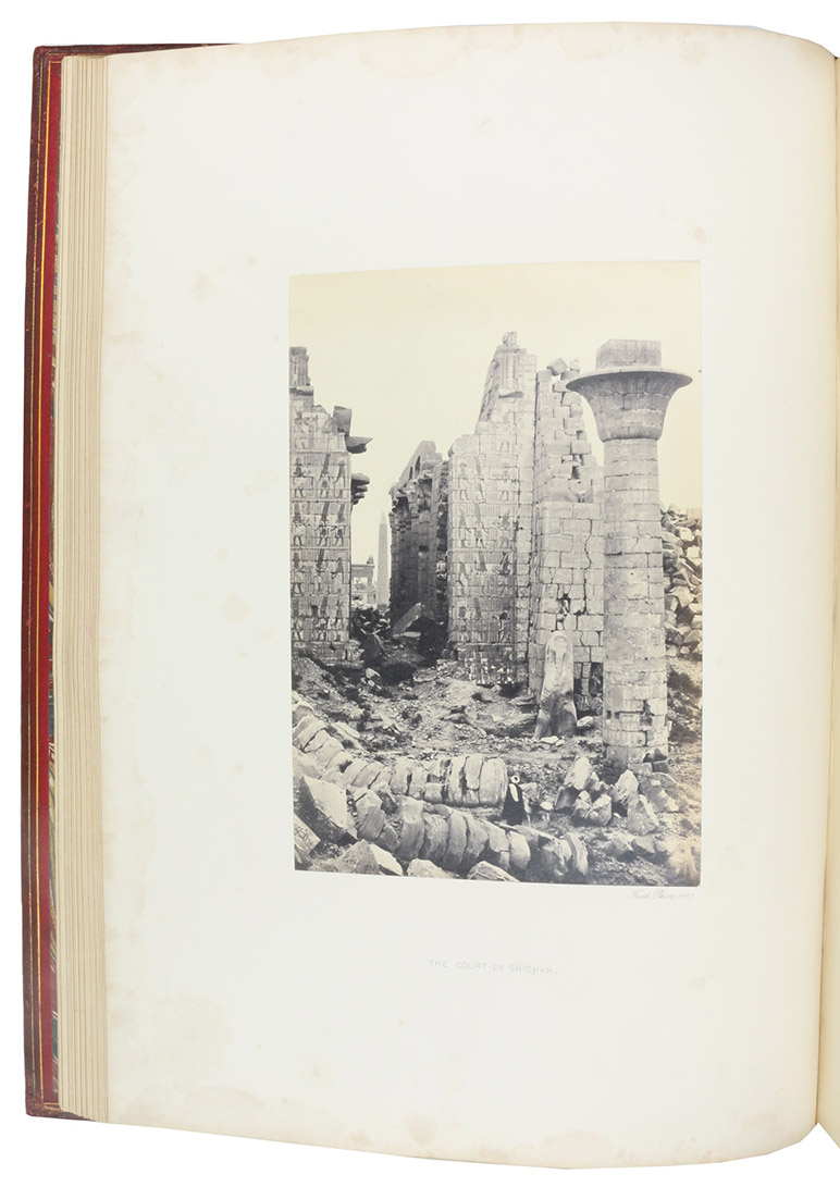 London, James S. Virtue, [1858-1859]. 2 volumes. Folio (44.5 x 32.5 cm). With 76 photographs on plates by Francis Frith (ca. 14.5-16.5 x 21.5-23 cm), each with a separate leaf of text. Contemporary red morocco, gold-tooled spines and boards, marbled endpapers, gilt edges.