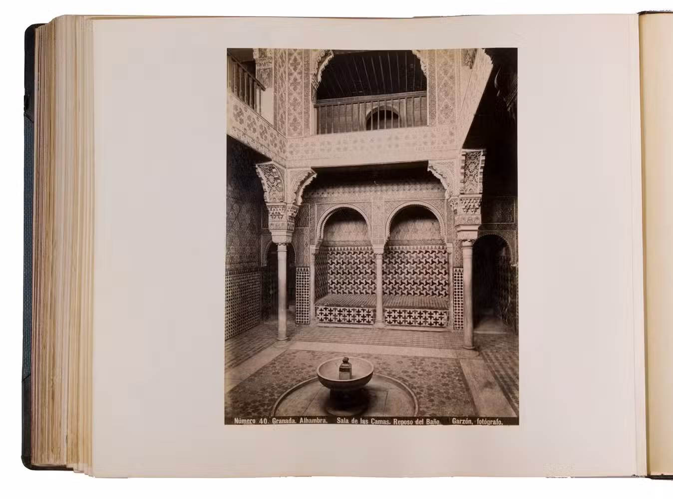 At the centre of Garzóns photographic work on Córdoba was the Palace of the Lions, also known as the Court of the Lions (Patio de los Leones; Èåæ ÇáÓÈÇÚ). Situated in the center of the Alhambra with its ancient citadel consisting of a complex of forts, palaces, and gardens, this is one of the most buildings of the period of Muslim rule. The palace was commissioned by the Nasrid sultan Muhammed V of the Emirate of Granada during the second phase of his reign, between 1362 and 1391 AD. The general layout of the Palace of the Lions courtyard comprises an elongated rectangle with two halls facing each other at opposite ends, which is a common feature in numerous earlier palaces throughout Al-Andalus, including other Nasrid palaces located within the Alhambra (such as Comares Palace). Similar designs can even be traced back to the 10th century at Madinat al-Zahra, located near Cordoba. What sets the Palace of the Lions apart is the addition of two more halls, which face each other across the courtyard's shorter axis. This innovation is accompanied by an extension of the columned portico to encompass all four sides of the courtyard. The four converging water channels within the courtyard's floor are generally believed to be a symbolic representation of Paradise, which both Muslim and Christian traditions describe as having four rivers. This arrangement may have drawn inspiration from the Persian chahar bagh tradition, which involves a garden divided into four symmetrical parts along its central axis. The Palace of the Lions combines this with the classical peristyle tradition, which features a portico or arcade surrounding a courtyard. Other monuments in Al-Andalus and North Africa, where they are commonly referred to as a riad (or riyad), also feature gardens with a chahar bagh-type quadripartite division.