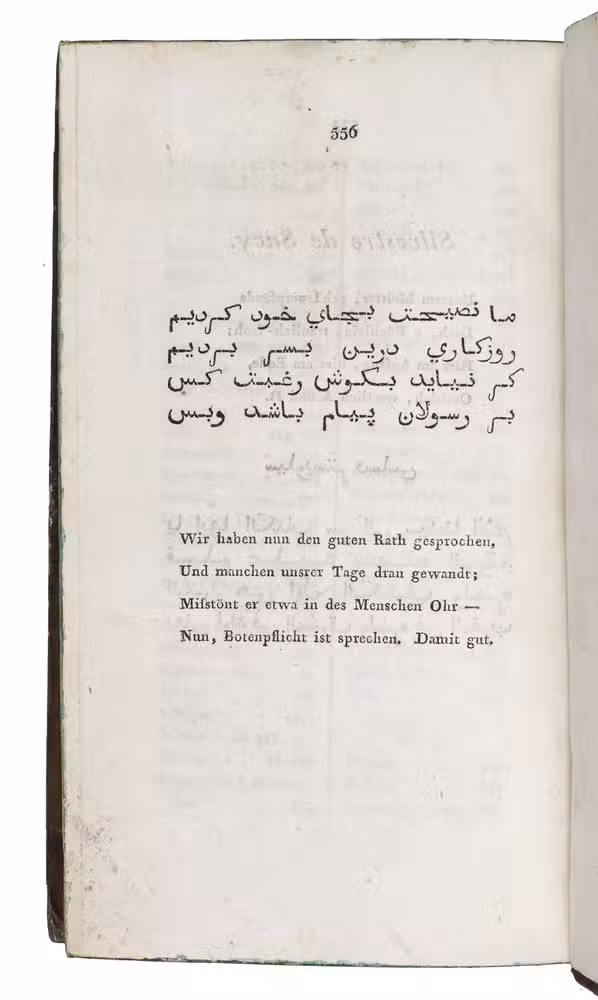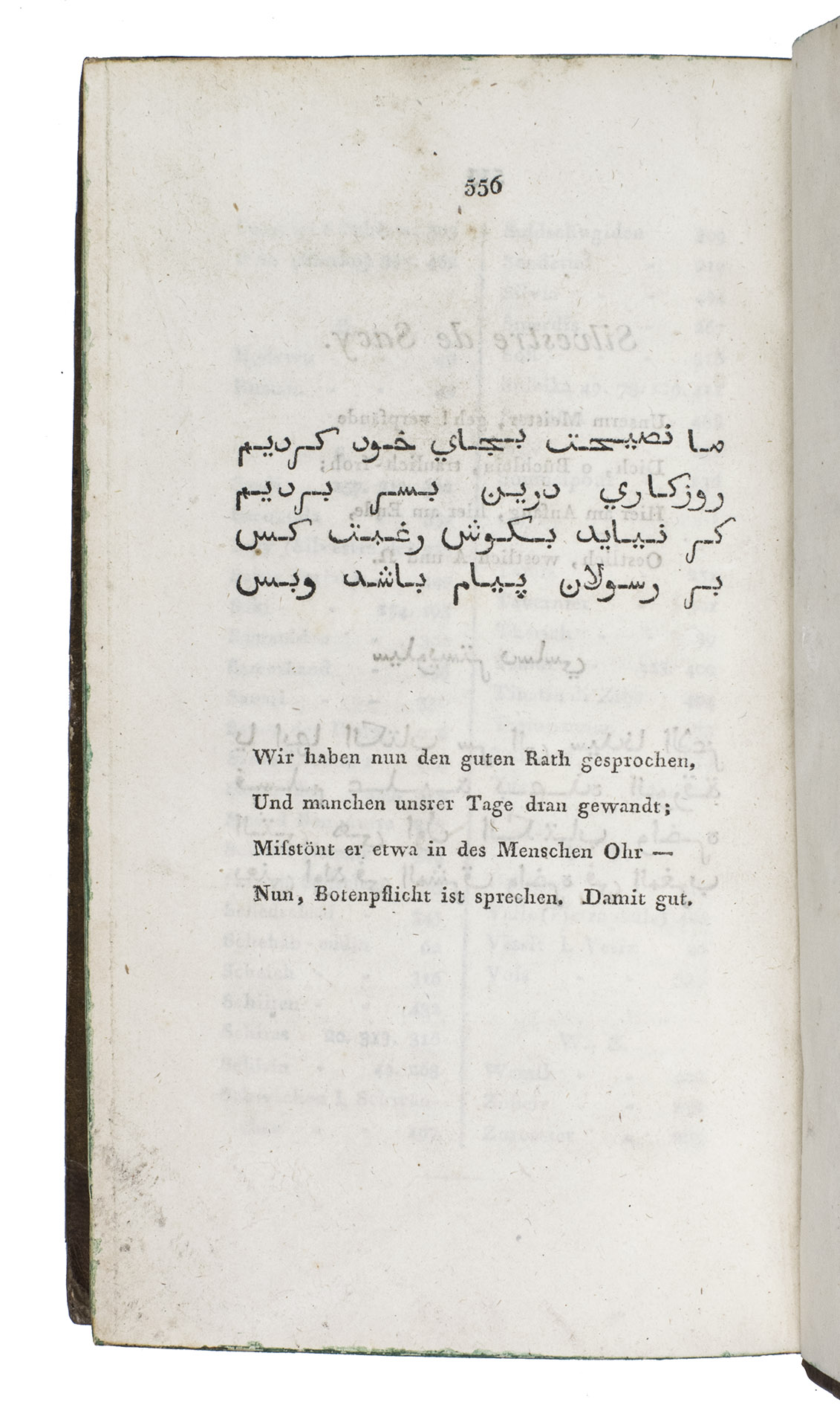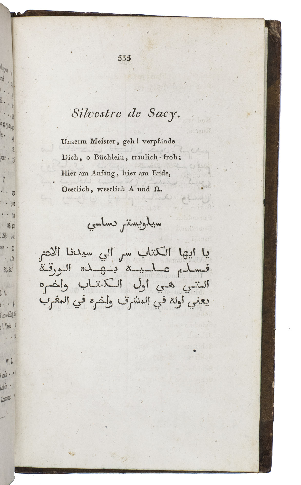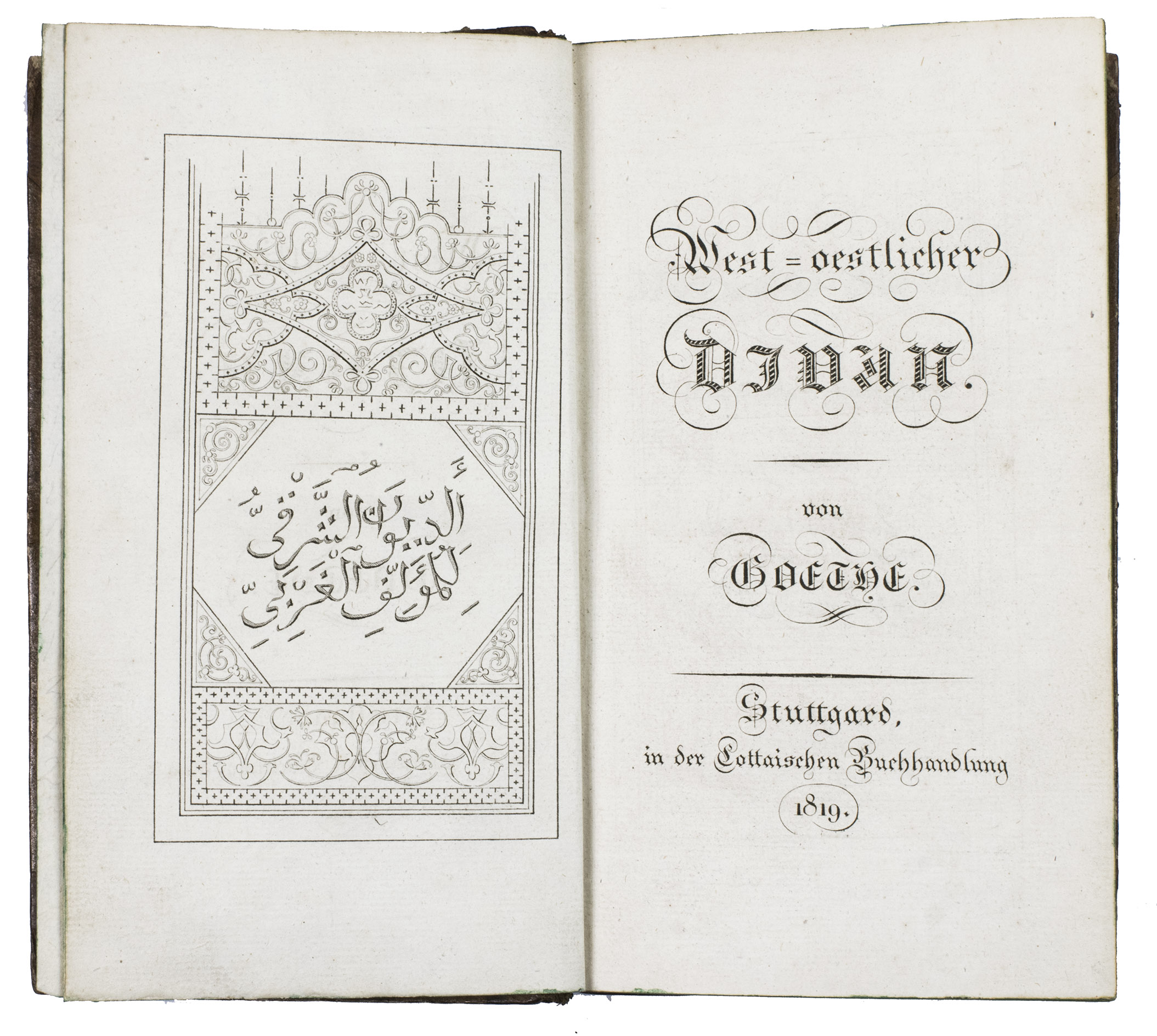 First edition of Goethe's lyrical poems inspired by the work of the great Persian poet Hafez (ca. 1325-1390). The work was intended to enact a dialogue between Eastern and Western poetry, but also captures Goethe's feelings for the Austrian dancer Marianne von Willemer (1784-1860), who wrote some of the poems. It is the most famous interaction with Eastern poetry in German Romantic literature, and includes some of the best poems of Goethe's later years.