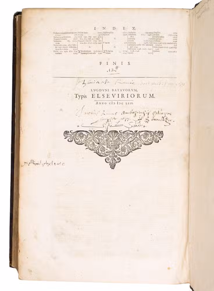 With an owner's inscription on the title-page ("Jacobus du Poirier Ambosiensis [Greek text] Parisii .. 1677 [Arabic text]") and around the colophon (above: "J.bs. du poirier de la Ramée. doct. med. fm. 1679" and below: "Jacobus Ramus Ambaesiensis [Greek text] Parisii .. 1677. [Arabic text]" and some Arabic text further below): from the library of Jacques du Poirier de la Ramée, a French doctor and scholar from Tours . Further with a manuscript inscription on the recto of the final black flyleaf, and occasional manuscript annotations in Arabic, Latin, and Greek in the margins, probably by Jacques du Poirier de la Ramée. The spine and corners of the boards show some signs of wear (with some minor loss of material) and the joints are slightly weakened, the front free flyleaf is modern, some occasional foxing, a small water stain in the top inner corner of the leaves, some occasional very small ink stains in the margins. Otherwise in good condition. De Nave 91; Rahir, Les Elzeviers, 723; Schnurrer 79; Smitkamp, Philologia orientalis 314; STCN 117768960 (8 copies, including 1 incomplete); Vrolijk & Van Leeuwen, Arabic studies in the Netherlands, pp. 47-48; Willems, Les Elzevier, 723; cf. for Jacques du Poivier de la Ramée see: Jean-Luc Deuffic, "Jacques du Poirier, doctor in Tours, bibliophile and erudite Hellenist" (online 26 September 2011, https://pecia.blog.tudchentil.org/2011/09/26/jacques-du-poirier-medecin-a-tours-bibliophile-et-helleniste-erudit/).