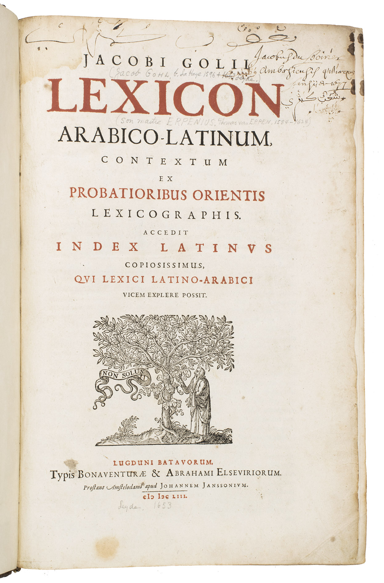 First edition - the Elzevier and Janssonius issue - of Golius's ground-breaking Arabic lexicon, which remained the most important dictionary in European Arabic studies until Freytag's dictionary appeared in the 1830s. Golius based his dictionary on a variety of Arabic lexicographical texts, the most important being al-Jawhari's Sahah and Firuzabadi's Qamus, but he also used geographical and zoological sources such as al-Damiri's book on animals. His dictionary included, moreover, Arabic words derived from other languages, most notably Turkish and Persian, which he translated directly from the source language, using Turkish and Persian glossaries. The work concludes with an extensive index, containing some 10,000 entries. "The manner in which Golius arranged his dictionary, according to the Arabic root letter and the verbal and substantival forms with all their derivates, is still the fundamental criterion of Arabic dictionaries in European languages" (Vrolijk & Van Leeuwen). The book was produced in four simultaneous issues, differing only in the imprint, all noting Bonaventura and Abraham Elzevier as printers (the colophon also noting the Elzeviers as printers), one apparently for their own distribution and others noting the book's sale by Johannes van Ravesteyn in Amsterdam or Arnout Leers in Rotterdam rather than the present Johannes Janssonius. It was for a long time the best resource we had on the Arabic language (Willems 723).