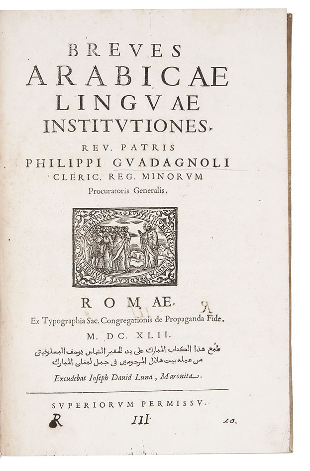Rome, Propaganda Fide, Joseph David Luna, 1642. Folio. Set in roman, italic and Arabic type with incidental Hebrew. Contemporary sheepskin parchment. [12], 349, [1], [2 blank] pp.