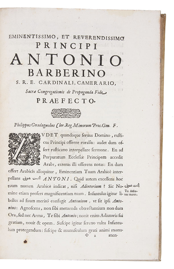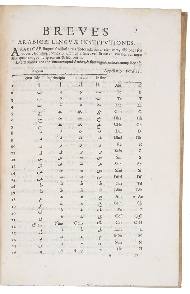 First and only edition of Guadagnoli's Latin grammar of the Arabic language, in a luxurious folio format. He notes that they have taken special care with their Arabic setting and with the metre to suit them to the desires of native Arabic speakers, though the fact that the text was in Latin. The main text opens with a table of the letters, showing (from left to right!) the stand-alone, initial, medial and final forms, along with the name of each letter and its pronunciation. The texts used as examples include the first printing of two poems taken from manuscripts in the oriental library collected by Pietro della Valle (1586-1652) in Rome: the "Carmen Chazregiacum" and the "Carmen de invocationibus'.