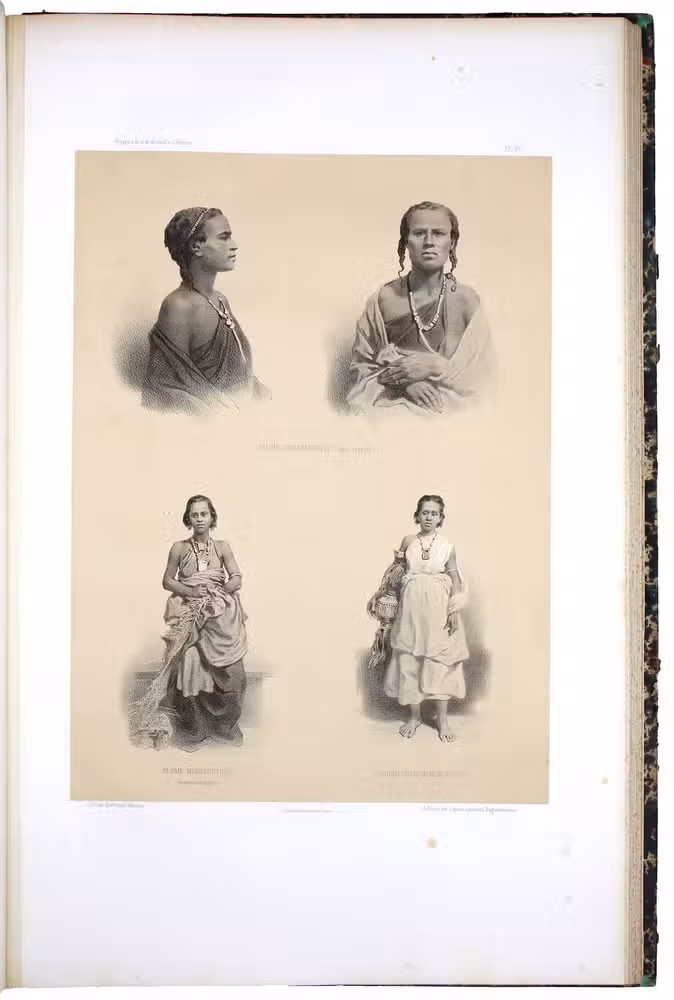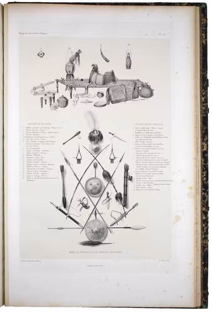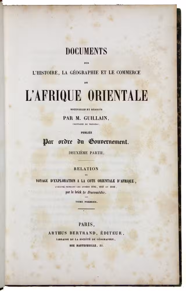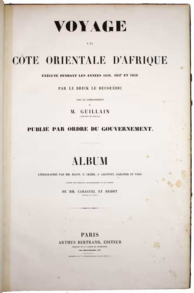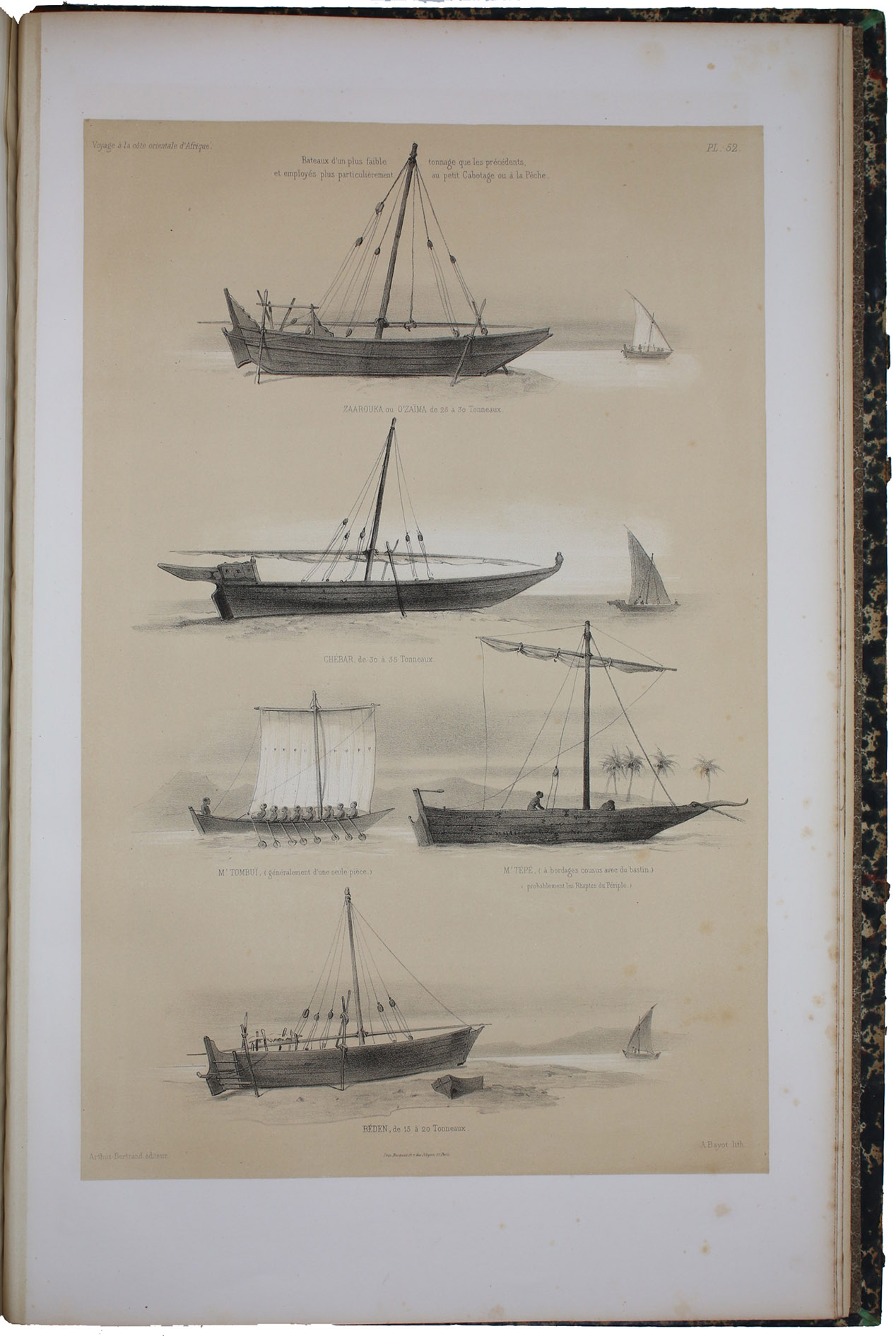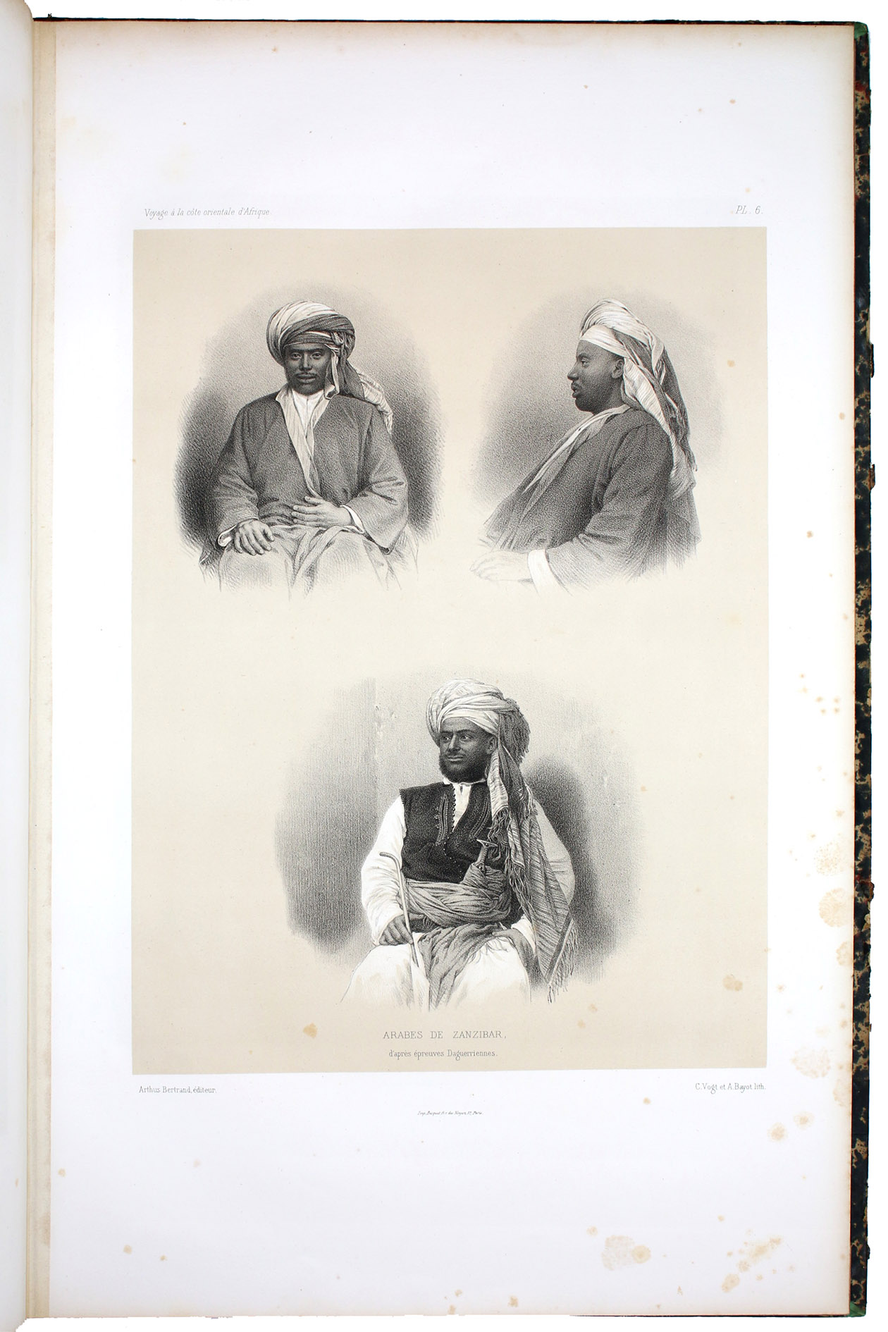 In the 1850s, the French Ministère de la Marine was anxious to publicize their outstanding advances in the field of coastal mapping, especially as France appeared to be losing ground in the colonial scramble for overseas conquests. Gullains expedition was a perfect combination of cartography and ethnology with which to do just that, and no expense was spared in publishing the attractive atlas volume, containing extensive maps and quite beautiful plates. The portraits of Arabs and Africans are drawn from early photographs, including a portrait-sitting which took place in the courtyard of the governors mansion in Zanzibar, where Gullain was often hosted on his travels. The first to sit was the governors great-niece, an eight-year-old named Aziza dressed in her finest clothes. This persuaded the governor himself, Syed Seliman Ben Ahmed, to have his own portrait taken; subsequent daguerreotype sessions were made in the houses of Khamis Ben Osman, a prominent Zanzibar citizen, and Abdallah Ben Ali, a trader. Other plates include as "Soldats Irréguliers du Sultan", showing Omani Arab soldiers of the "Beni-m-hhacen" tribe, the sheikh "Abdallah Ben Naceur ben Mohhamed, Membre de la tribu des Mzara" in Mombasa, and "Arabes de Zanzibar".
