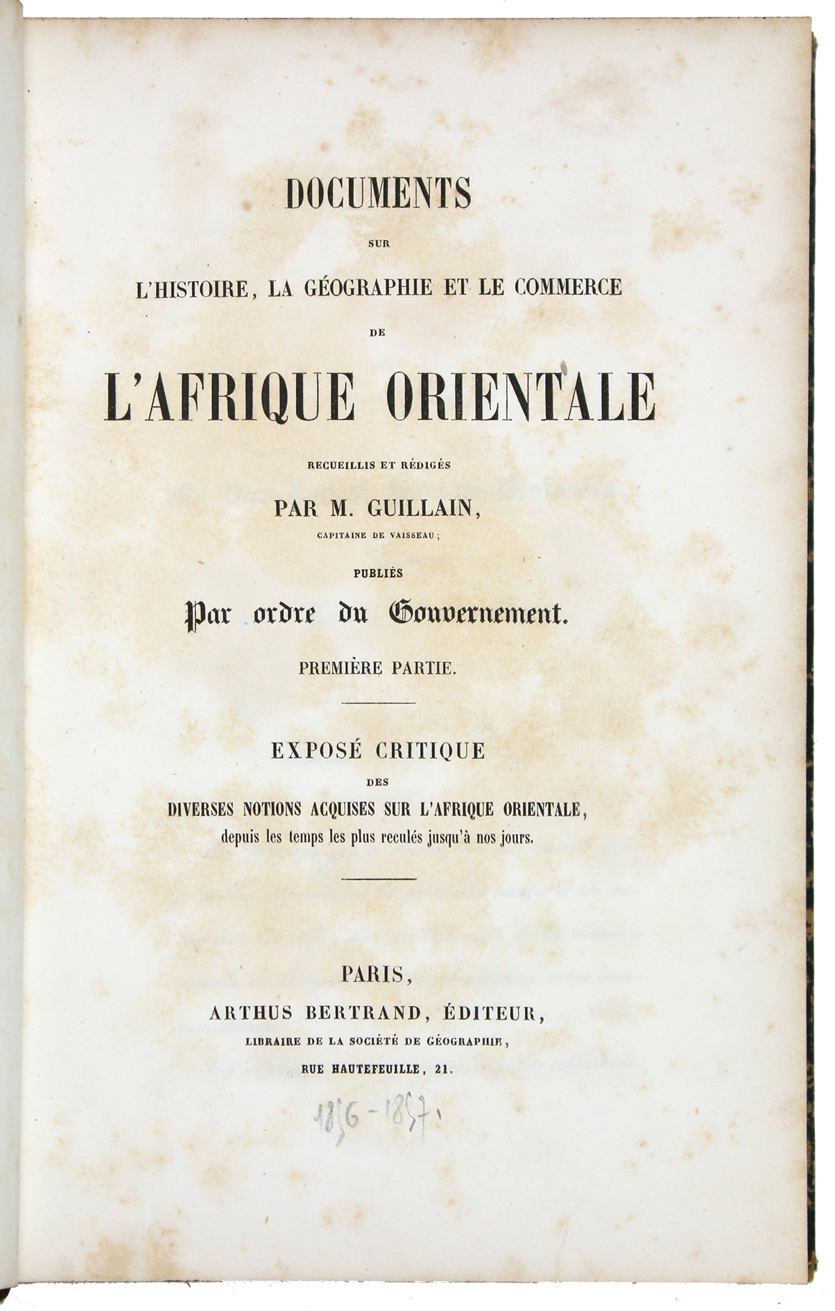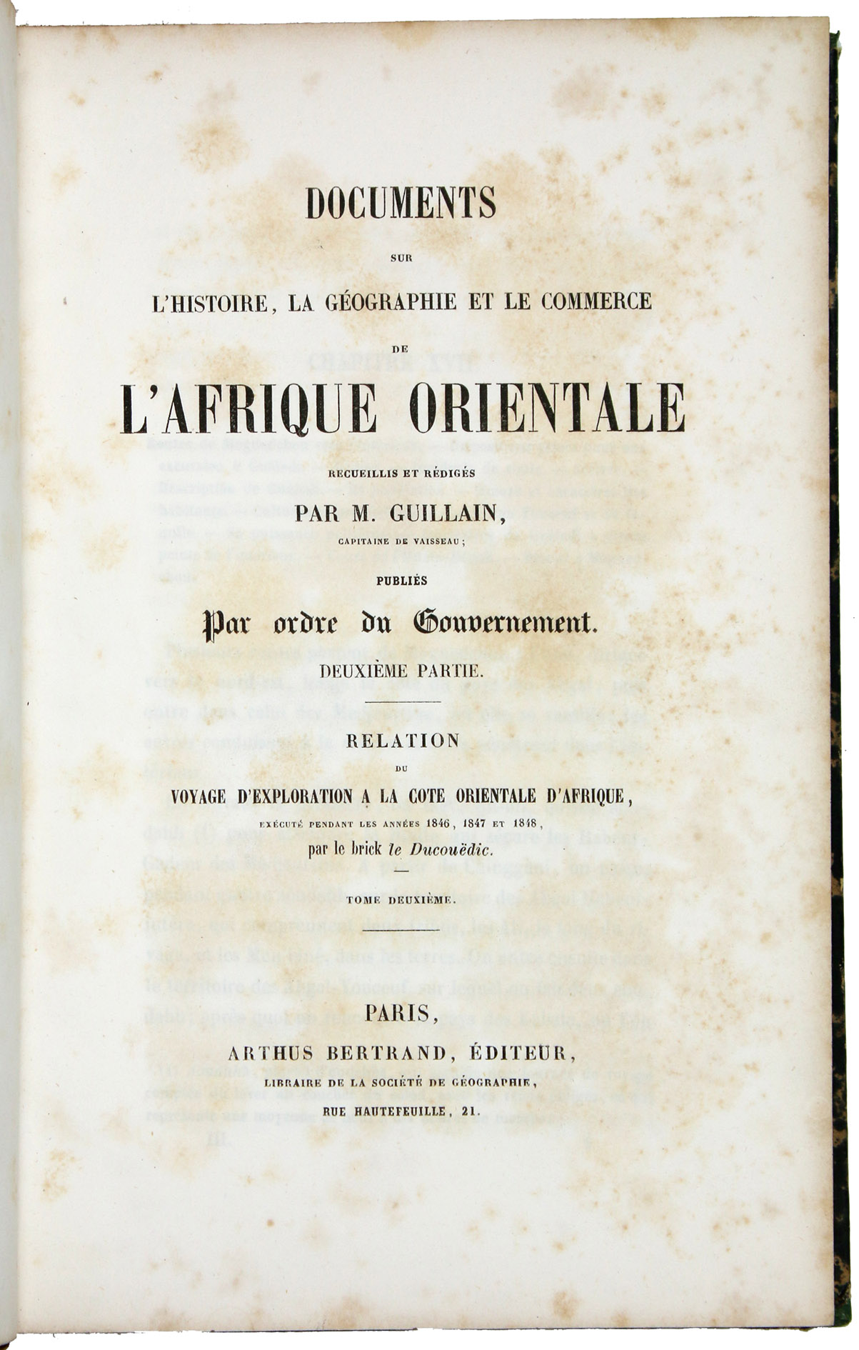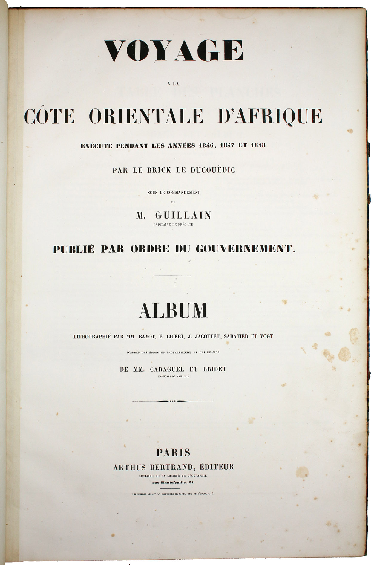 Complete in three volumes and a folio atlas, this work traces the expedition of Charles Gullain (1808-75) along the eastern coast of Arabia and Africa, from Oman to Madagascar, and features several innovations in its maps and plates, including lithographed portraits based on daguerreotypes.