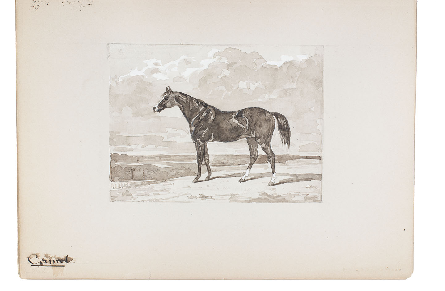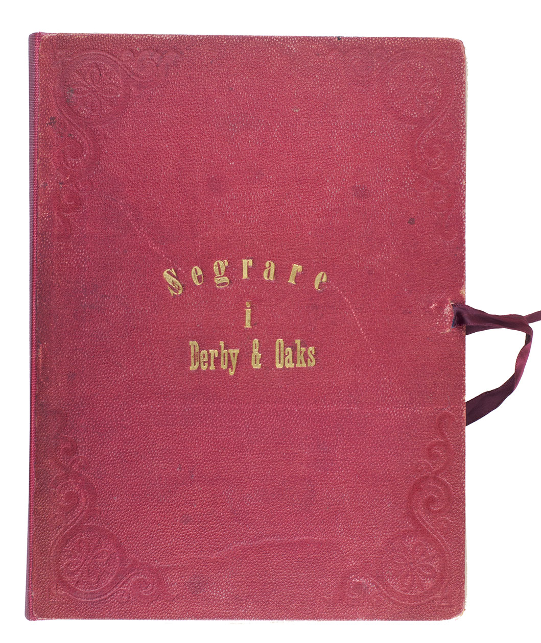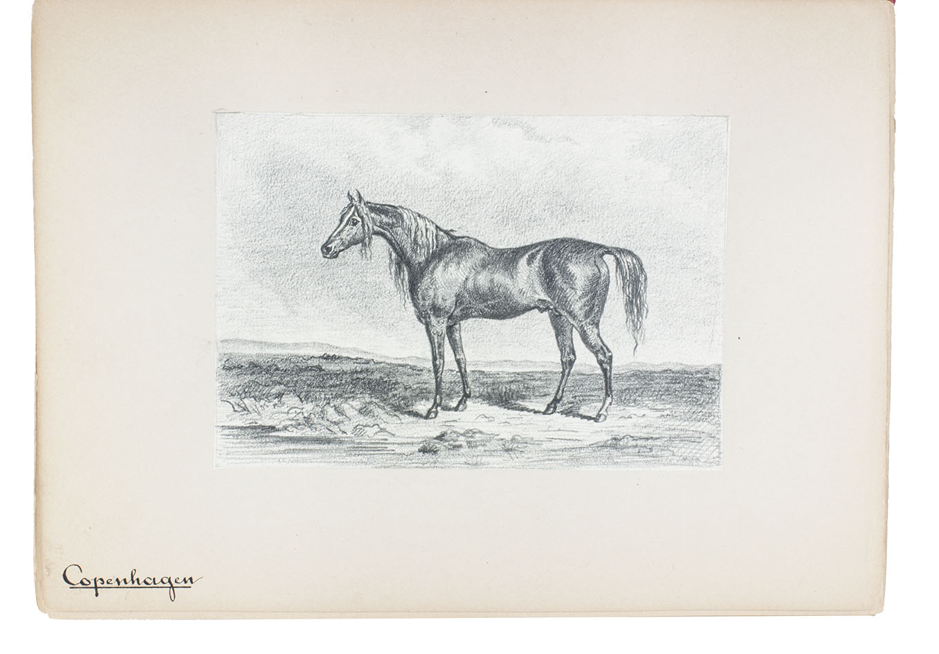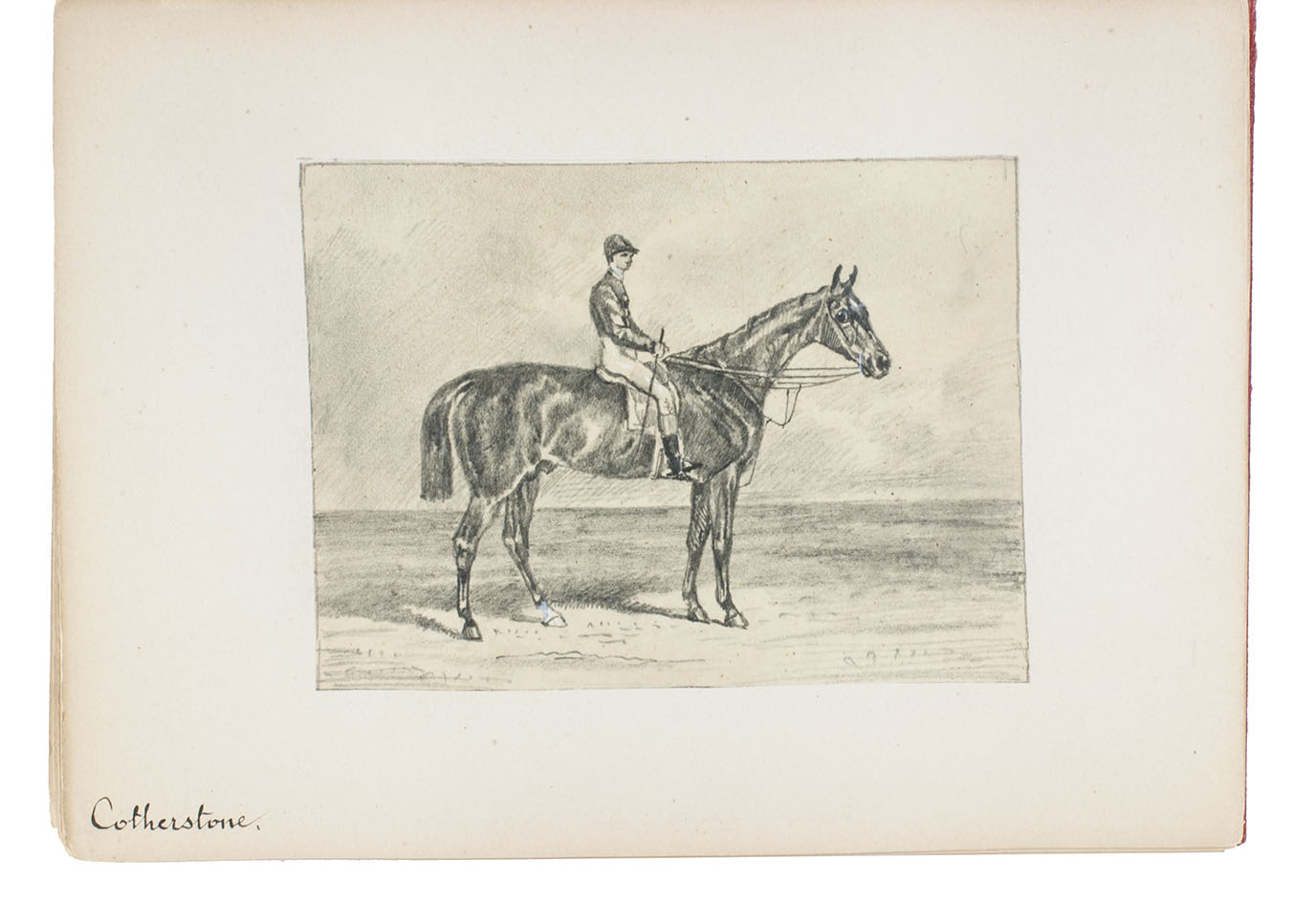 [England and/or Sweden], ca. 1835?-ca. 1855. 4to (24.5 x 18 cm). 36 pencil drawings of English thoroughbred race horses (7.5 x 11.5 to 11 x 16 cm), 1 finished in ink washes and a few touched up with white or light brown. Each drawing mounted on (or occasionally drawn on) a card, loose in a Swedish blind-blocked, textured red cloth portfolio (ca. 1860?). [36] loose ll.