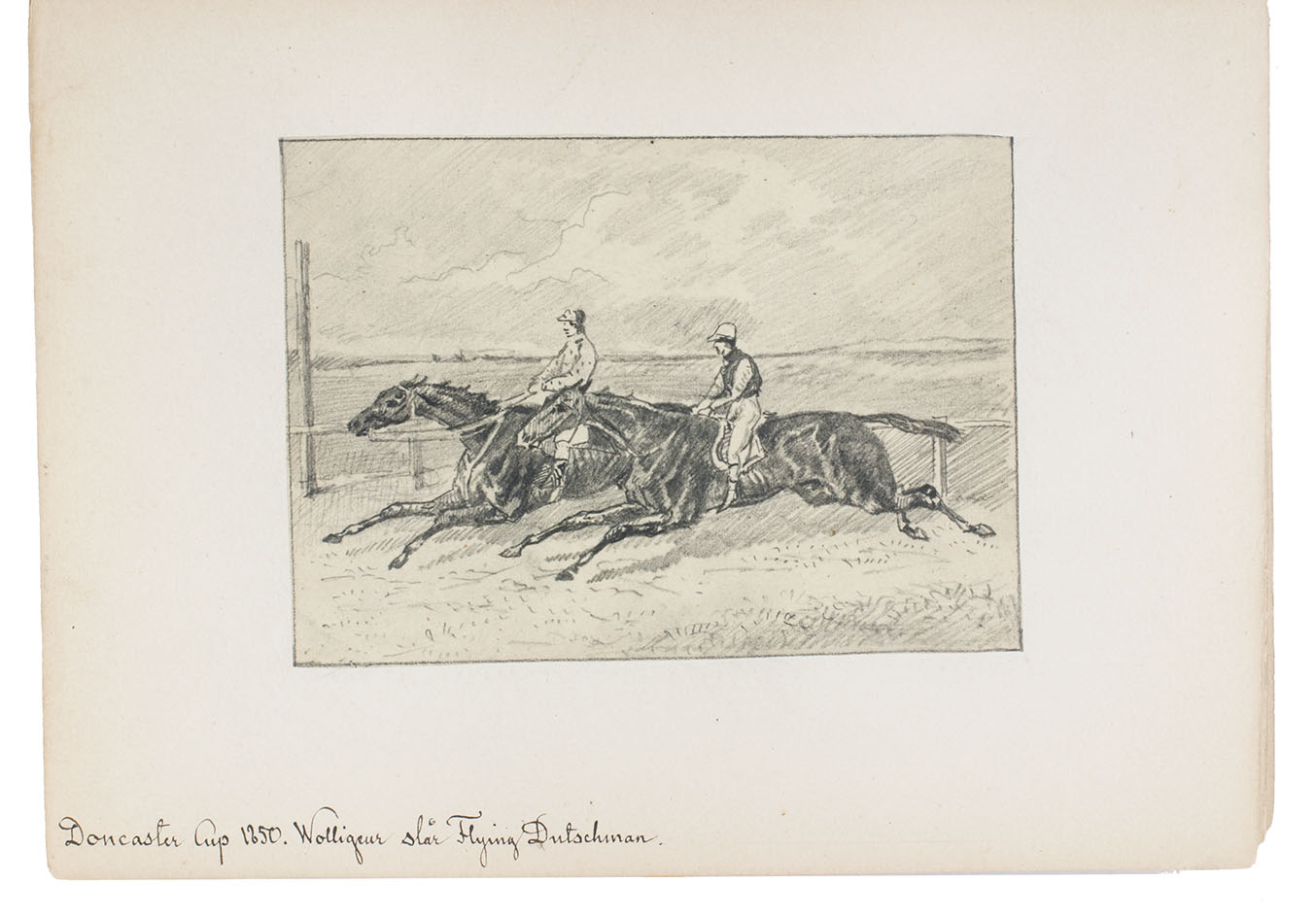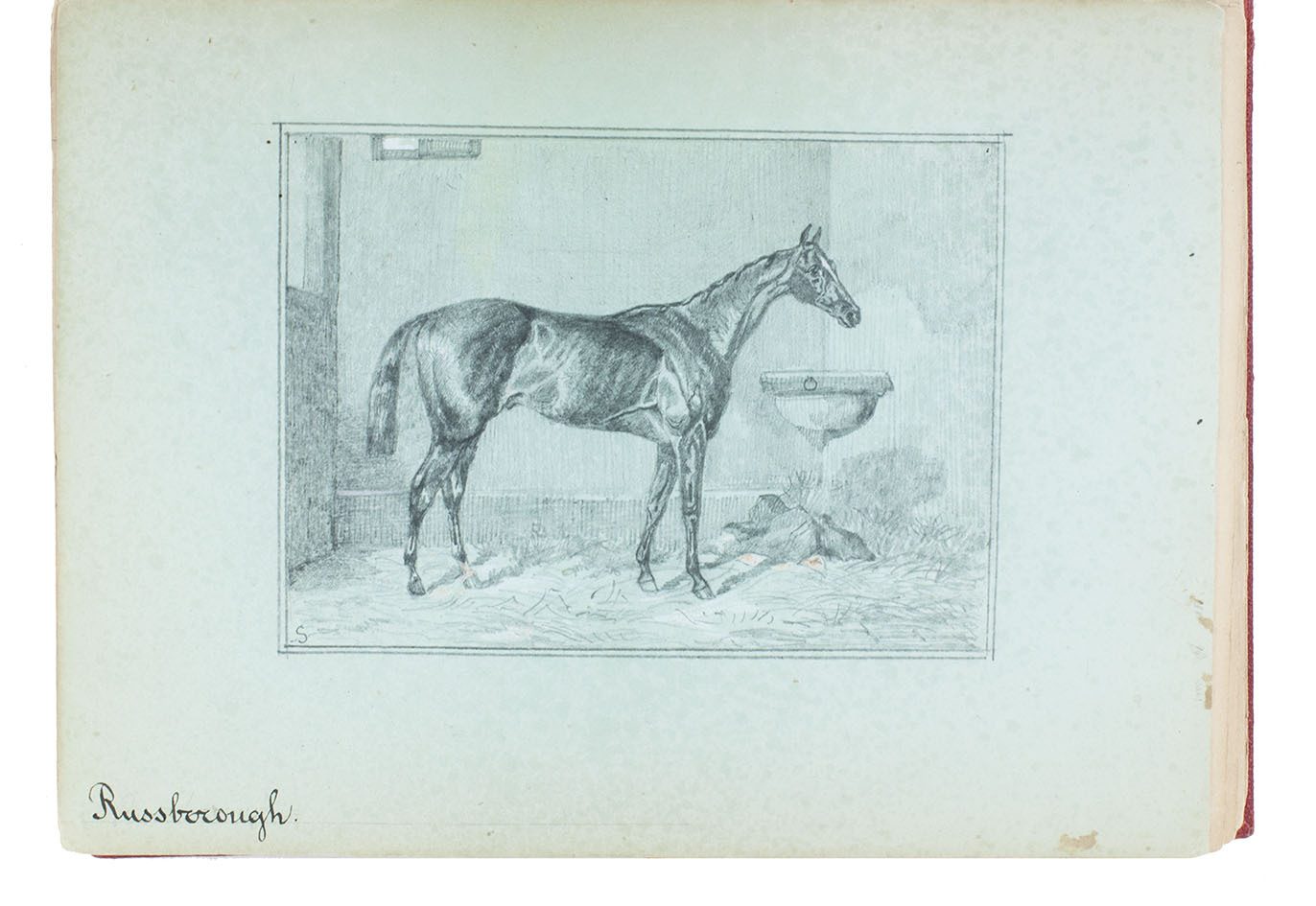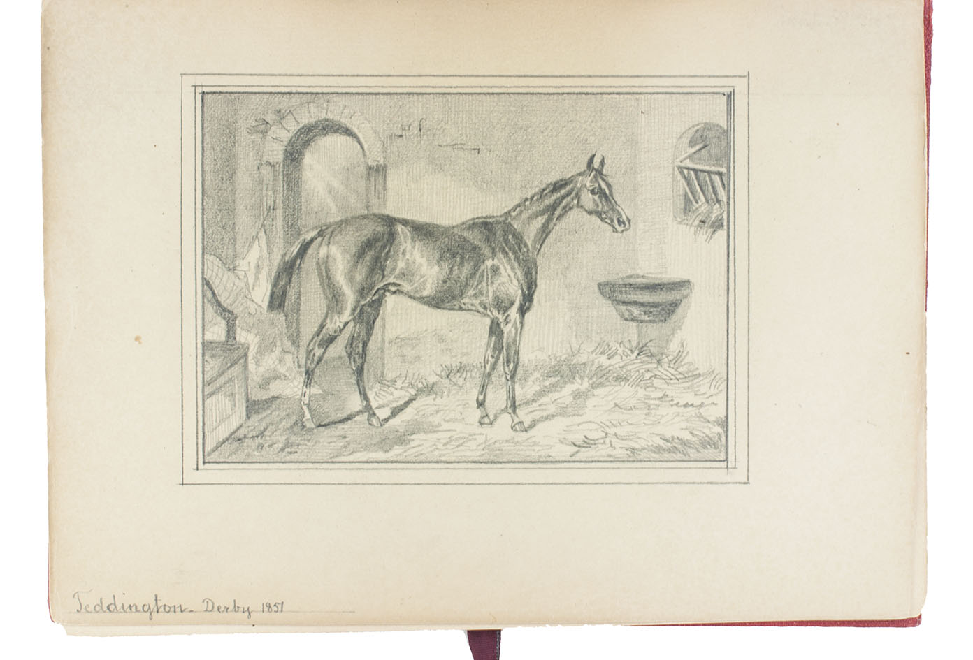 A collection of 36 pencil drawings of famous English thoroughbred race horses by at least three artists, including one signed "Harry Hall" and several others clearly based directly or indirectly on his paintings. Some horses appear in their stables or grounds, sometimes with a stable boy, groom or owner, others are shown carrying a jockey during a race at a track. The earliest horses shown include a beautiful pencil and ink-wash drawing of Camel (1822-1844), who raced from 1825 to 1827 and won the 1826 Port Stakes at Newmarket. He is better known as the sire of Touchstone (1831-1861), also shown, one of the most famous thoroughbreds of all time, who raced from 1833 to 1837.