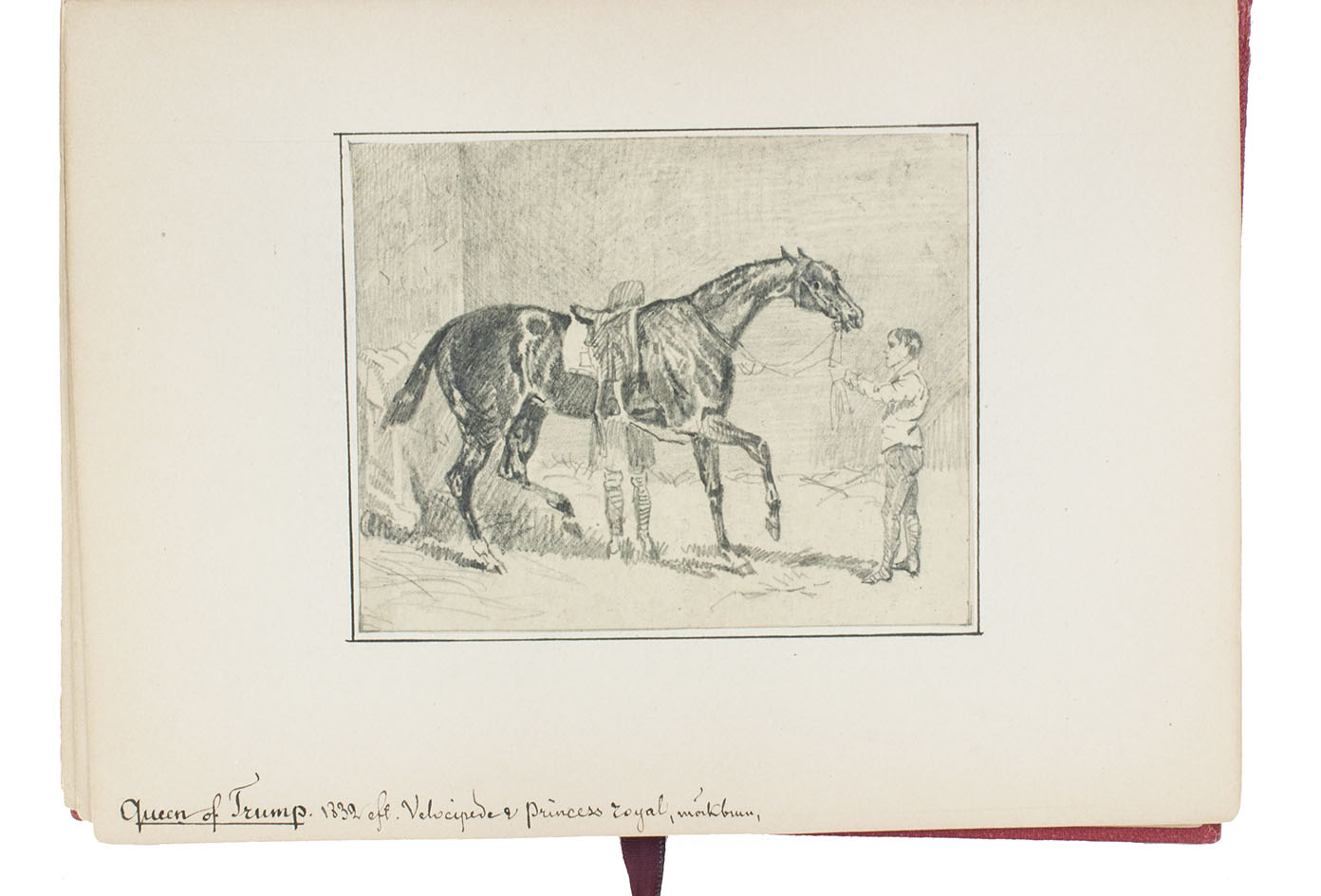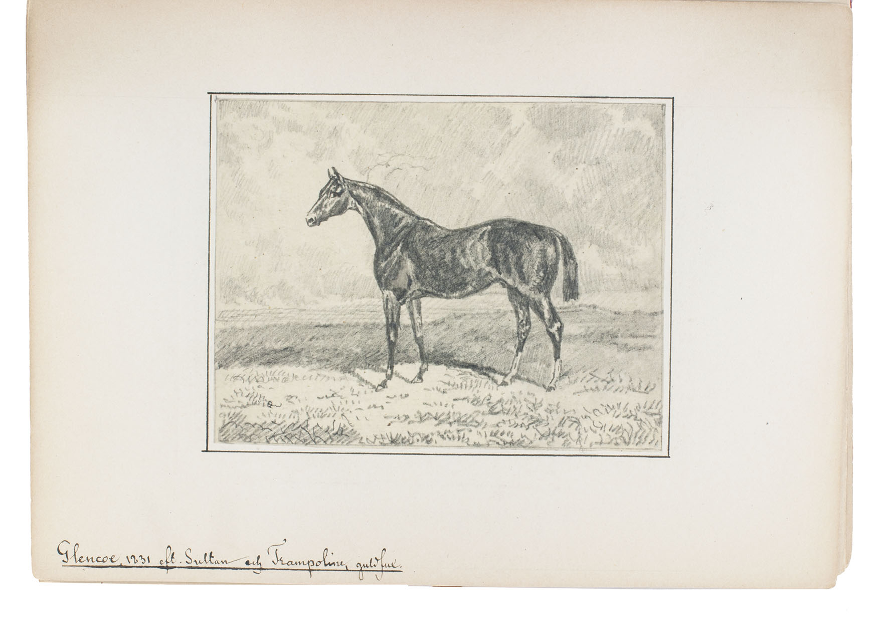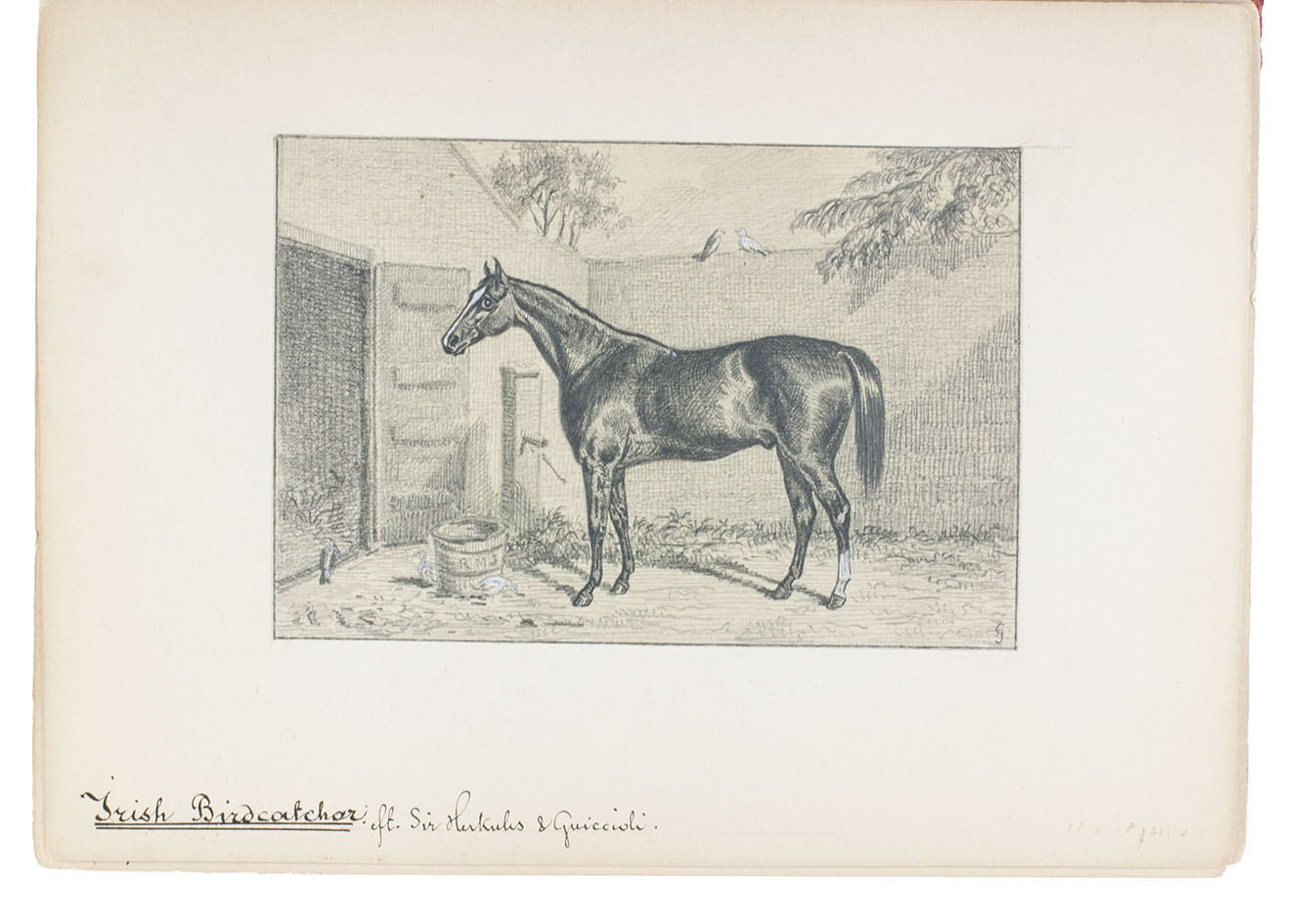 A collection of 36 pencil drawings of famous English thoroughbred race horses by at least three artists, including one signed "Harry Hall" and several others clearly based directly or indirectly on his paintings. Some horses appear in their stables or grounds, sometimes with a stable boy, groom or owner, others are shown carrying a jockey during a race at a track. The earliest horses shown include a beautiful pencil and ink-wash drawing of Camel (1822-1844), who raced from 1825 to 1827 and won the 1826 Port Stakes at Newmarket. He is better known as the sire of Touchstone (1831-1861), also shown, one of the most famous thoroughbreds of all time, who raced from 1833 to 1837.