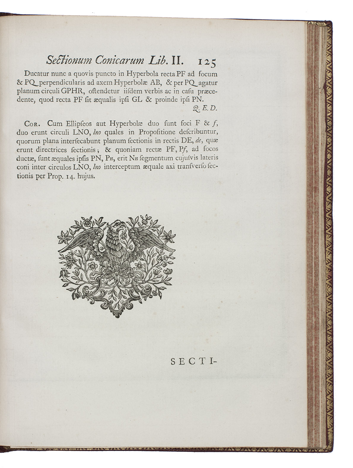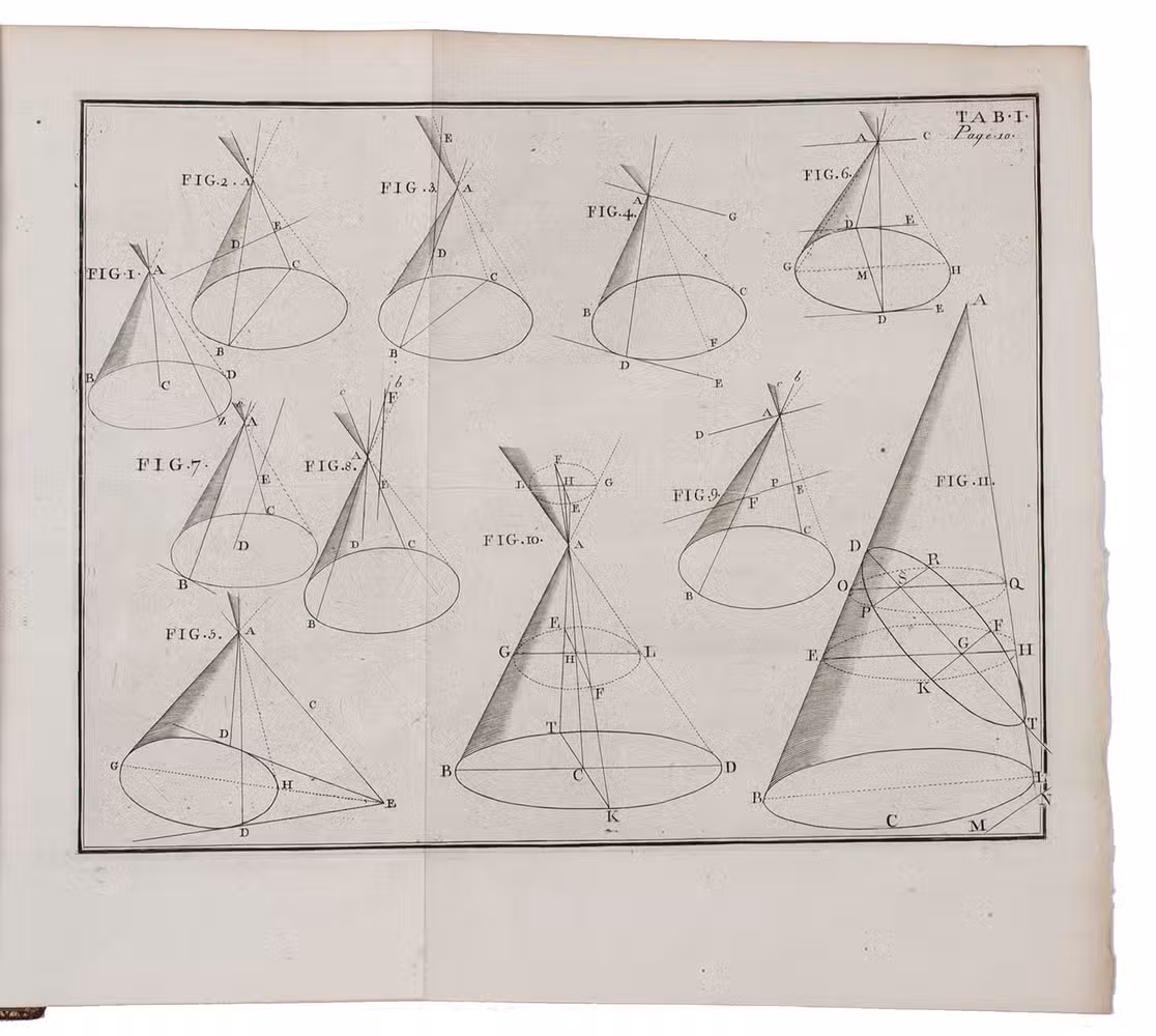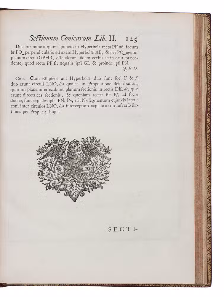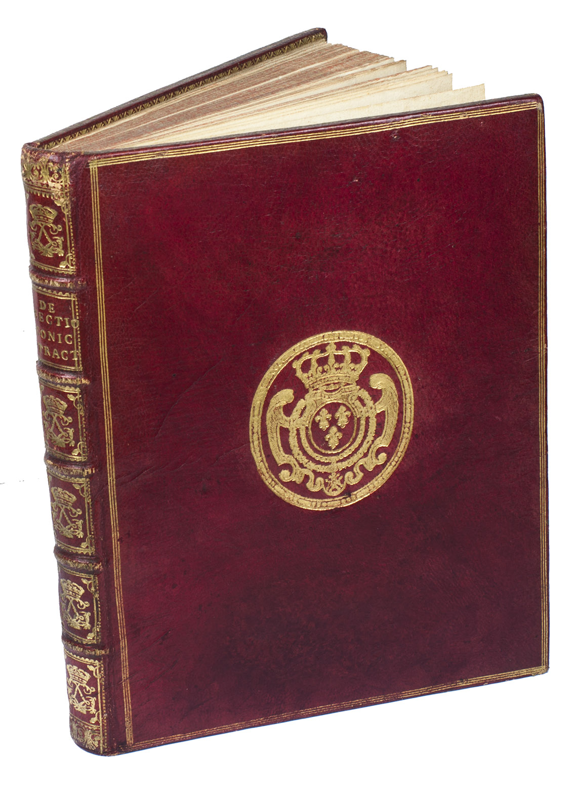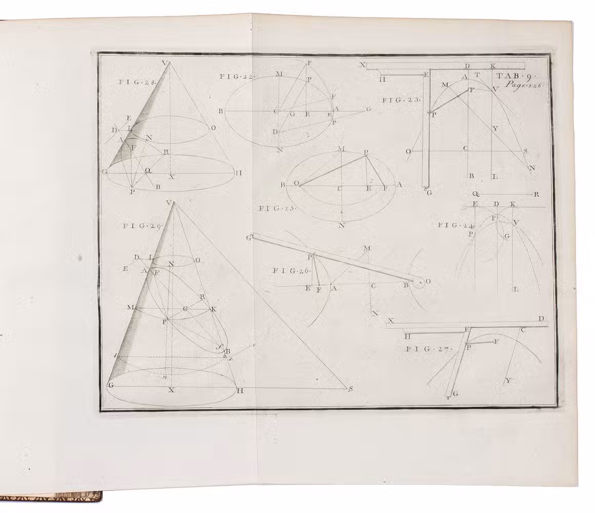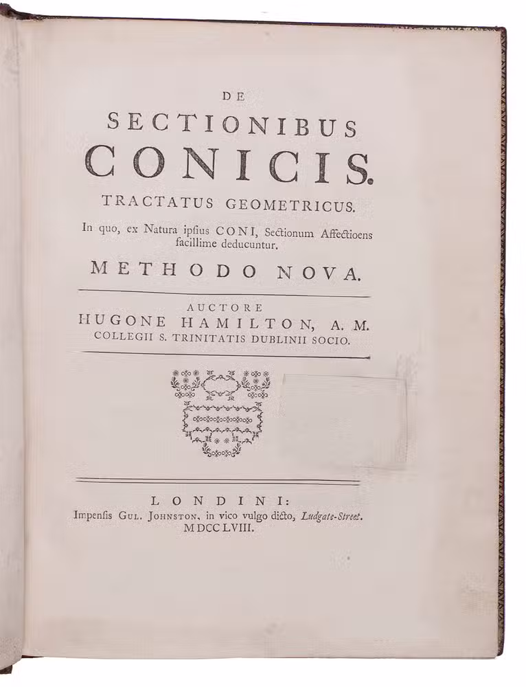 Splendid copy in contemporary red morocco, bound for the French King Louis XV, containing the first edition of a geometrical treatise on a new method of drawing and projecting conic sections (circles, ellipses, parabolas, hyperbolas). Hugh Hamilton (1729-1805), was a descendant of a Hugh Hamilton who settled in Ireland in the time of James I. He studied at Trinity College in Dublin, was appointed Erasmus Smith's professor of natural history in the University of Dublin in 1759, and was elected a fellow of the Royal Academy and member of the Irish Royal Academy. He later fulfilled several posts as vicar and dean and in 1799 he became bishop of Ossory. Hamilton published several learned treatises, of which the present was the most valued, as it contained several new theorems. The new analytical system of conic sections and the drawing of their projections is mainly taught by means of propositions and problems, all clearly illustrated on the large engraved plates. The present first edition was published simultaneously in both Dublin and in London. Although the book was reprinted several times it seems to be very rare today.