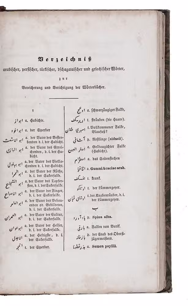 Hammer-Purgstall (1774-1856), a leading Austrian orientalist with an extensive knowledge of languages, took up a diplomatic position at the Austrian embassy in Constantinople in 1799 and remained in Turkey and the Middle East until 1807. He found the Turkish manuscript on falconry at the Biblioteca Ambrosiana in Milan in 1825 and the other two manuscripts at the Hofbibliothek in Vienna. He not only translated and edited the present texts but also contributed a 32-page introduction and a list of 63 works on the subject of falconry, from the 15th century to his own day. The book, printed in only 300 copies, has been largely overlooked in the literature on ornithology and Islamitica, but Schwerdt notes that it is "particularly important to lovers of falconry, its origin and history". It also provides insights into the Turkish language and Islamic culture.