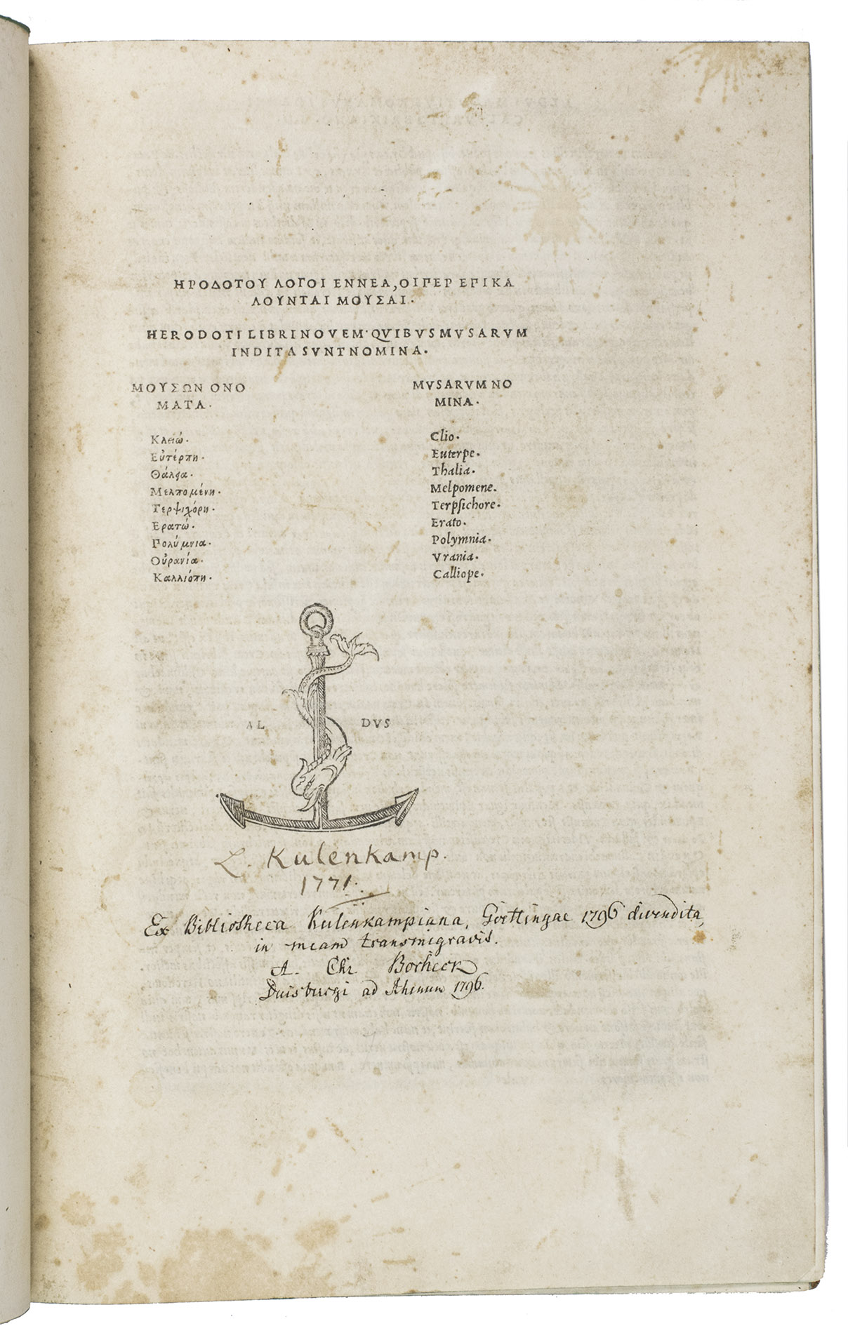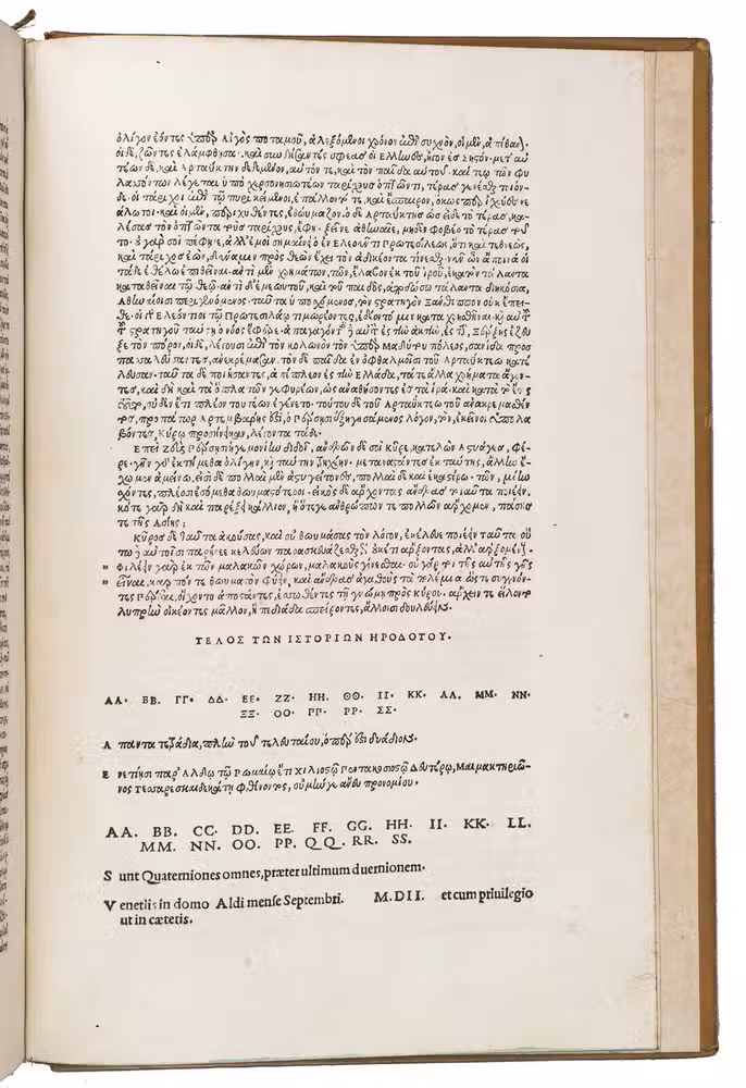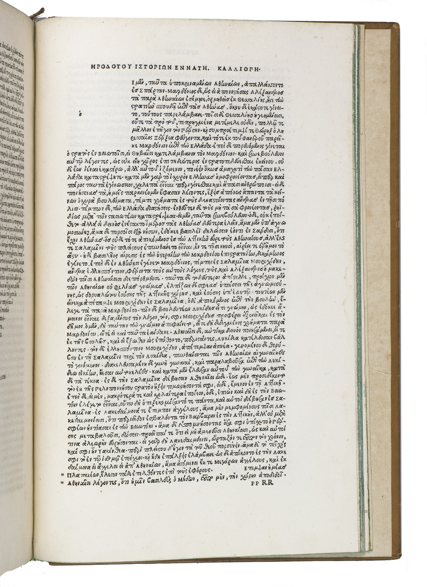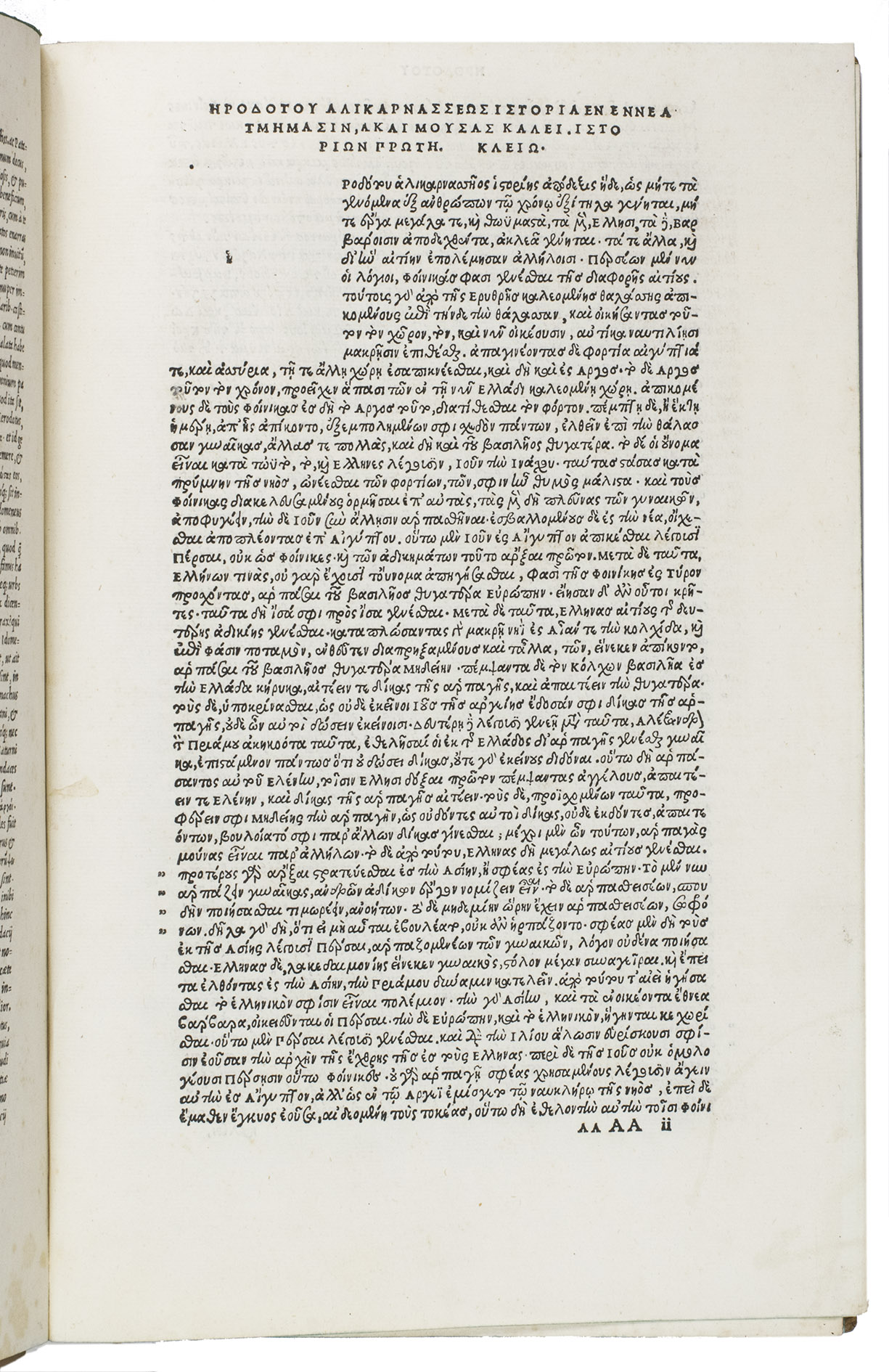 Splendid copy of the famous first edition of the original Greek text of the works of Herodotus (ca. 484 BCE-ca. 425 BCE), "the father of history," published and edited by Aldus Manutius at Venice on the basis of many manuscripts. By promoting Herodotus as a key to ancient history and society and providing a reliable text, it set the stage for his popularity in the 16th century. It covers the growth of the Persian Empire, the history of Egypt, Persian incursions into Greece, the defeat of the Persians in 490 BCE, the Persian king Xerxes's attempt to avenge the Persian defeat and their defeat once again in 479 BCE. But perhaps of greatest interest are the strange and fantastic tales and anecdotes, including the circumnavigation of Africa.