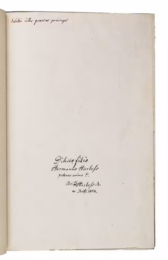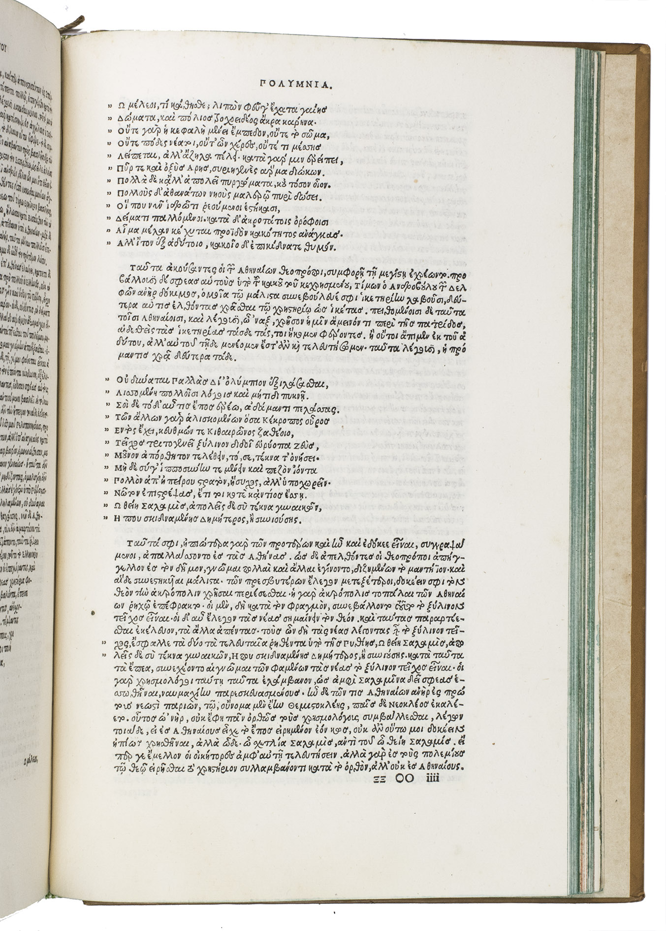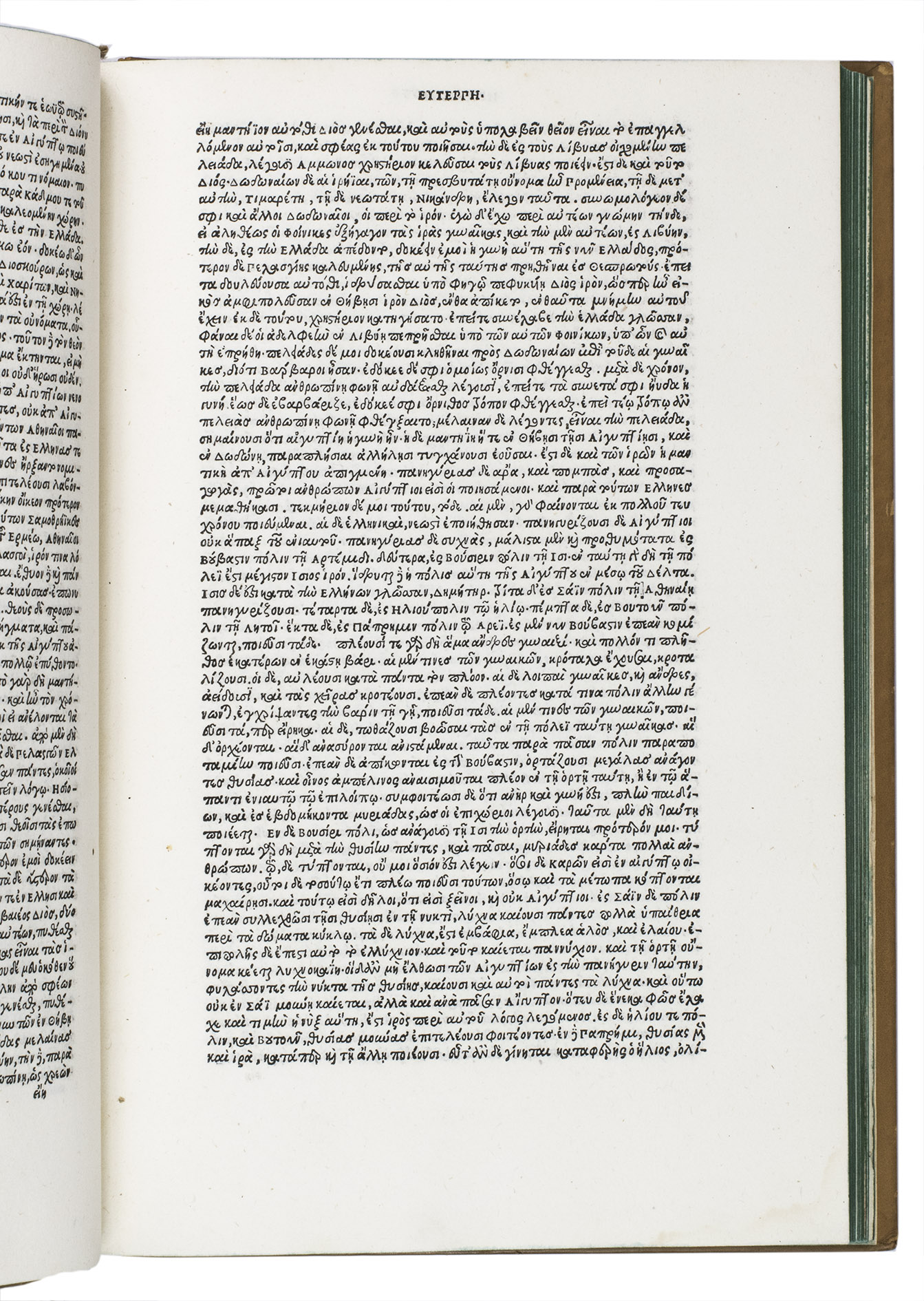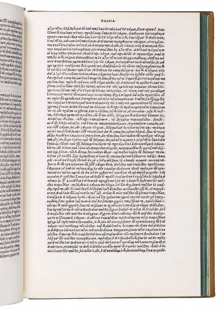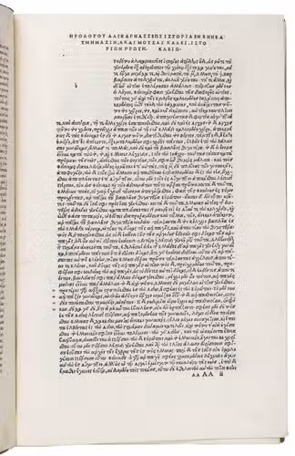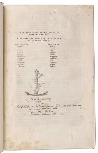 Splendid copy of the famous first edition of the original Greek text of the works of Herodotus (ca. 484 BCE-ca. 425 BCE), "the father of history," published and edited by Aldus Manutius at Venice on the basis of many manuscripts. By promoting Herodotus as a key to ancient history and society and providing a reliable text, it set the stage for his popularity in the 16th century. It covers the growth of the Persian Empire, the history of Egypt, Persian incursions into Greece, the defeat of the Persians in 490 BCE, the Persian king Xerxes's attempt to avenge the Persian defeat and their defeat once again in 479 BCE. But perhaps of greatest interest are the strange and fantastic tales and anecdotes, including the circumnavigation of Africa.